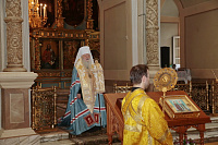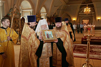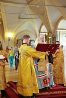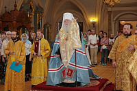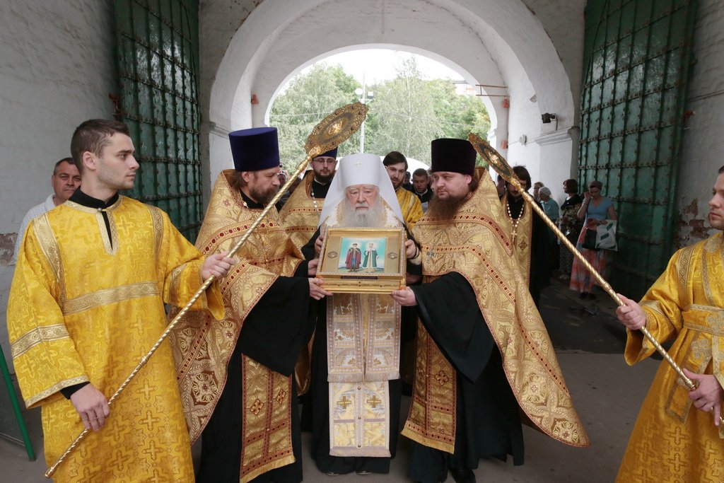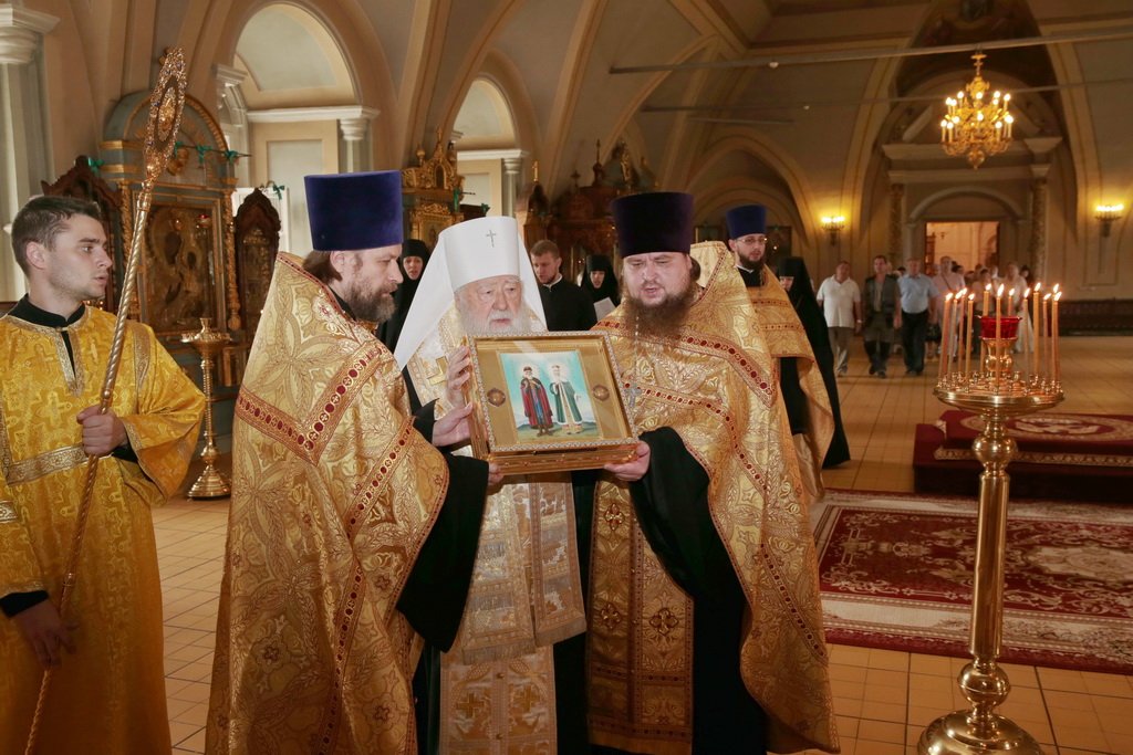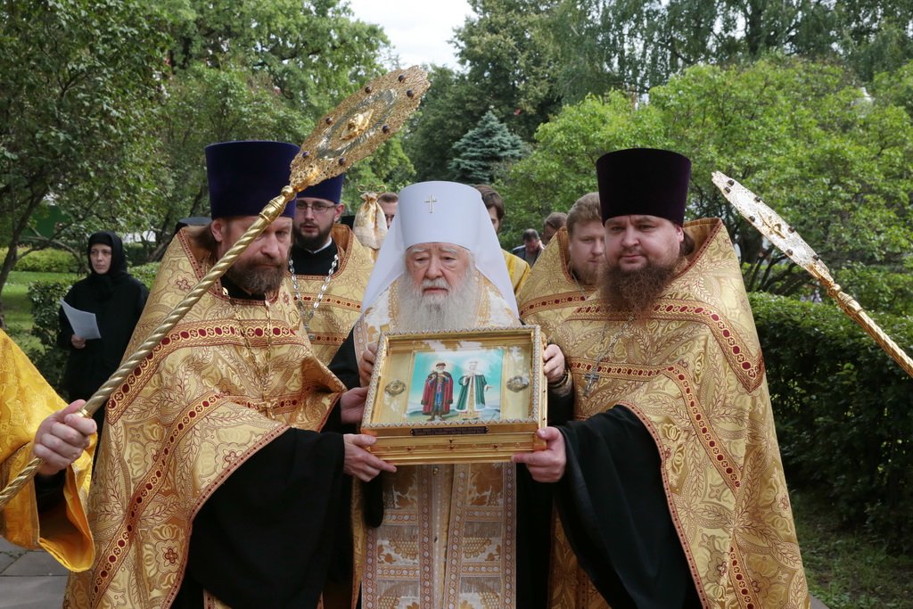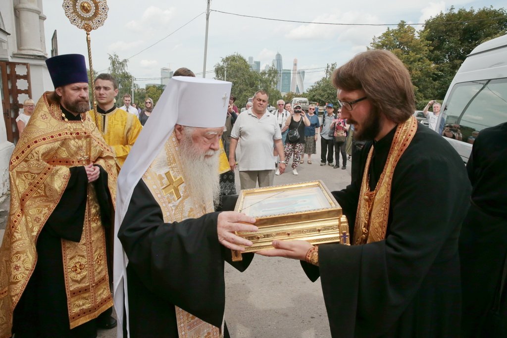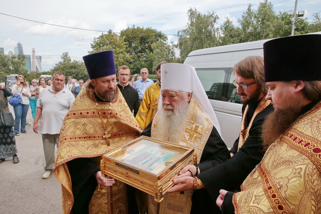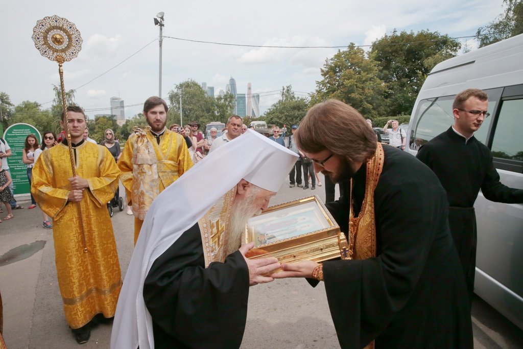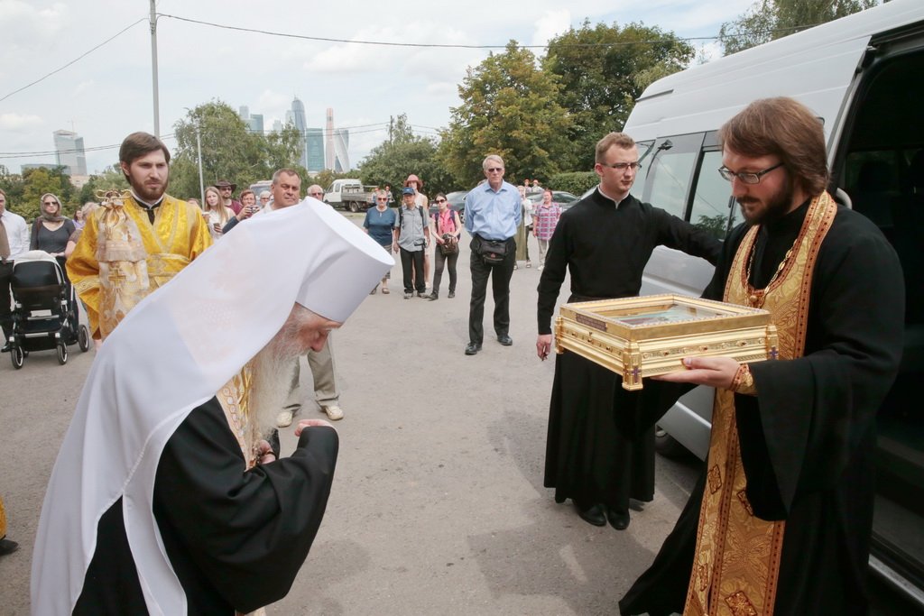 У врат обители святыню встретили митрополит Ювеналий, духовенство, игумения Новодевичьего монастыря Маргарита (Феоктистова) с сестрами и паломники, прибывшие поклониться мощам. После встречи Владыка митрополит совершил молебен князю Владимиру и княгине Ольге в Успенском храме, где был установлен ковчег с частицами их мощей. Перед молебном Владыка митрополит обратился к собравшимся с архипастырским словом: