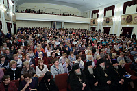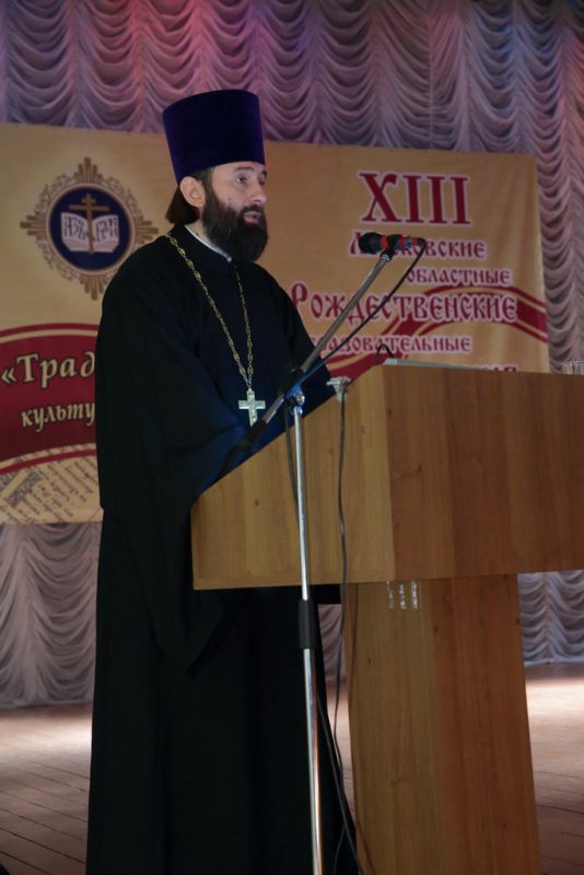 «В этом году мы вспоминаем 1000-летний юбилей со дня блаженной кончины Крестителя Руси — святого равноапостольного князя Владимира. В эти дни мы завершаем празднование данного юбилея, но, безусловно, в наших сердцах остается благодатный след. Мне кажется, что сегодня очень подходящий день подобрали для открытия Рождественских чтений, потому что сегодня заговенье на Рождественский пост. Нам предстоит многодневное поприще воздержания в ожидании спасительного праздника Рождества Христова. Если бы меня спросили: „Какое у Вас самое яркое и сильное впечатление об этой встрече?“, то я бы не задумываясь сказал, что это начало нашего заседания, когда мы на этом месте видели детей — учащихся воскресных школ, и меня до глубины души тронули слова исполнявшегося ими песнопения: „Нам в России без Бога не жить!“. Я, как пожилой человек, вспоминаю свои годы обучения в школе, то время, когда между школой и Церковью стояла огромная, непреодолимая идеологическая стена, и я считаю, это чудо, что она рухнула. Я никогда не забуду, с кем я в Московской области налаживал сотрудничество между Церковью и школой. Думаю, вы все понимаете, что я имею ввиду Лидию Николаевну, которая тогда была министром образования Московской области, с ее стороны это был смелый шаг, но благословенный, удачный, потому что сегодня мы уже встречаемся как братья и сестры, в духовном смысле этих слов. Нас ничего не разделяет, но объединяет общая забота о будущем России и подрастающем поколении. Об этих задачах мы сегодня много говорили. Я признателен Марине Борисовне, нынешнему министру образования Московской области, за то, что она сотрудничает с нами, и сегодняшняя встреча -лишнее доказательство того, что мы на верном пути. Конечно, административные меры хороши, но нам нужна и духовная основа. И в связи с этим я вновь и вновь хотел бы поблагодарить Людмилу Леонидовну Шевченко за то, что она усердно, я хотел бы подчеркнуть, мужественно все эти годы помогала нам закладывать прочную духовную основу, фундамент для духовного просвещения. Не могу не поблагодарить и Олега Борисовича, который уже не первый раз нас, представителей Церкви, так гостеприимно встречает и помогает нам осуществлять наше служение. Сегодня были прекрасные доклады, и я хочу от души поблагодарить всех, никого не выделяя, за их вклад в нашу работу и дискуссию. Мне хотелось бы немного пофилософствовать и сказать о том, что, как известно из истории христианства, у Спасителя было всего двенадцать учеников, а они в результате своей вдохновенной проповеди покорили весь мир Христу. Сегодня в нашем зале семьсот таких „апостолов“, и я очень надеюсь, что каждый из вас будет нести свое просветительское служение, неся в своем сердце любовь к Родине и ученикам. Мне хочется от души пожелать каждому из вас успехов в этом и призвать на вашу жизнь и на ваши труды Божие благословение».