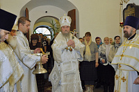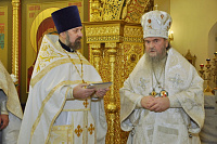 По окончании богослужения архиепископ Григорий обратился к собравшимся с приветственным словом и вручил церковные награды особо потрудившимся в деле созидания храма. Настоятель прихода священник Владимир Крюков и глава сельского поселения Ильинское