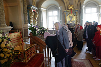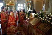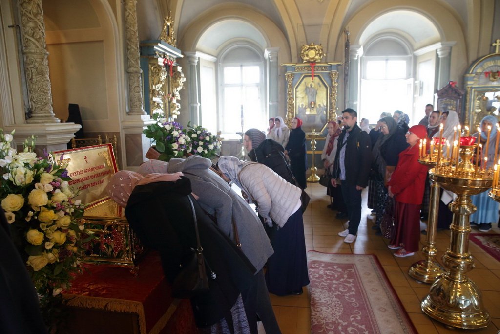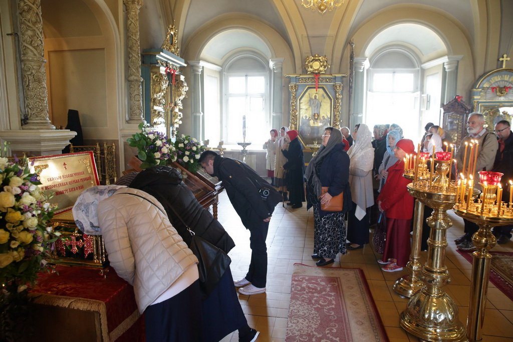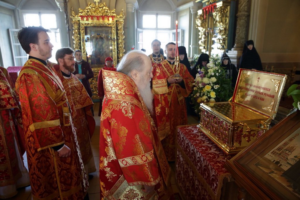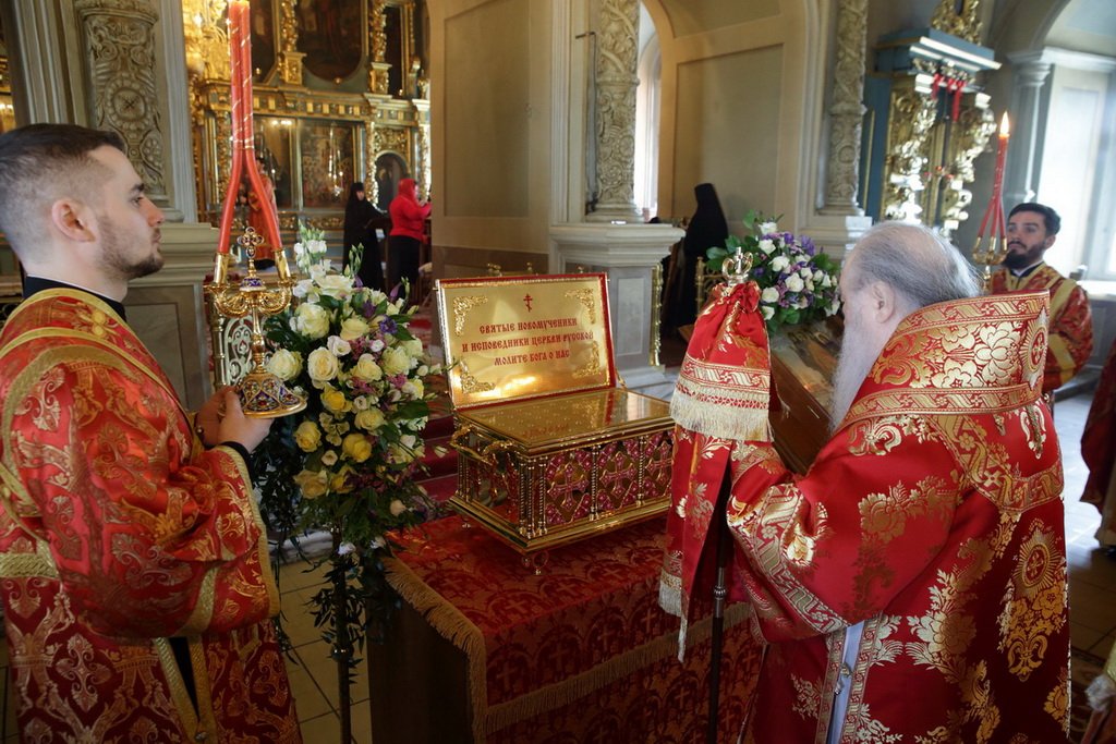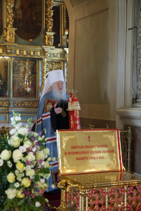 По окончании богослужения митрополит Ювеналий обратился к духовенству и молящимся с архипастырским словом: «Дорогие братья и сестры! В этом году исполняется 100 лет со дня начала гонений на Русскую Православную Церковь в нашей стране. Священный Синод принял решение в течение всего года особо прославлять новомучеников и исповедников нашей Церкви. По благословению Святейшего Патриарха изготовлено пять ковчегов, в которые вложены мощи новомучеников Церкви Русской. Сегодня мы имеем счастье перед этим ковчегом молиться новомученикам и испрашивать их благословения на нашу жизнь и служение. Ныне мы отмечаем праздник новомучеников нашей святой обители. Отец Александр подробно говорил об их подвиге. Мы испрашиваем их благословения, чтобы их молитвами вдохновлялись и наши насельницы обители в подвигах монашеского делания, чтобы наши прихожане возгорались любовью к Богу, видя несокрушимую веру, преданность Святой Церкви новомучеников Новодевичьего монастыря, сами укреплялись в вере и добрых делах. Пусть Господь предстательством новомучеников и исповедников Церкви Русской поможет каждому из нас в несении нашего жизненного креста и сподобит Царствия Божия. Аминь. Христос воскресе!»