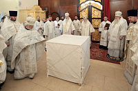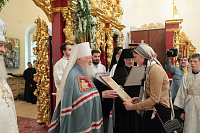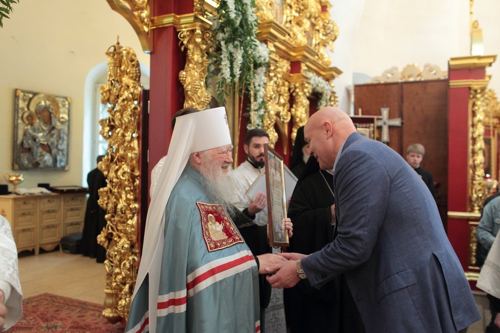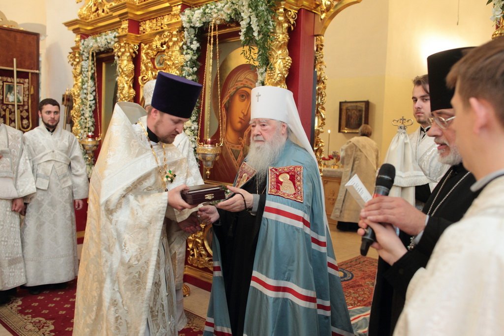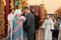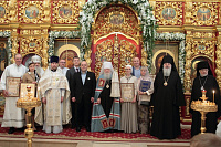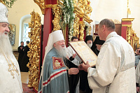 Затем Владыка Ювеналий вручил потрудившимся в деле восстановления храма церковные награды: священник Александр Сидоров был удостоен ордена прп. Серафима Саровского III степени,