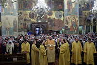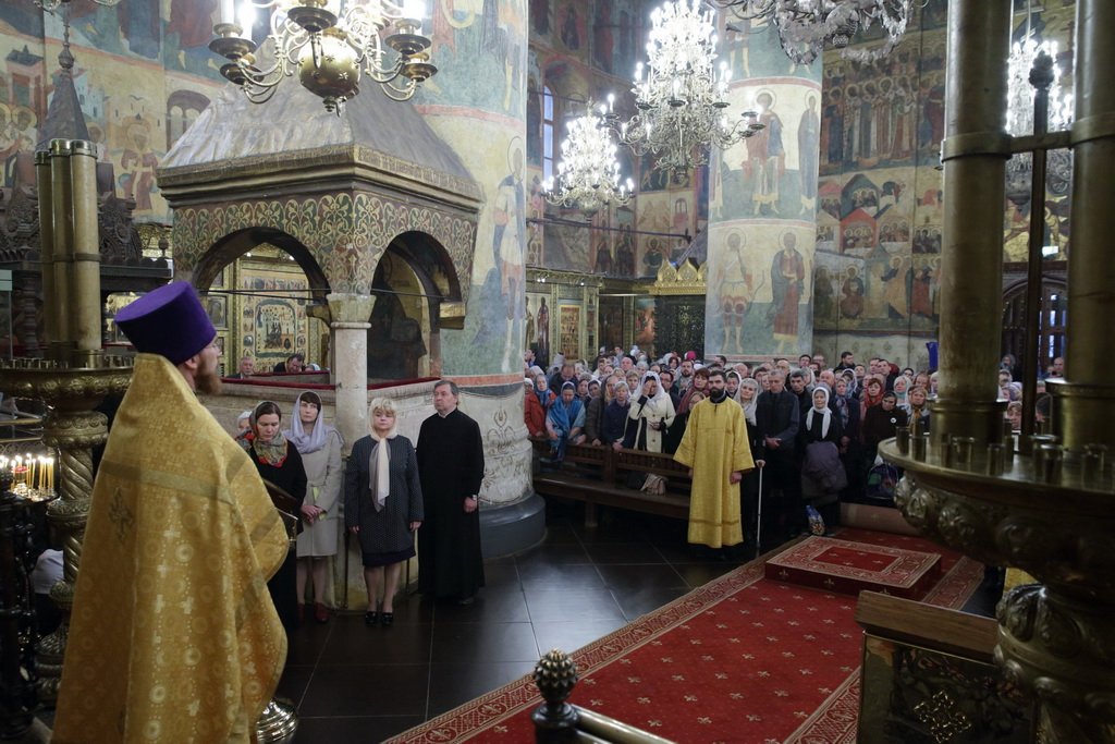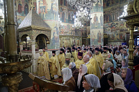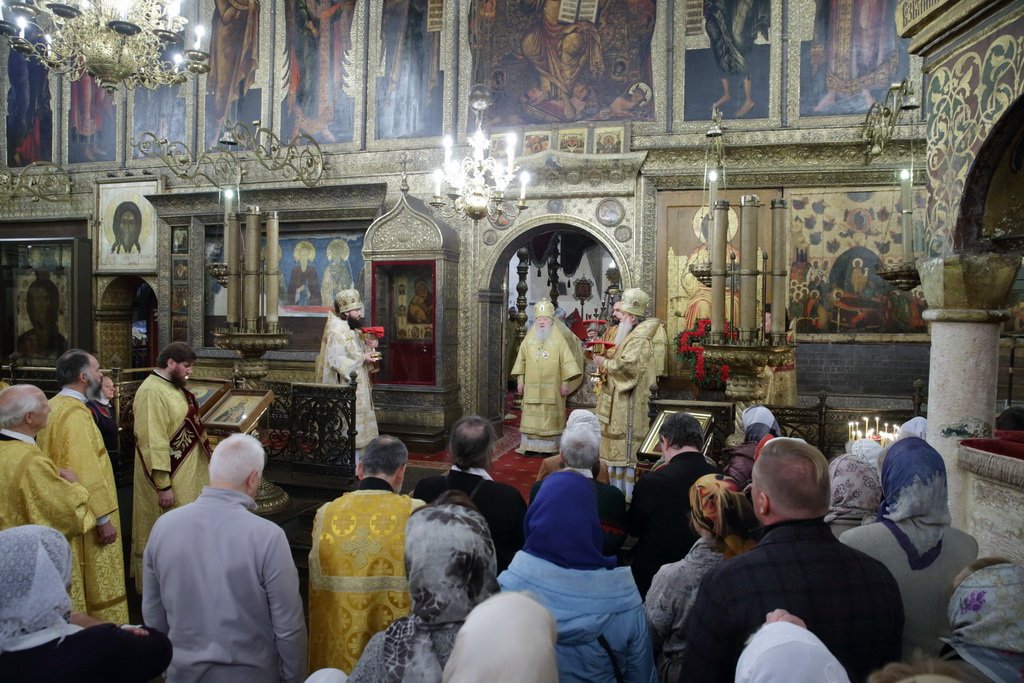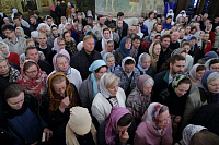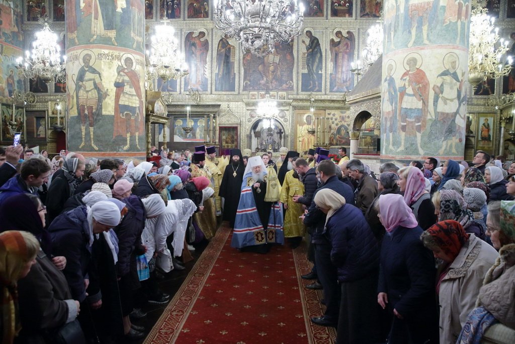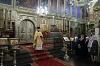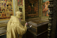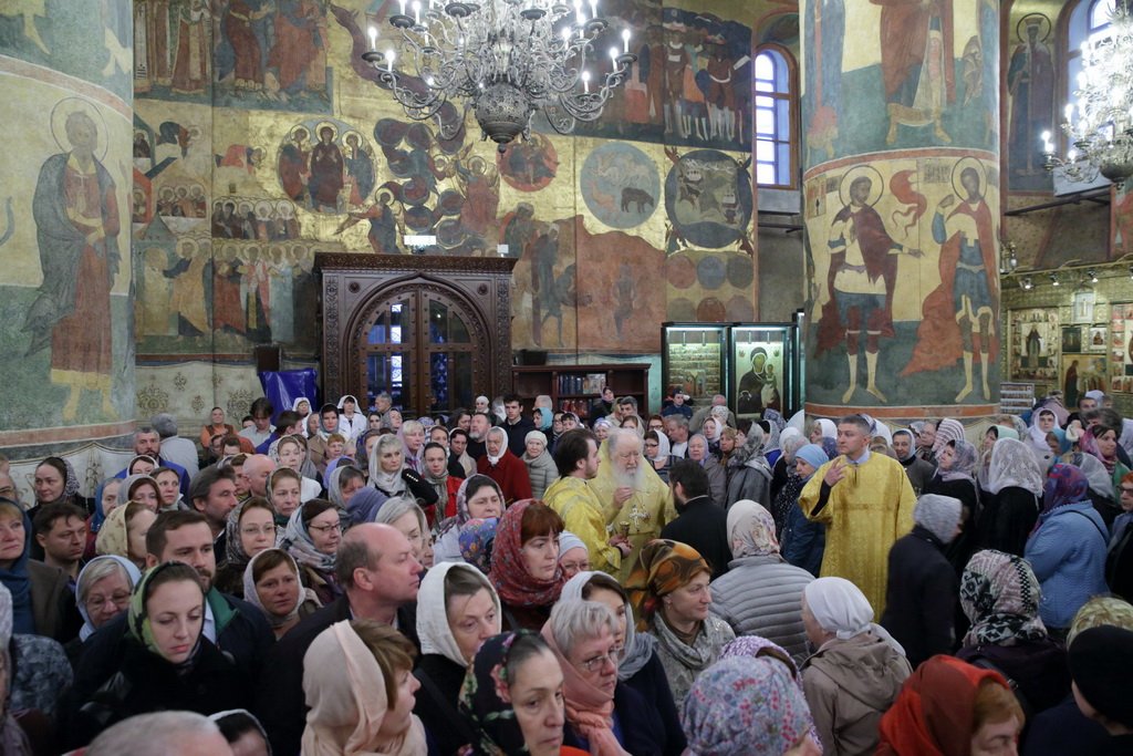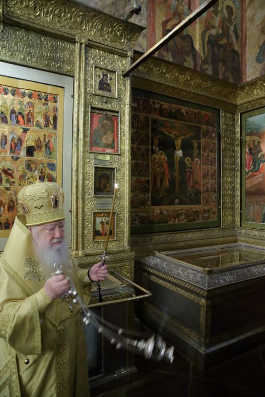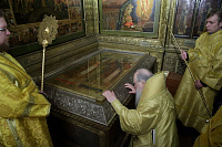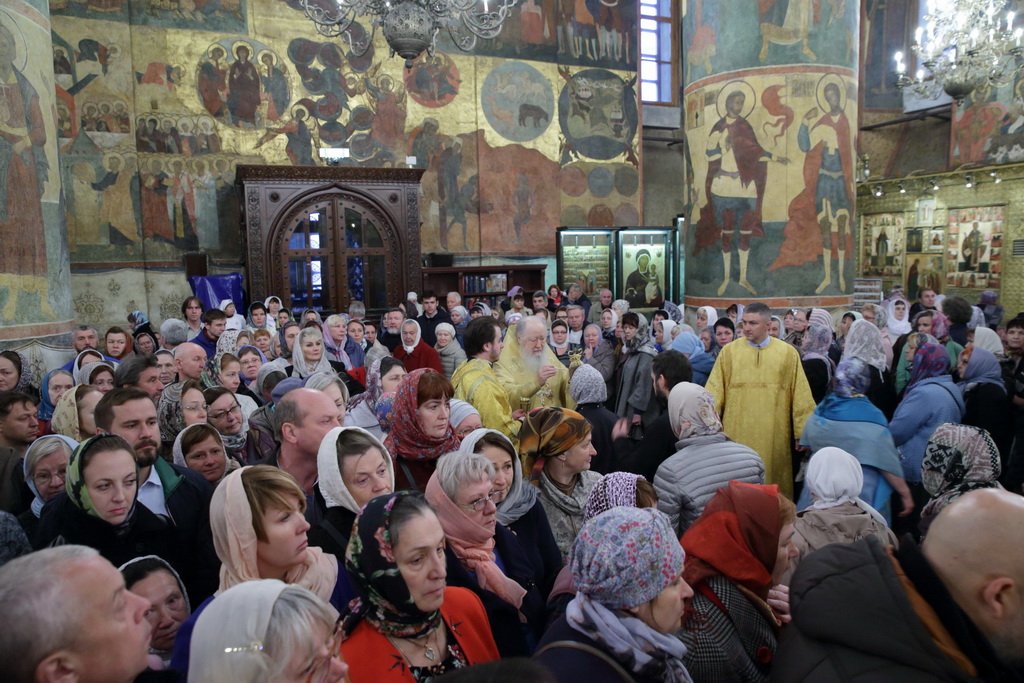 По окончании Божественной литургии было совершено поклонение Кресту и славление перед мощами святителя Киприана, Митрополита Московского и всея Руси.