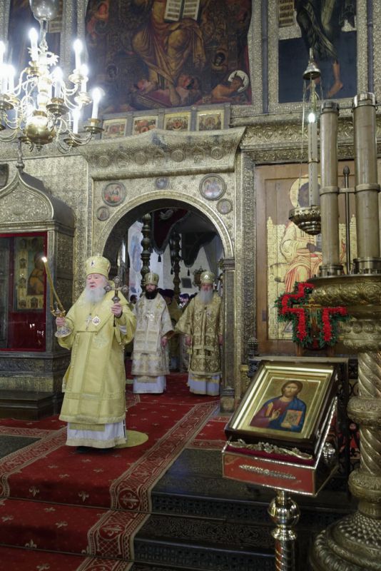 Затем Его Высокопреосвященство обратился к духовенству и молящимся с архипастырским словом: «Возлюбленные братья архипастыри, дорогой отец-протопресвитер, всечестные отцы, братья и сестры! Нам выпала сегодня огромная радость, по благословению Святейшего Патриарха, совершить здесь Божественную литургию в день памяти одного из святых подвижников — святителя Московского, Киевского и всея Руси Киприана. Он скончался в 1406 году, и это напоминает нам о том, какие подвижники, святители управляли Церковью издревле на Руси. Прошло много времени, а Церковь хранит о нем память, и он является нашим небесным заступником, молитвенником и покровителем. Мы счастливы, что у его могилы, там, где похоронены и другие святители Московские, мы сегодня совершили нашу молитву. Мы продолжаем еще празднование в честь Воздвижения Честнаго и Животворящего Креста Господня. Это напоминает нам о крестном страдании Господа нашего Иисуса Христа, Который ради нас и ради нашего спасения принял крестную смерть. Нас утешает, что из Святого Евангелия мы знаем, как милосерд к роду человеческому Господь, как Он ждет покаяния каждого кающегося грешника. На примере благоразумного разбойника, который на последнем издыхании обратил свой покаянный взор ко Спасителю и услышал: „Истинно говорю тебе, ныне же будешь со Мною в раю“ (Лк. 23:43). Это, братья и сестры, великое для нас утешение и надежда в жизни. Не нужно отчаиваться из-за нашего греховного состояния, но нужно иметь покаяние в надежде, что Господь Милосердный по Своей любви, зная нашу слабую человеческую природу, простит нас, помилует и сподобит Царствия Небесного.