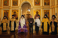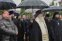 В 11 часов был совершен молебен прмц. Елисавете. Преосвященному Роману сослужили настоятель Николо-Берлюковского монастыря игумен Евмений (Лагутин) с братией монастыря и благочинный церквей Богородского церковного округа протоиерей Марк Ермолаев. На богослужении молились председатель Императорского Православного Палестинского общества С.В. Степашин, член Совета Федерации Попов, председатель наблюдательного совета Елисаветинско-Сергиевского просветительского общества А.В. Громова, председатель наблюдательного совета телеканала «Царьград ТВ» Л.П. Решетников, глава городского округа «Звездный городок», герой России В.И. Токарев, глава сельского поселения «Ямкинское» Ногинского района Е.А. Бельская, руководитель проекта «Аллея Российской славы» М.Л. Сердюков, главный редактор интернет-портала «Русская народная линия» писатель А.Д. Степанов, историк П.В. Мультатули. В приветственном слове Владыка Роман подчеркнул важность события, которое совершается в канун дня рождения преподобномученицы Елисаветы, и поблагодарил всех, кто принял участие в сооружении и установке памятника.