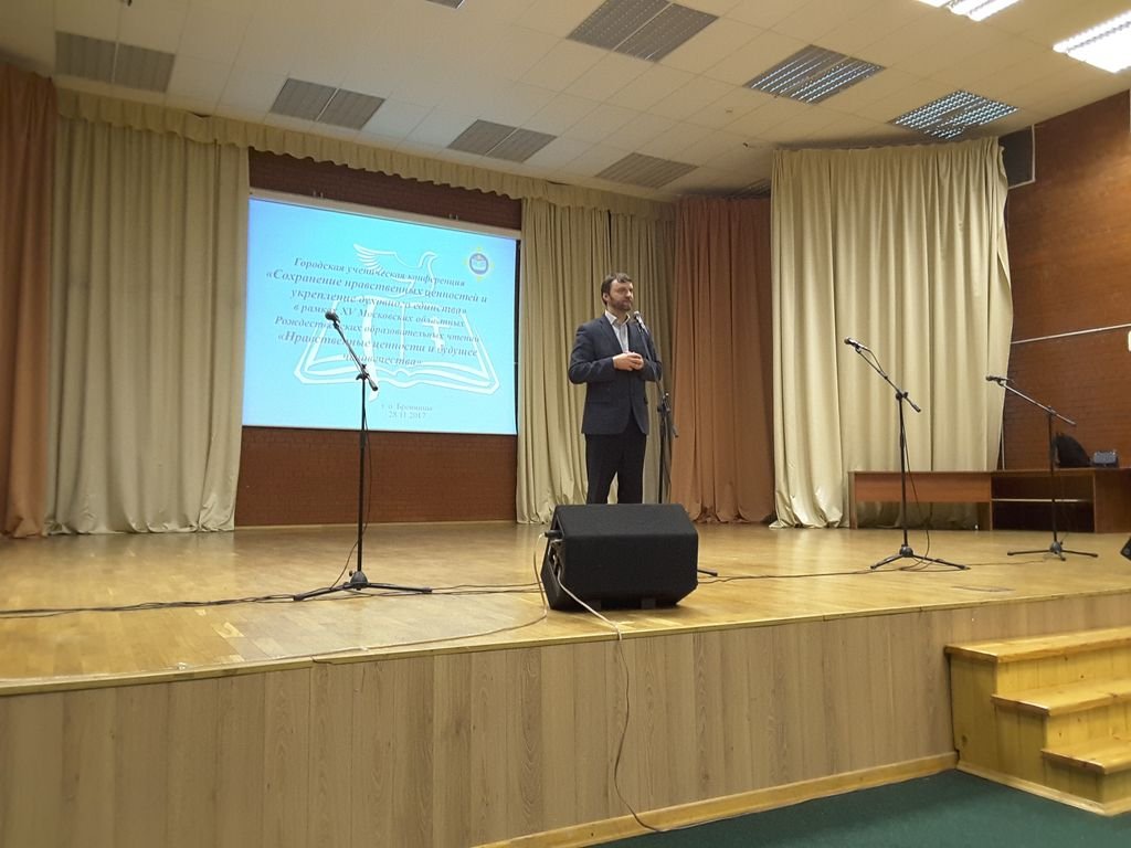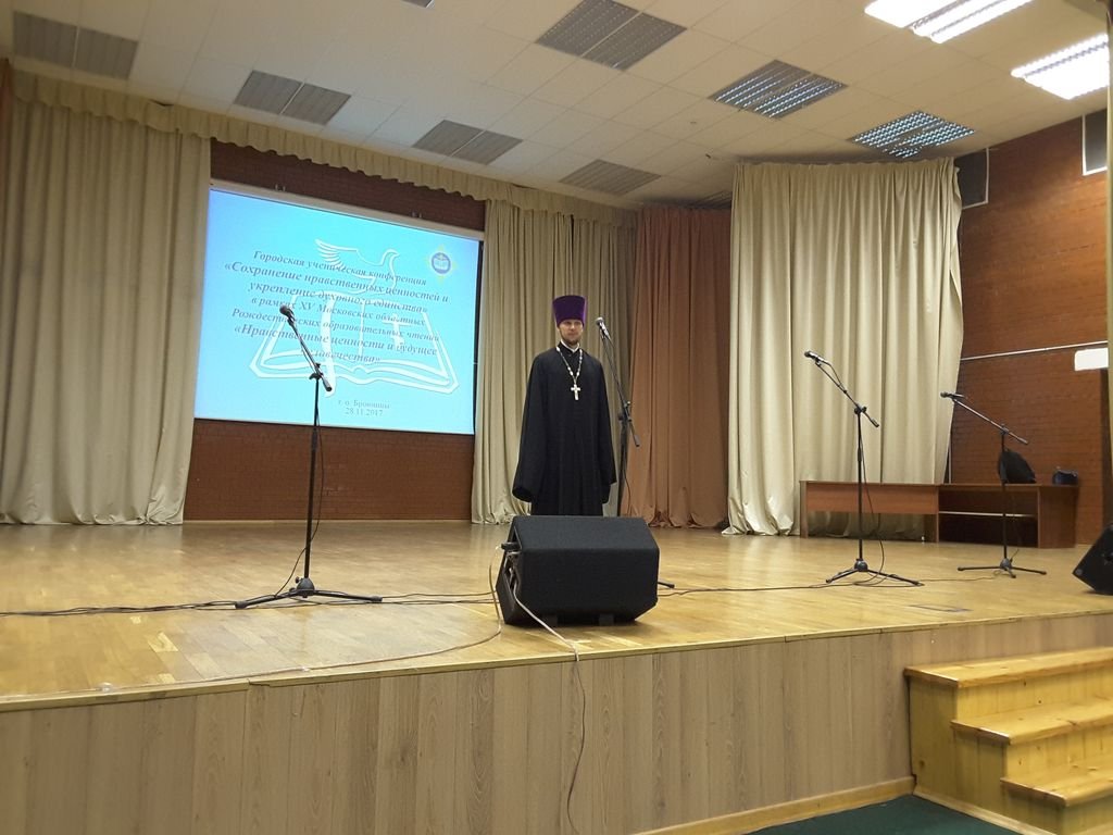 28 ноября в Бронницком благочинии состоялось открытие Рождественских образовательных чтений, посвященных теме «Нравственные ценности и будущее человечества». В городской гимназии имени А.С. Пушкина прошла учительская конференция «Сохранение нравственных ценностей и укрепление духовного единства». Почетными гостями собрания стали глава городского округа Бронницы В.В. Неволин и благочинный священник Сергий Себелев. На мероприятии присутствовали священнослужители, педагоги, представители молодежных и общественных организаций, учащиеся.