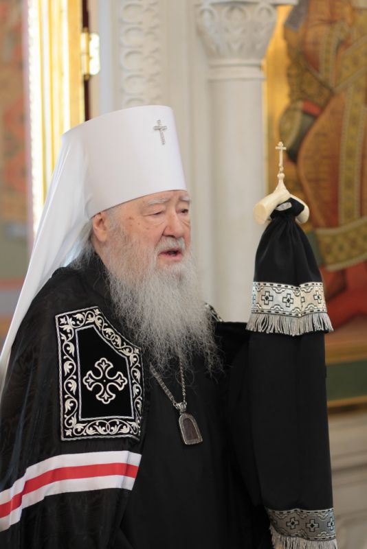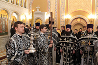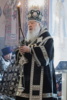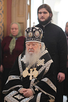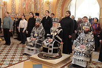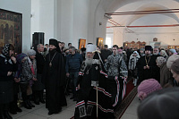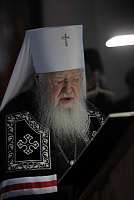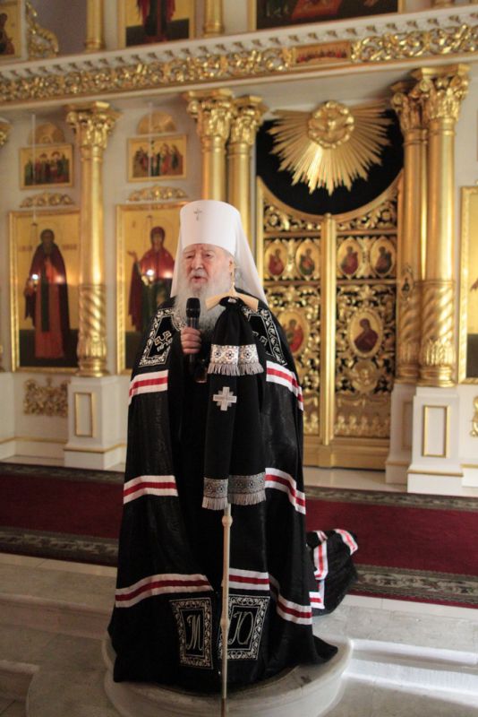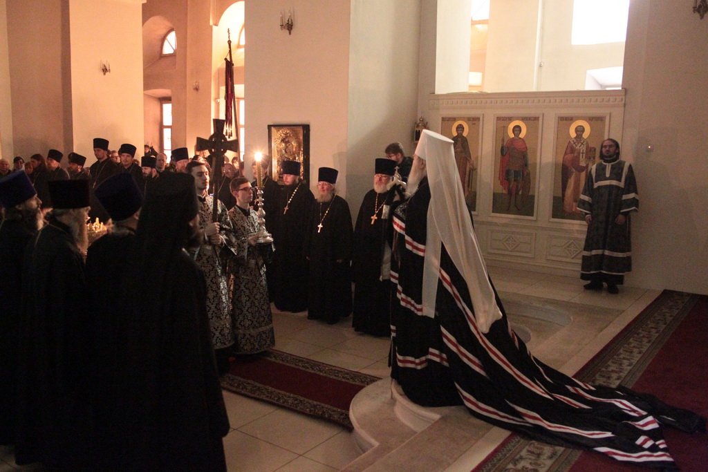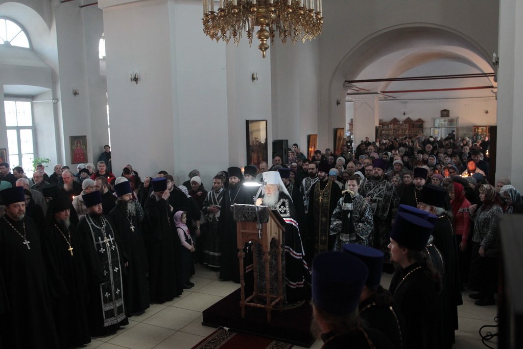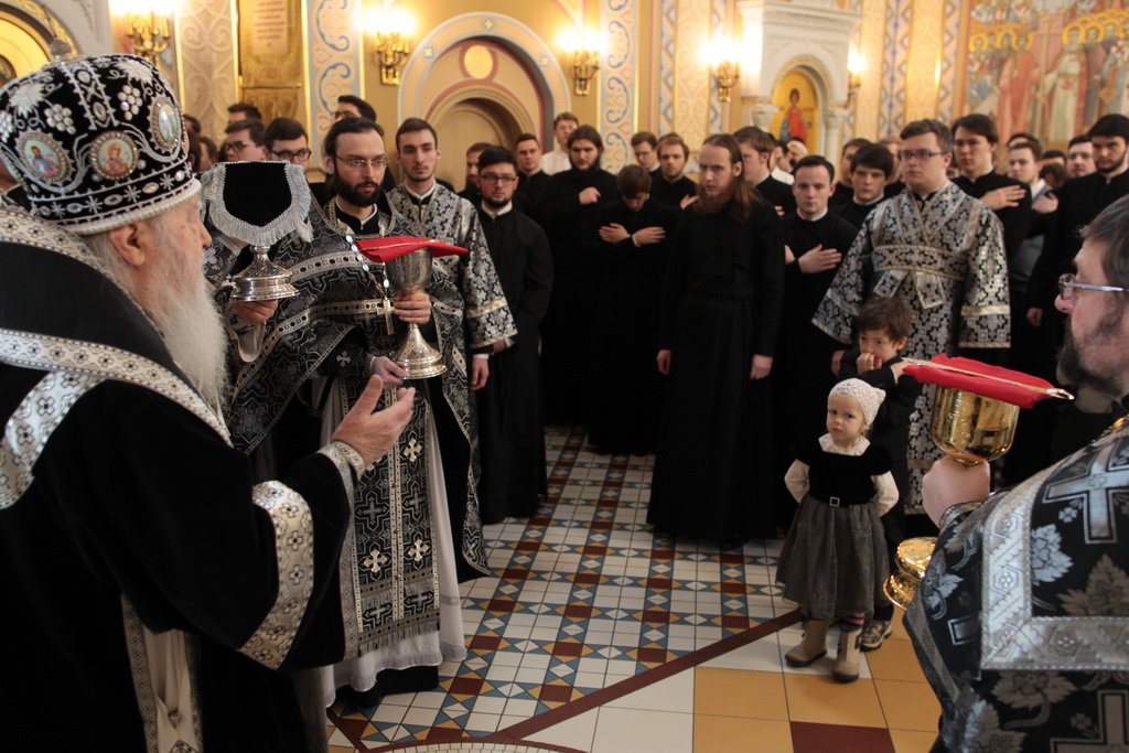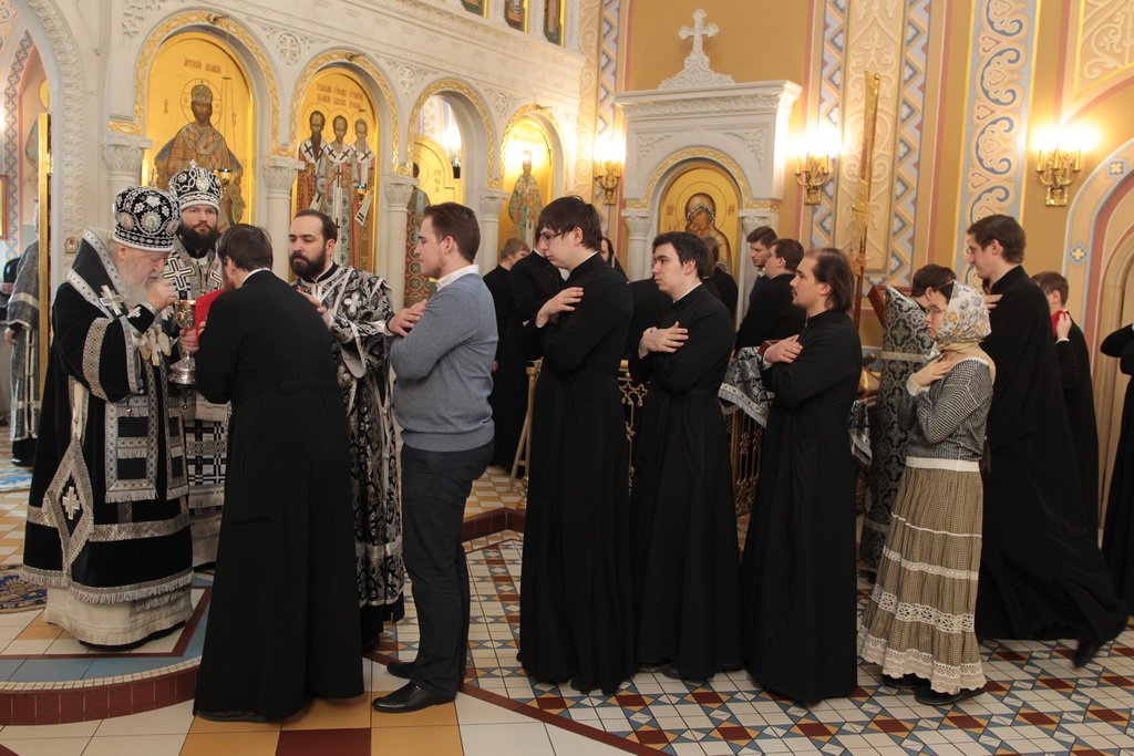 Затем к собравшимся с архипастырским словом обратился митрополит Ювеналий: «Дорогой Владыка Константин, дорогой Владыка Петр, дорогие отцы, все зде начальствующие и учащиеся, возлюбленные братья и сестры! Я поздравляю причастников и причастниц с принятием Святых Христовых Таин и всех нас – с началом подвига святого и Великого поста. Господь милосерд к нам, за наш малый подвиг многие из нас сегодня сподобились причаститься Святых Христовых Таин. Уже много лет подряд в среду на первой седмице Великого поста я душой и телом устремляюсь в Коломну, чтобы совершить совместную молитву вместе с учащими и учащимися семинарии с тем, чтобы духовно подкрепить будущих пастырей и самому взглянуть, какая смена готовится для нас, пожилых священнослужителей, в нашей Церкви в пределах Московской епархии. Мы всегда встречаемся в то время, когда начинается напряженная духовная жизнь, когда мы ограничиваем себя в скоромной пище и боремся со страстями и грехами, которые накапливаются у нас в душе и отвращают нас от Господа. Святая Церковь, как заботящаяся о своем ребенке мать, имеет попечение о верных своих, предлагая в течении года посты для того, чтобы духовно возродиться, отрясти грех, соединиться с Господом и дальше продолжать свой духовный путь. Может быть, некоторые неискушенные в молитве недоумевают, зачем Церковь совершает продолжительные и, как им кажется, скучные богослужения. Но ведь в этих богослужениях собрана вся мудрость Церкви за многие столетия. Так молились наши предки и спасались. Так молились наши новомученики и исповедники. В этом году мы особенно их поминаем, потому что сто лет назад началось тяжелое испытание для нашей Церкви, ее служителей и всех верующих, когда только за сан священника или исповедание веры людей лишали не только всех материальных благ, но и жизни. Мы канонизовали тех священнослужителей, - архипастырей, пастырей, монашествующих, мирян, - о ком нашли свидетельство в подлинных документах, что они мужественно пострадали, были лишены жизни за имя Христово. Вспоминая их подвиг, мы должны утверждаться в вере. Сегодня уже никто нам не мешает молиться, и мы стараемся залечить раны, нанесенные Церкви в течение богоборческого периода, восстанавливая порушенные святыни и созидая новые храмы. Но наша основная цель и задача – обратить людей к вере Христовой. Несмотря на все встречающиеся соблазны мира сего, нужно знать, что вера Христова, принадлежность к Церкви – это для нас самое дорогое, потому что все это ведет нас к Царствию Небесному, к вечной жизни с Господом. Я желаю вам по милости Божией спасительно пройти предстоящее поприще Святой Четыредесятницы и в радости духовной, с очищенной покаянием совестью поклониться Светлому Христову Воскресению.