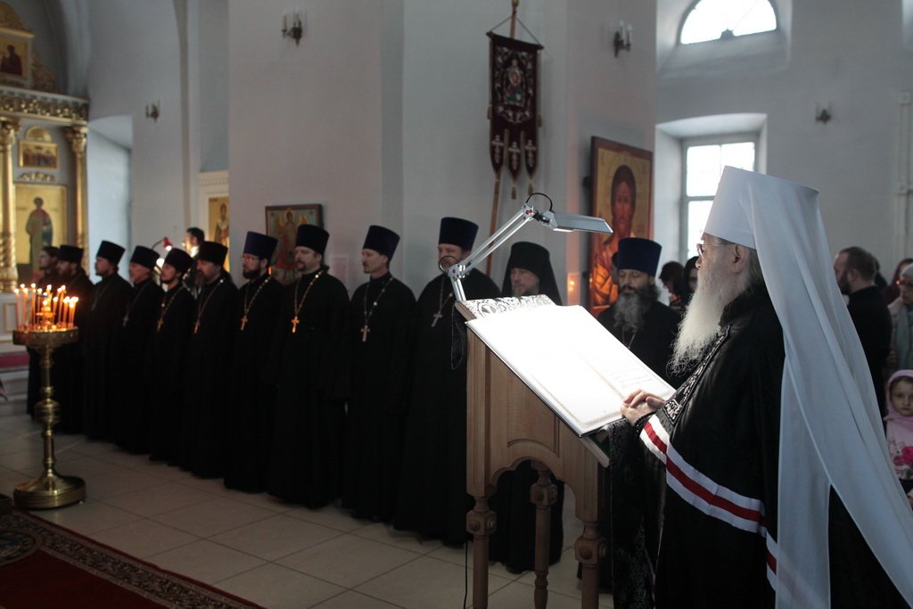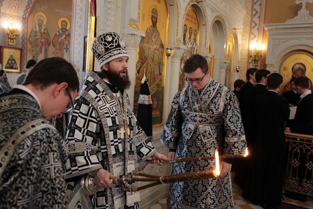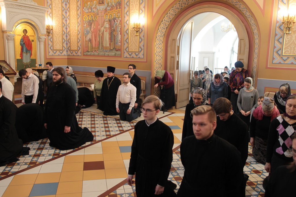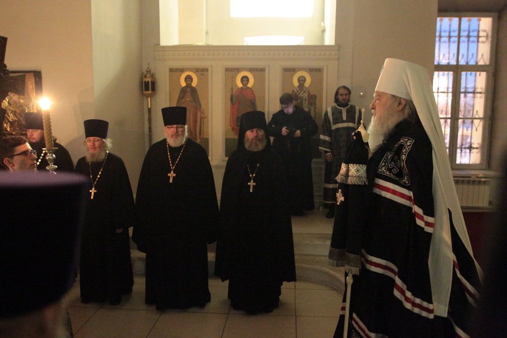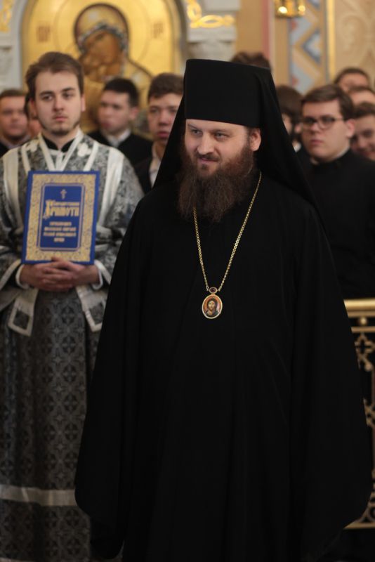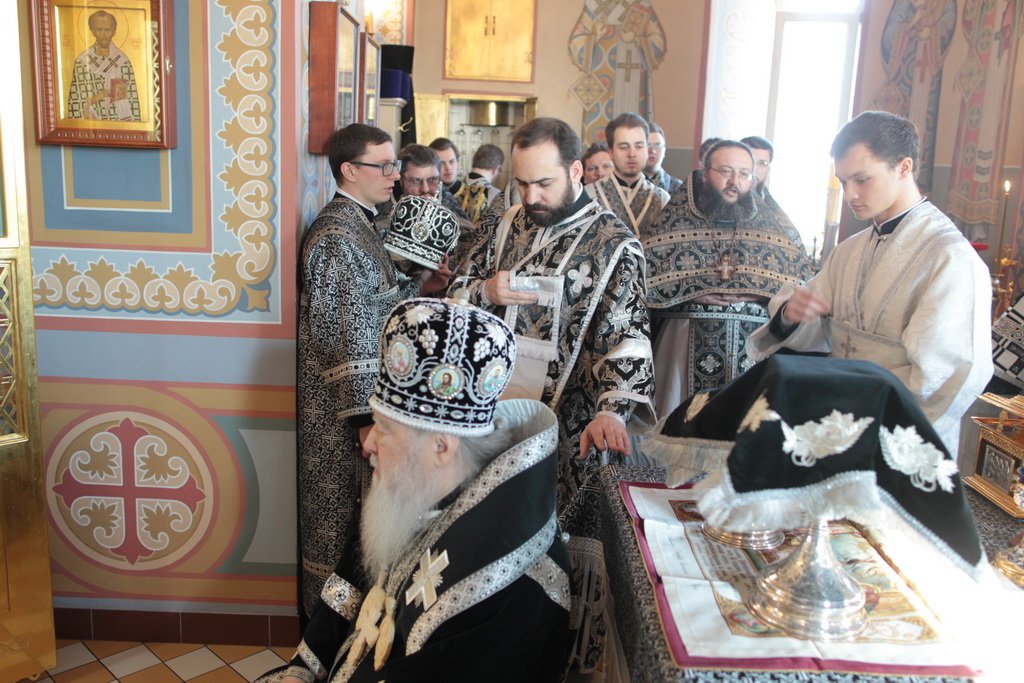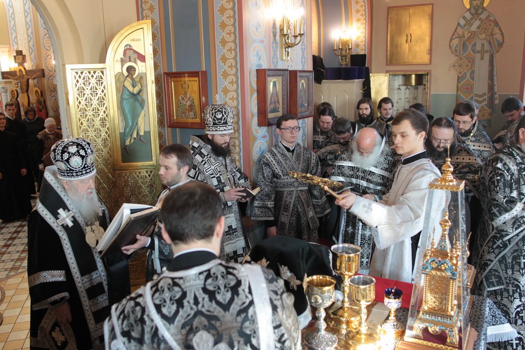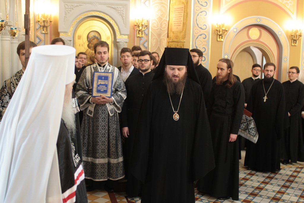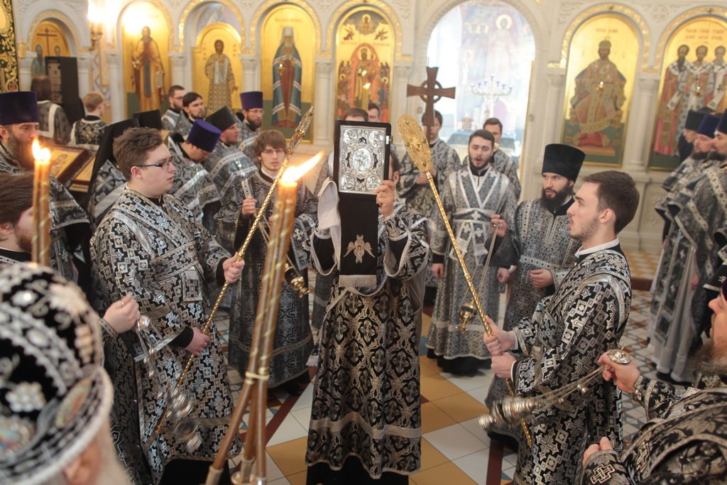 По окончании богослужения епископ Константин обратился к Владыке митрополиту с приветственным словом: «Ваше Высокопреосвященство, дорогой Владыка митрополит Ювеналий, наш архипастырь и милостивый отец! В этот день, когда совершается первая в Великий пост Литургия Преждеосвященных Даров, Вы по многолетней традиции прибыли в свой кафедральный град, посетили духовную семинарию, училище, в котором обучаются будущие пастыри Церкви Христовой. Для нас это особый день, потому что мы сослужили Вам, причастились вместе с Вами от единой Чаши Святых Тела и Крови Христовых, и сегодня имеем полный день молитвенного общения с вами. Для нас это особый день, потому что с Вами встречаются преподаватели и студенты семинарии. Мы вместе молимся, получаем от Вас благословение на предстоящий пост и на предстоящее служение, а также ответы на многие вопросы. Приветствую Вас, дорогой Владыка, и испрашиваю Вашего благословения на предстоящий пост и на наше служение».