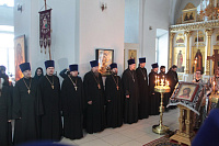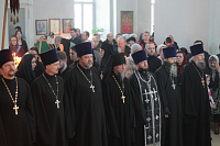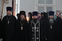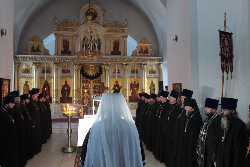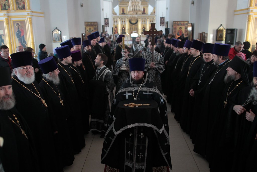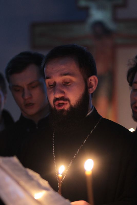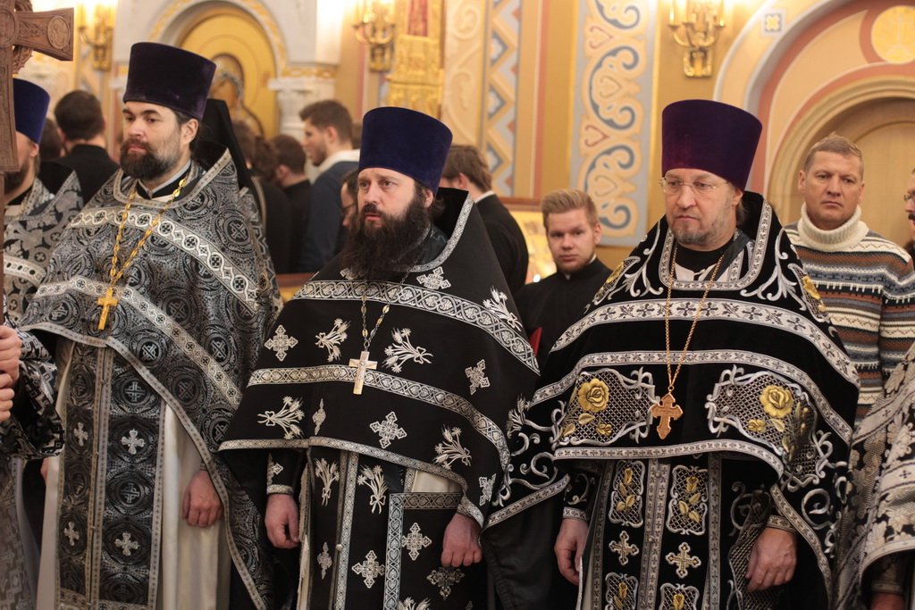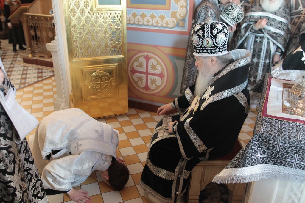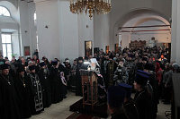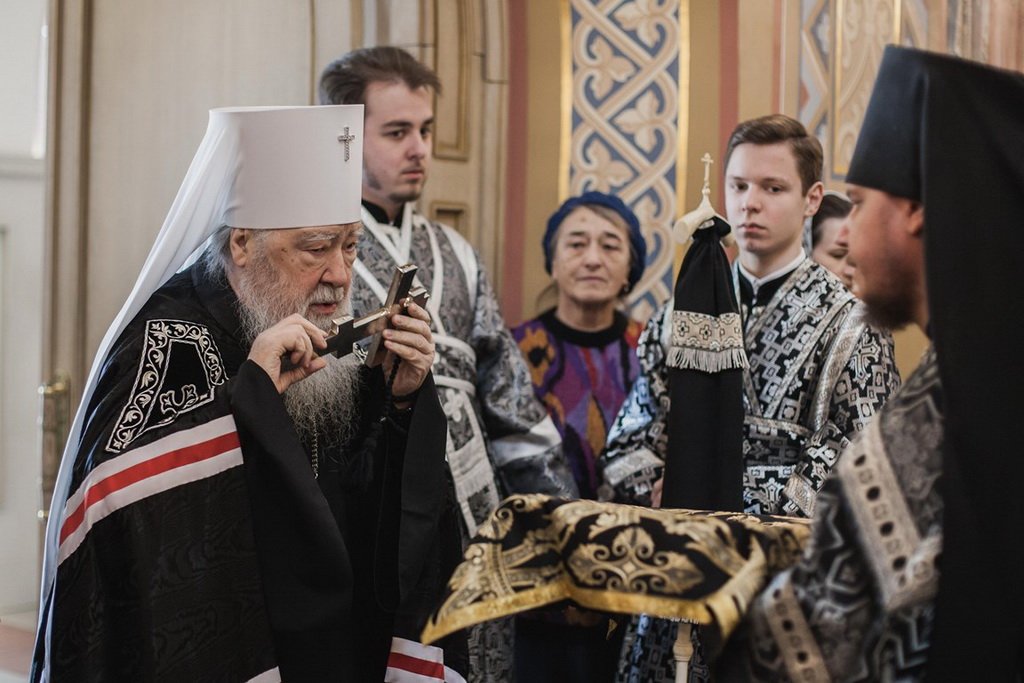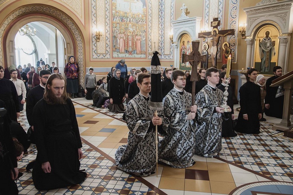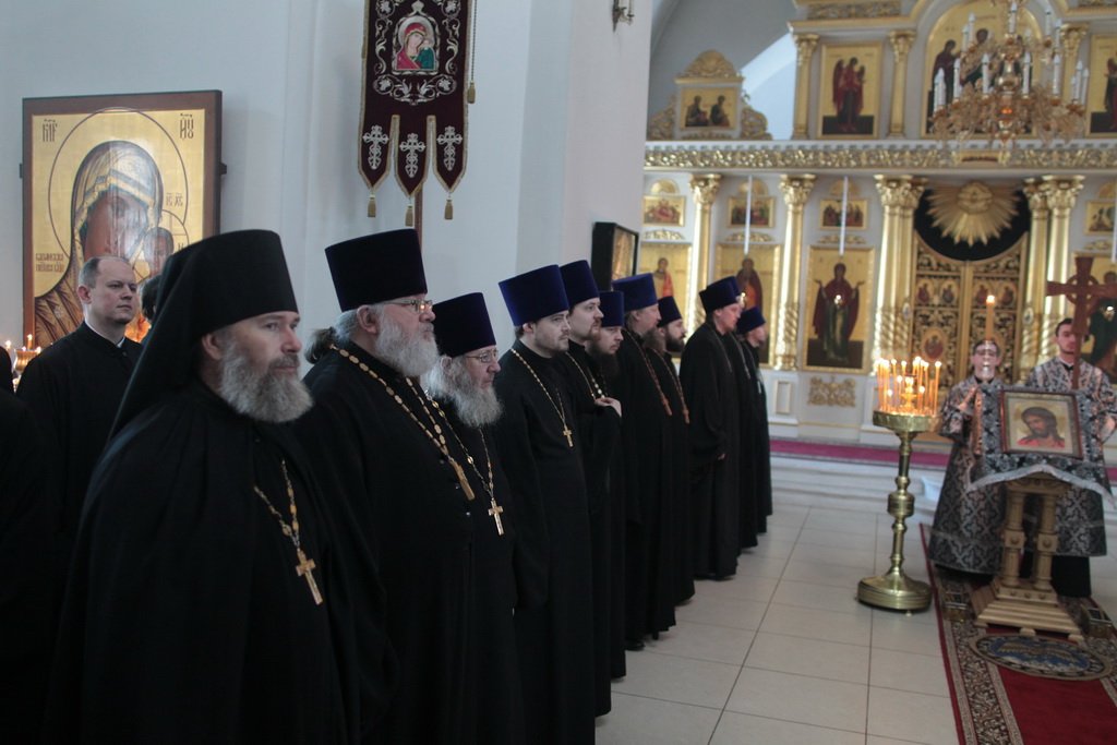 По окончании богослужения епископ Константин обратился к Владыке митрополиту с приветственным словом: «Ваше Высокопреосвященство, дорогой Владыка митрополит Ювеналий, наш архипастырь и милостивый отец! В этот день, когда совершается первая в Великий пост Литургия Преждеосвященных Даров, Вы по многолетней традиции прибыли в свой кафедральный град, посетили духовную семинарию, училище, в котором обучаются будущие пастыри Церкви Христовой. Для нас это особый день, потому что мы сослужили Вам, причастились вместе с Вами от единой Чаши Святых Тела и Крови Христовых, и сегодня имеем полный день молитвенного общения с вами. Для нас это особый день, потому что с Вами встречаются преподаватели и студенты семинарии. Мы вместе молимся, получаем от Вас благословение на предстоящий пост и на предстоящее служение, а также ответы на многие вопросы. Приветствую Вас, дорогой Владыка, и испрашиваю Вашего благословения на предстоящий пост и на наше служение».