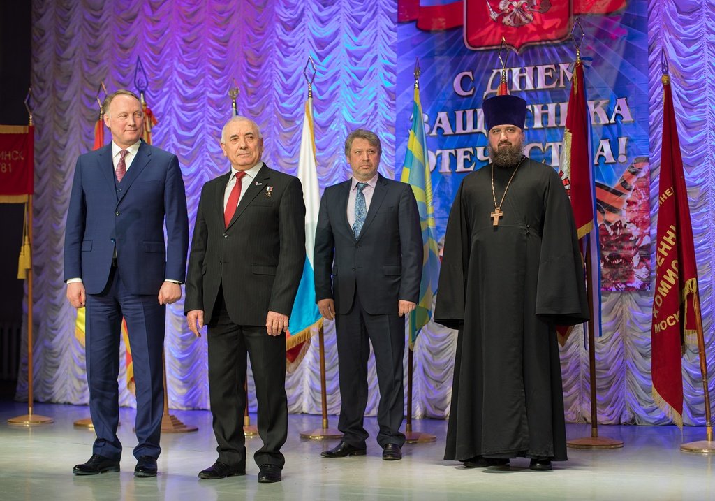 21 февраля в районном доме культуры Ногинска прошло торжественное собрание, посвященное Дню защитника Отечества. На мероприятии чествовали ветеранов Великой Отечественной войны, Героев Советского Союза и Российской Федерации, воинов Ногинского гарнизона. С докладом выступил военный комиссар городов Ногинск, Электросталь и Черноголовка и Ногинского района Московской области, полковник запаса Михаил Борисов. Церемонию награждения и вручения знамен ветеранским организациям провели глава Ногинского района Игорь Красавин, заместитель начальника научно-исследовательского испытательного центра подготовки космонавтов имени Ю. Гагарина, летчик-испытатель, герой Российской Федерации полковник Виктор Рень, председатель Епархиального отдела по взаимодействию с Вооруженными силами и правоохранительными учреждениями, благочинный церквей Богородского округа протоиерей Марк Ермолаев, председатель комиссии Совета общероссийской общественной организации ветеранов Вооруженных сил по патриотическому воспитанию и пропаганде боевых традиций Алексей Грицина. Протоирей Марк Ермолаев освятил знамена и обратился к присутствующим с пастырским словом. Завершился вечер праздничным концертом, подготовленным творческими коллективами района.