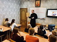 15 марта клирик Никольского храма села Ермолино священник Серафим Барабаш провел беседу с воспитанниками патриотического клуба «Патриот» г. Видное на тему «В мире православной книги».