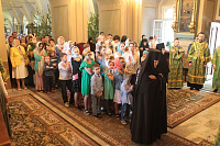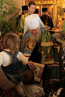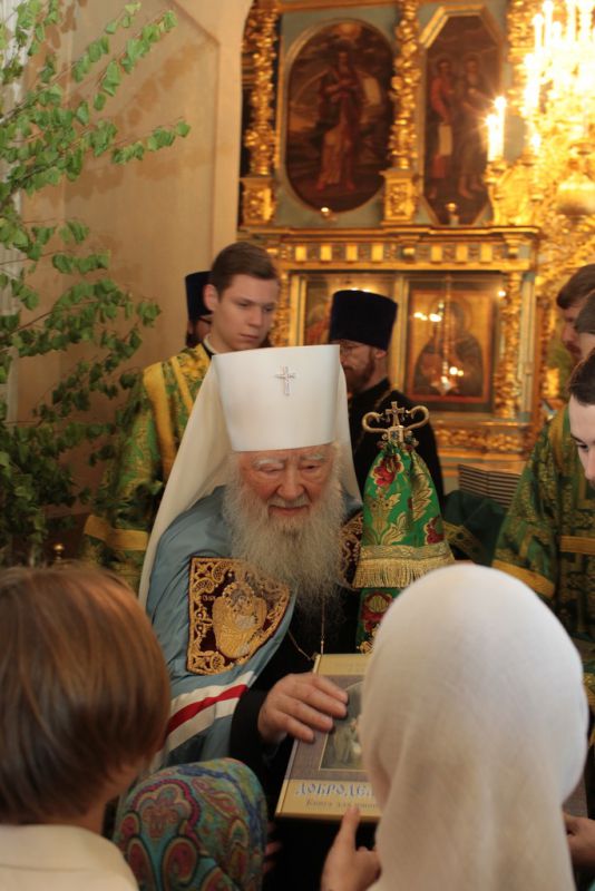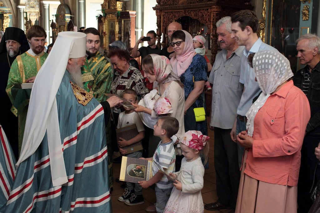 Владыка митрополит раздал детям, молившимся за богослужением, книги Л. Л. Шевченко «Доброделание. Нравственные ценности в жизни человека».