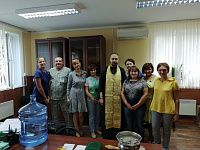31 августа в день ветеринарного работника России настоятель Михаило-Архангельского храма деревни Вертлино протоиерей Дионисий Артемьев совершил водосвятный молебен в Солнечногорской ветеринарной станции, поздравил сотрудников с профессиональным праздником и подарил им книги о храмах Солнечногорского благочиния.