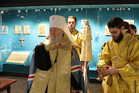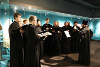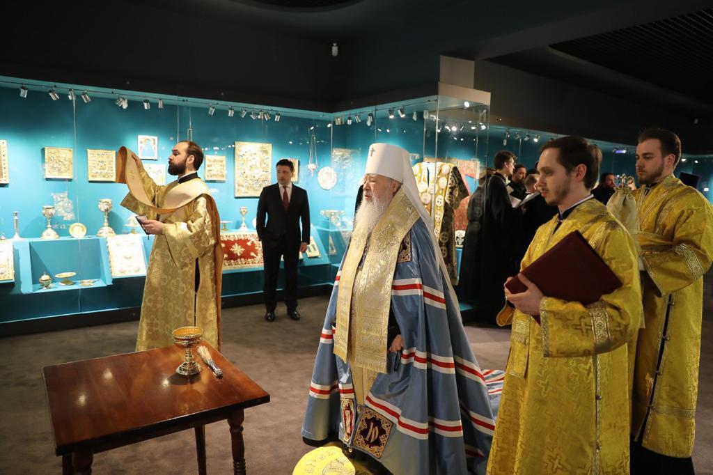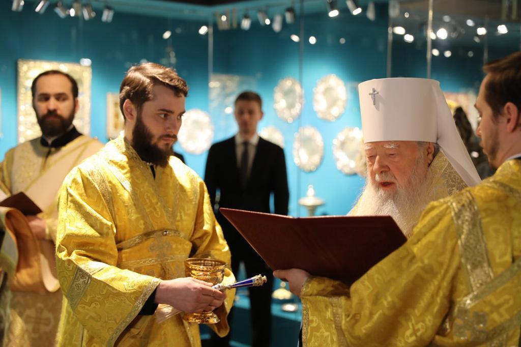 В начале церемонии Владыка митрополит совершил молебен по случаю открытия выставки и окропил святой водой помещение, в котором размещается экспозиция. Богослужебные песнопения исполнял Хор духовенства Московской епархии под управлением священника Сергия Голева.