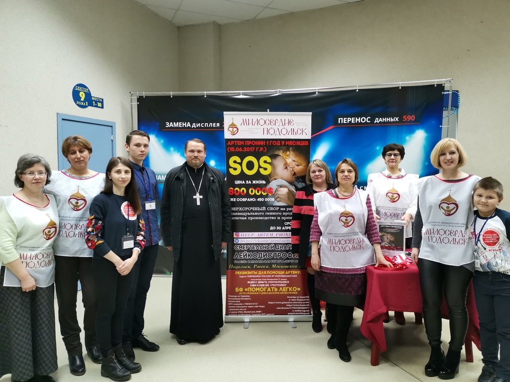30 марта ответственный за социальное служение и благотворительность в Подольском благочинии, настоятель Никольского храма г. Подольска священник Алексий Суриков совместно с волонтерами движения «Милосердие-Подольск» Подольского благочиния провели акцию «Спасем малыша» в помощь юному подольчанину Артему. Акция прошла в ледовом дворце «Витязь» г. Подольска во время проведения культурно-массового мероприятия.