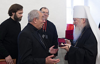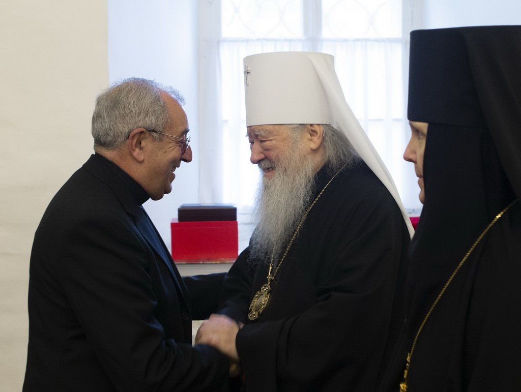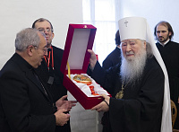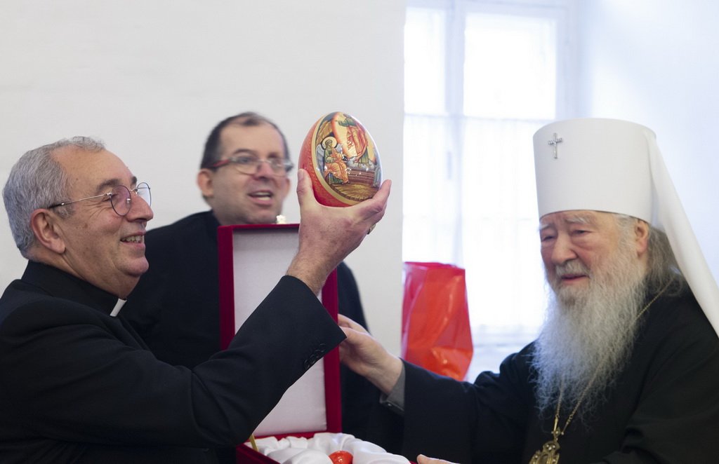 Митрополит Ювеналий преподнес кардиналу Анджело де Донатису именной наперсный крест и всем членам делегации — пасхальные яйца.