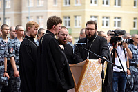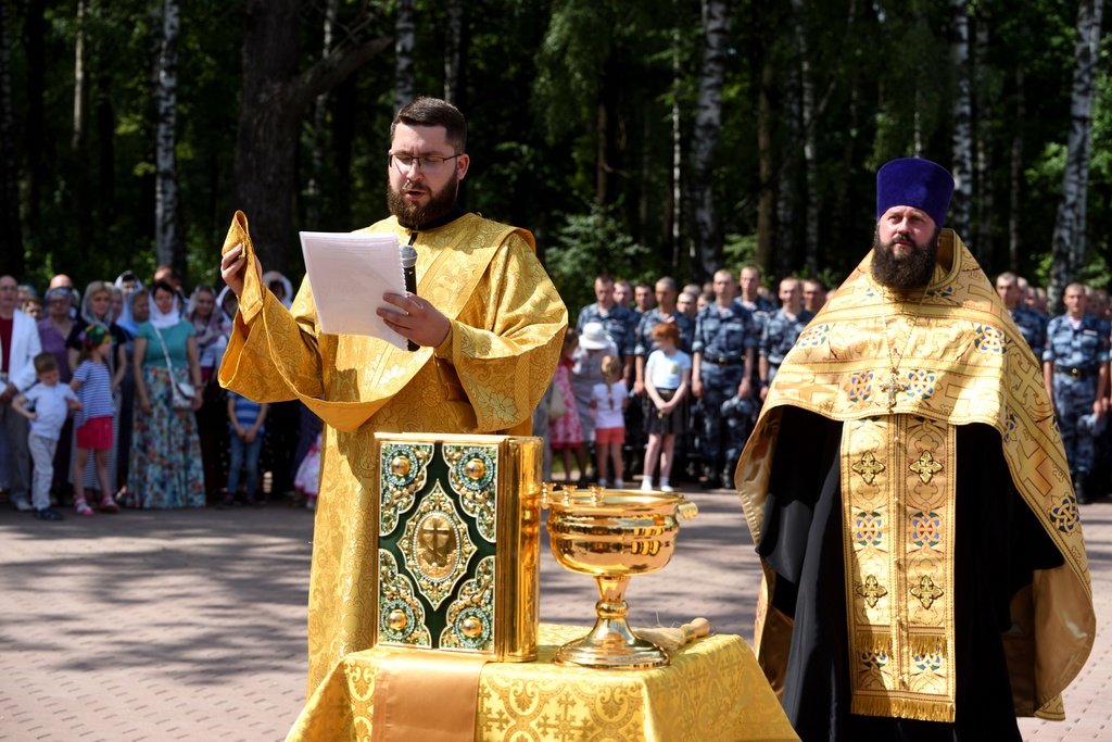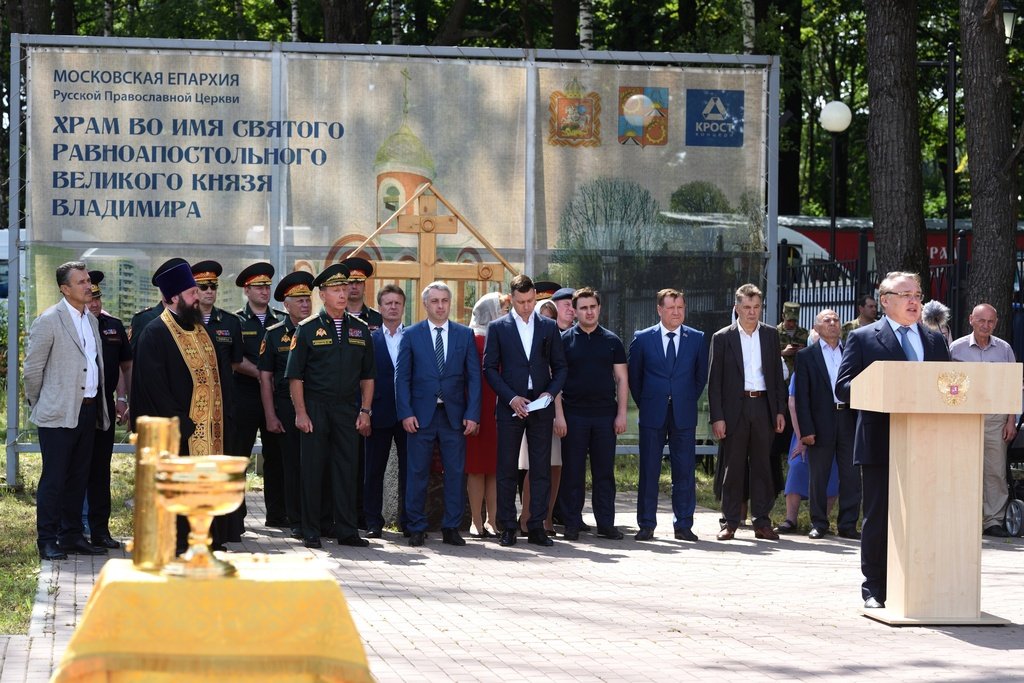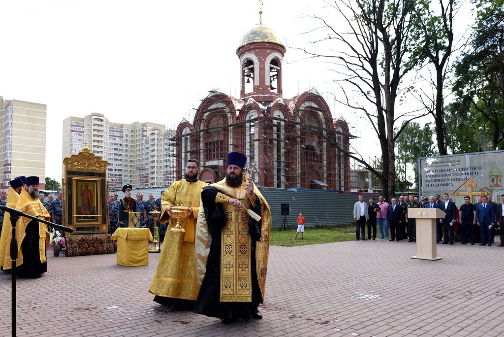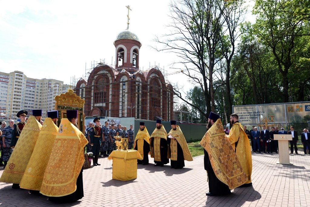28 июля на территории строящегося Князь-Владимирского храма микрорайона Дзержинский городского округа Балашиха, - будущего главного храма войск Национальной гвардии Российской Федерации (Росгвардия), - благочинный Балашихинского церковного округа протоиерей Димитрий Мурзюков совершил молебен равноапостольному князю Владимиру. Песнопения молебна исполнял хор духовенства благочиния под руководством священника Димитрия Огнева. За богослужением молились: главнокомандующий войсками Национальной гвардии Российской Федерации генерал армии Виктор Золотов, его заместители, генералы и офицеры центрального аппарата ведомства, председатель совета депутатов городского округа Балашихи Геннадий Попов, командир расположенной поблизости Отдельной дивизии оперативного назначения имени Ф. Э. Дзержинского генерал-майор Дмитрий Черепанов, военнослужащие и сотрудники с семьями, местные жители и почетные гости, а также сотрудники строительной компании, возводящей храм. После молитвы отец Димитрий окропил всех святой водой и поздравил с праздником. Затем выступили главнокомандующий войсками Росгвардии В. В. Золотов, председатель совета депутатов Балашихи Геннадий Попов и генеральный директор концерна «Крост» Алексей Добашин.