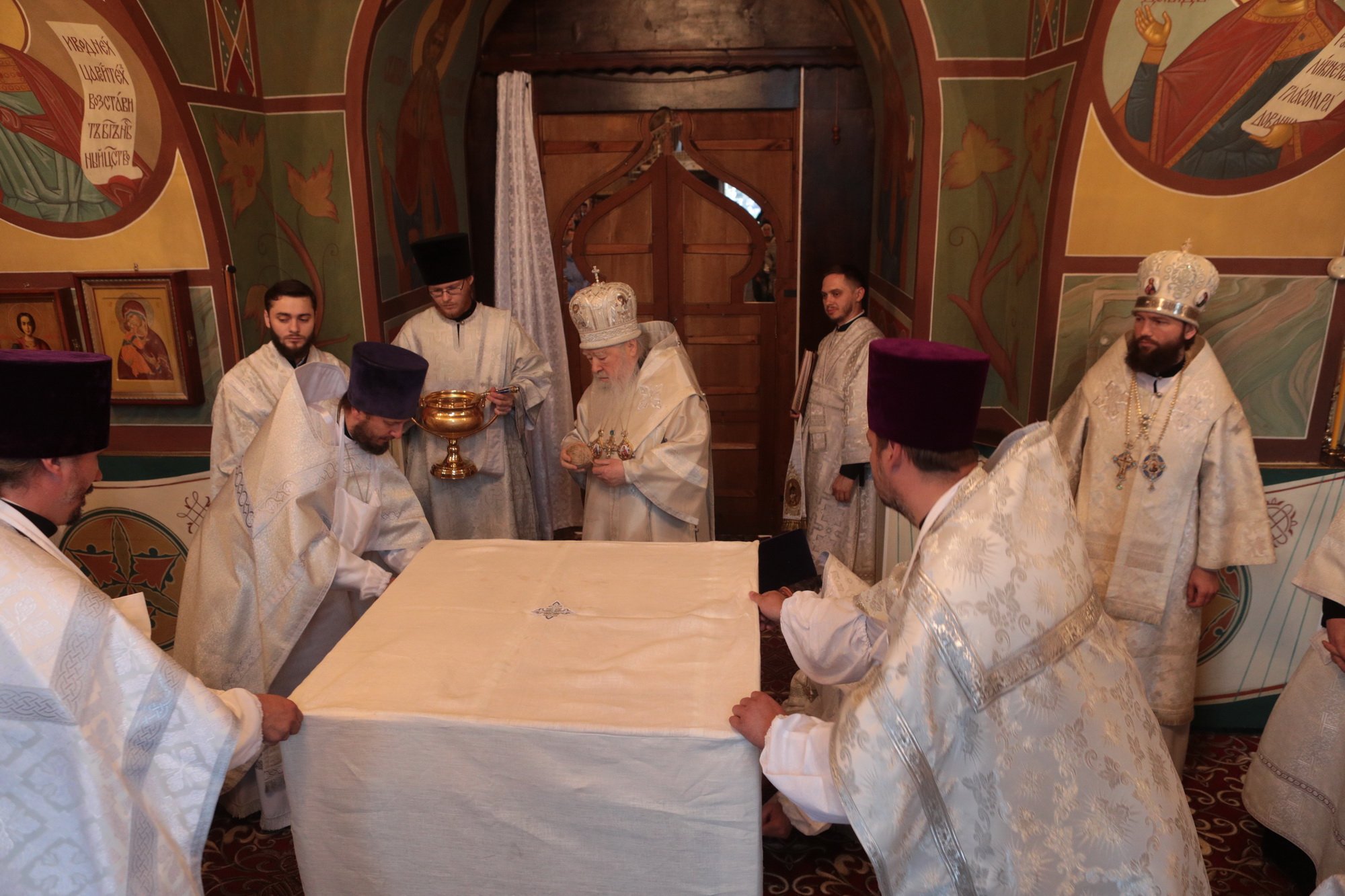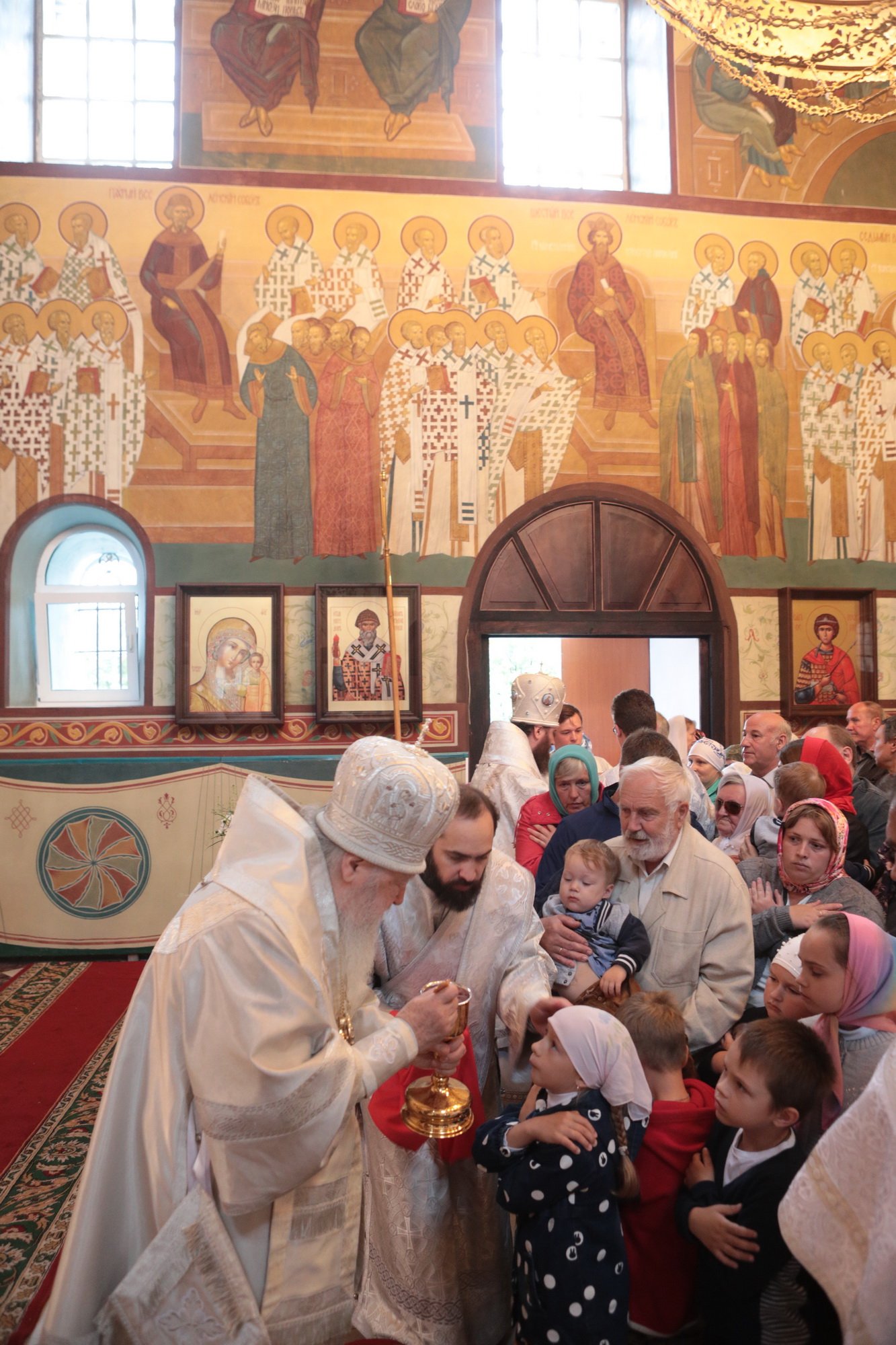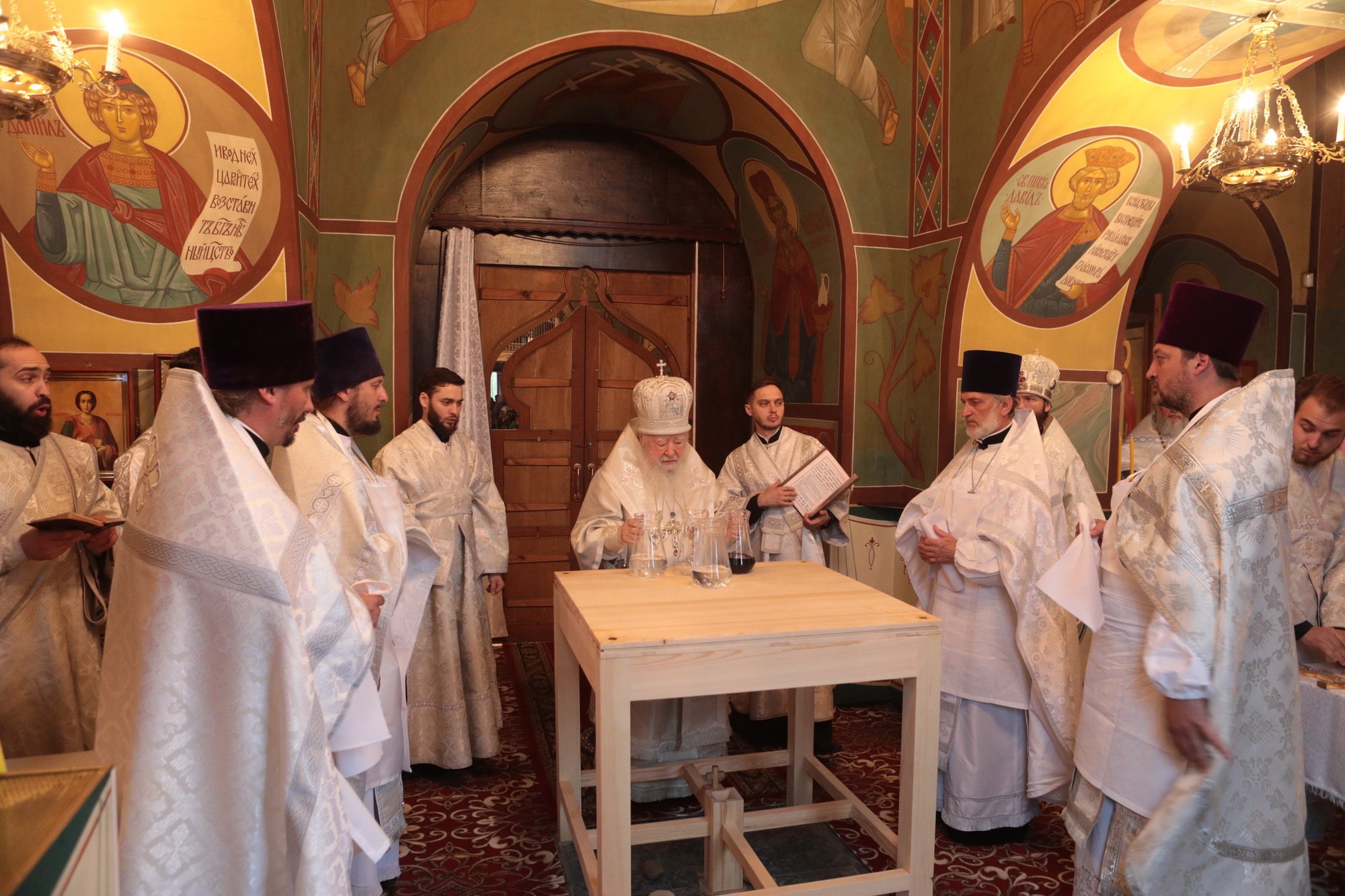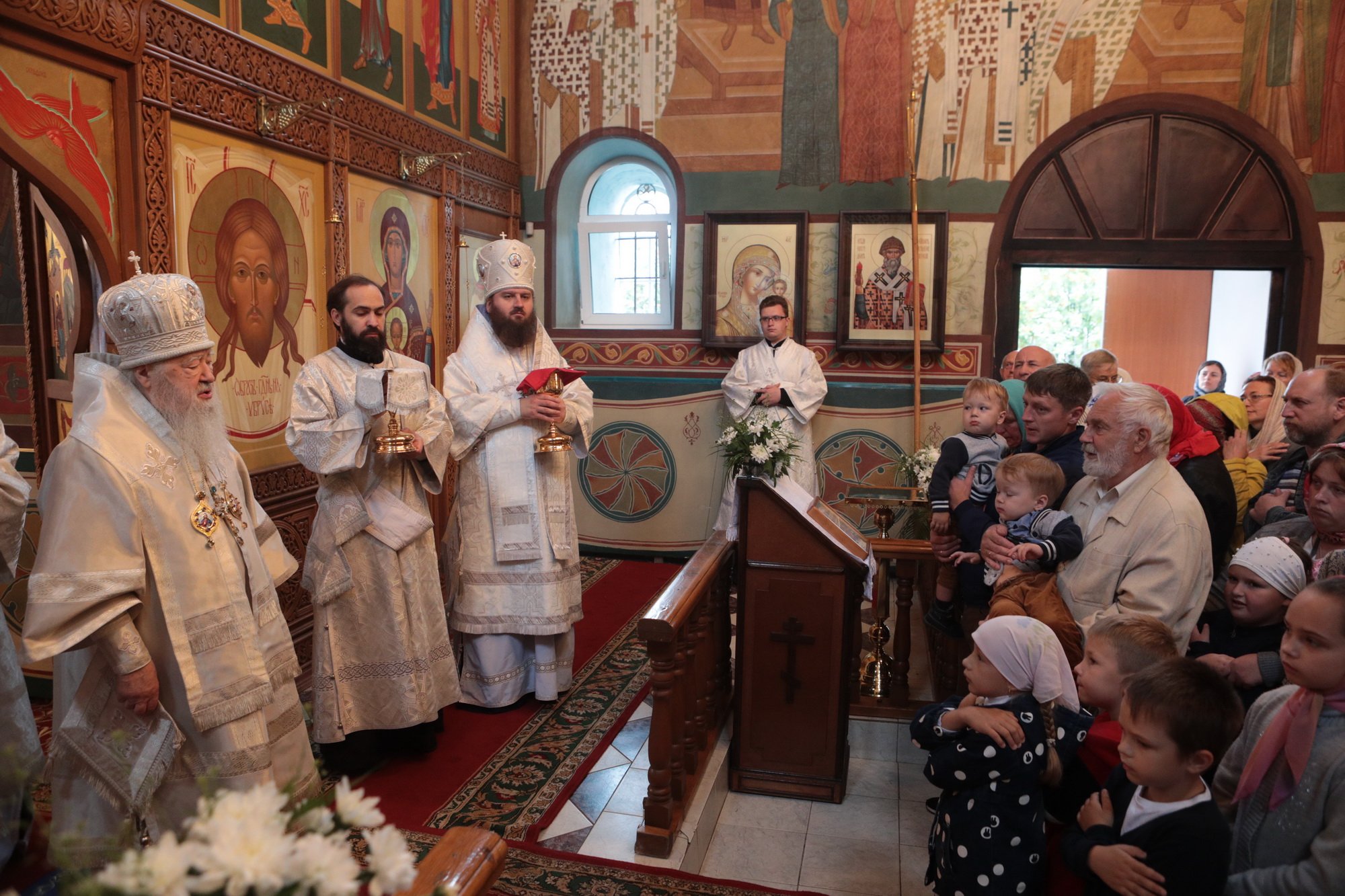 «Благодарю Вас, отец Иоанн, за Ваши слова! Уважаемые Олег Викторович, Никита Юрьевич, братья архипастыри, пастыри, возлюбленные братья и сестры! Каждый раз, когда я размышляю о том, что сказать после Божественной литургии, я обращаю свой взор к евангельскому чтению дня. То, что мы слышим в Евангелии, относится непосредственно ко всем нам. Когда Христос проповедовал в пустыне, послушать Его и напитаться Его словом собрались четыре тысячи человек, кроме женщин и детей (см.: Мф. 15:37), об этом читалось в сегодняшнем Евангелии. Спаситель пожалел народ, который уже три дня находился в пустынном месте, и захотел его накормить. Когда апостолы сказали, что у них всего семь хлебов и немного рыбок, Христос повелел всем возлечь на землю, и воздав благодарение, чудесным образом умножил количество пищи (см.: Мф. 15:32-39). Это место в Евангелии напоминает нам о Божием милосердии, в том числе, к нам и к этому святому храму. Он был закрыт, осквернен, в нем находились различные учреждения, а потом, когда он почти разрушился, его захотели сравнять с землей. В те времена жители были лишены духовной пищи. Но по Своей милости Господь послал сюда отца Иоанна, который в течение четверти века заботился о возрождении этого храма. Восстановление осуществлялось всем миром. Я выражаю глубокую благодарность Олегу Викторовичу, главе городского округа Серебряные Пруды, который много помогал в этом деле. Свои средства в восстановление храма вложил и Никита Юрьевич, первый заместитель председателя Московской областной думы. Я удивляюсь Вашей неиссякаемой энергии и доброй воле, потому что Вы построили уже несколько храмов в Подмосковье и не останавливаетесь на достигнутом. Сердце Ваше горит желанием служить Богу и верующим людям, жителям Московской области. Я рад, что сегодня Господь сподобил меня совершить великое освящение этого прекрасного храма, который по своему благолепию больше похож на городской собор. Я поздравляю вас с этим историческим событием и с 95-летием основания этого края. Причастников и причастниц я поздравляю с принятием Святых Христовых Таин. Храни вас всех Господь!»