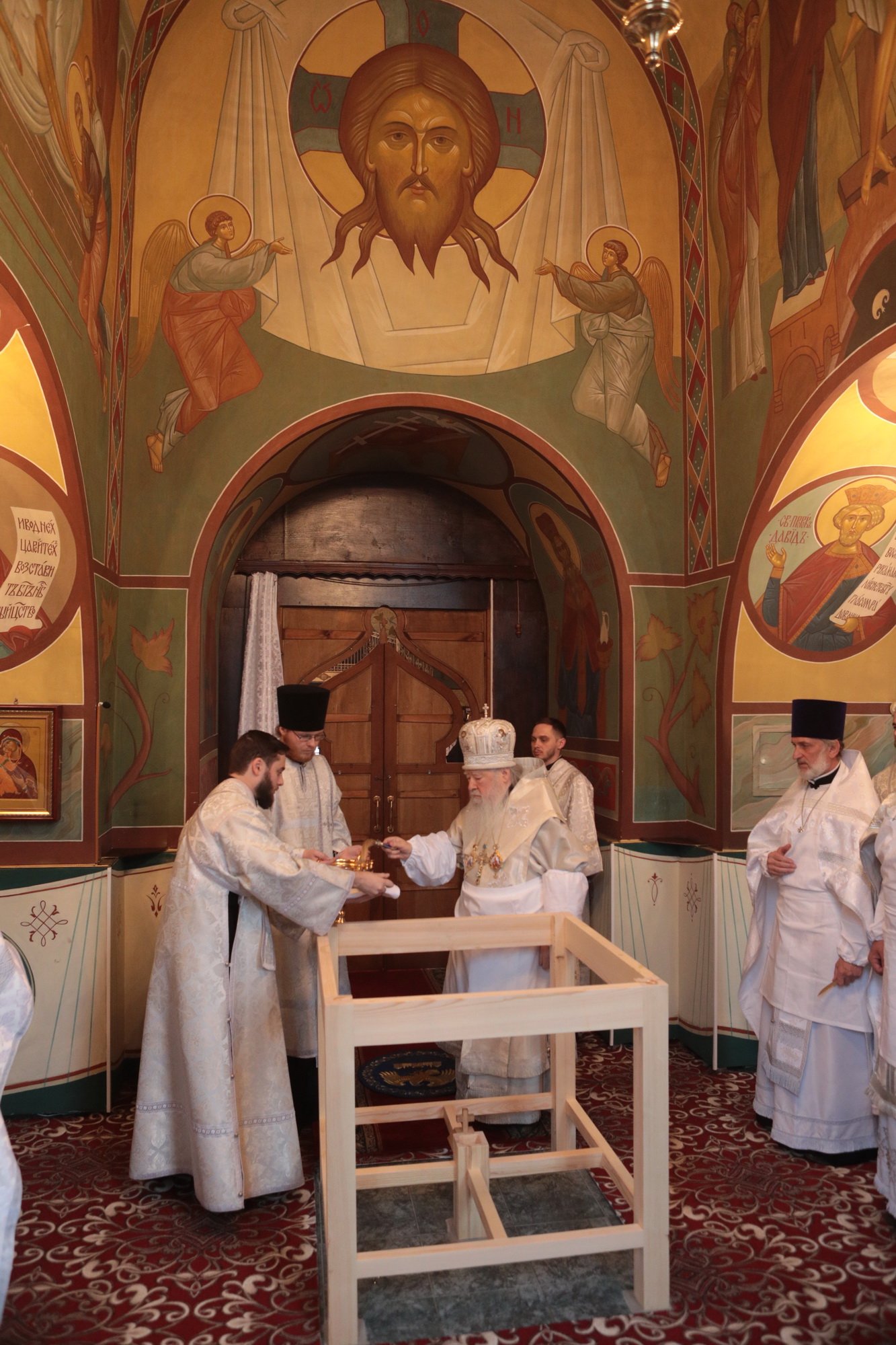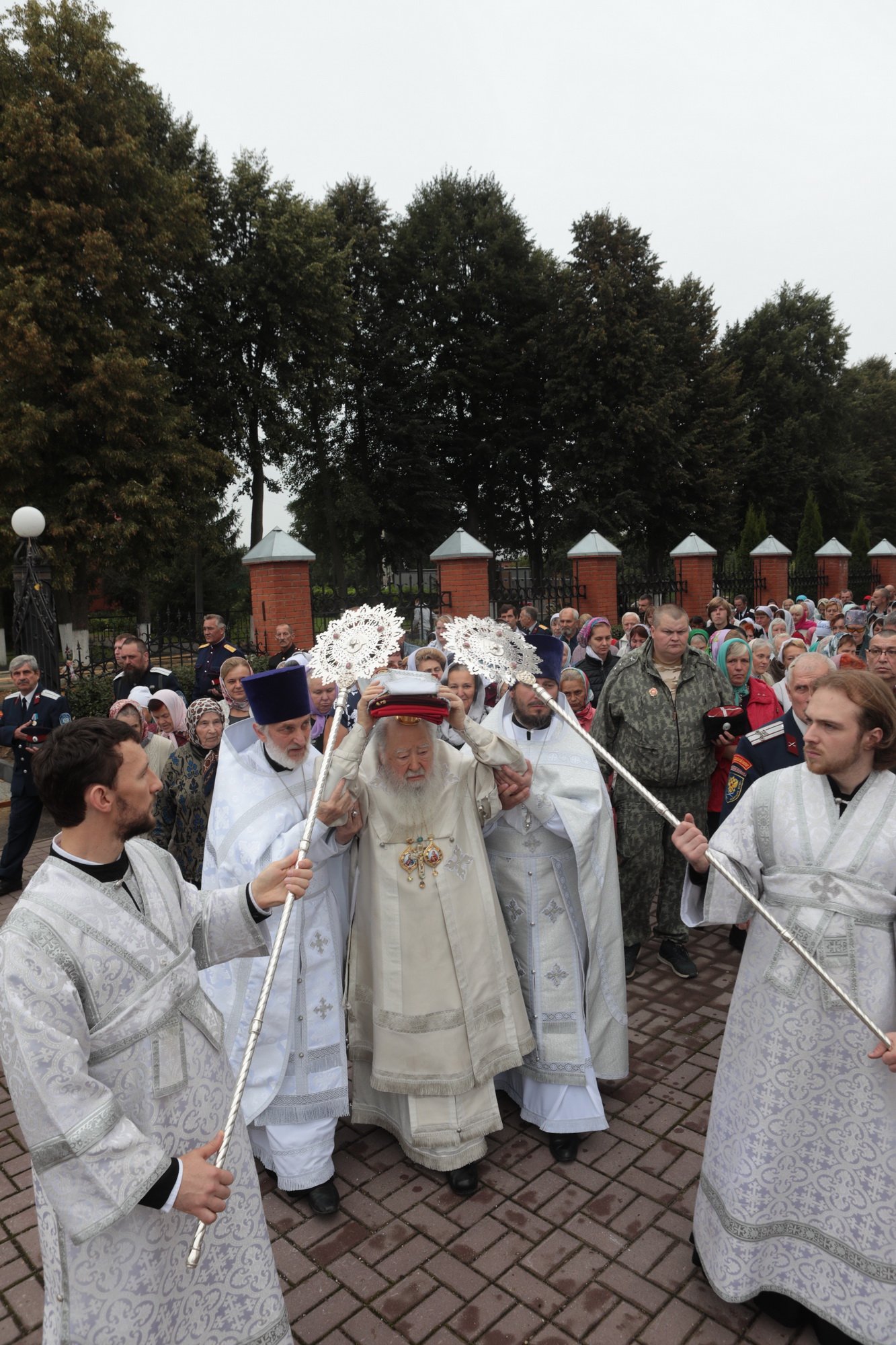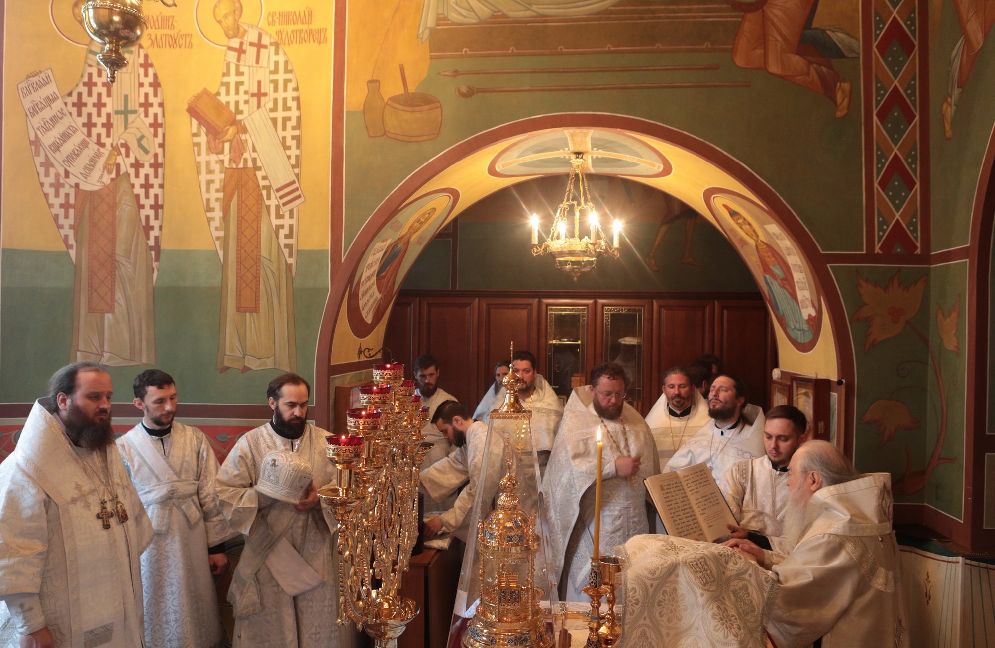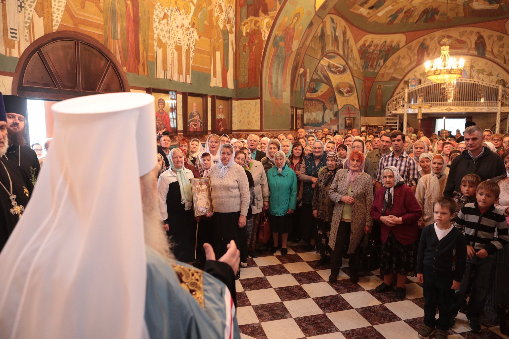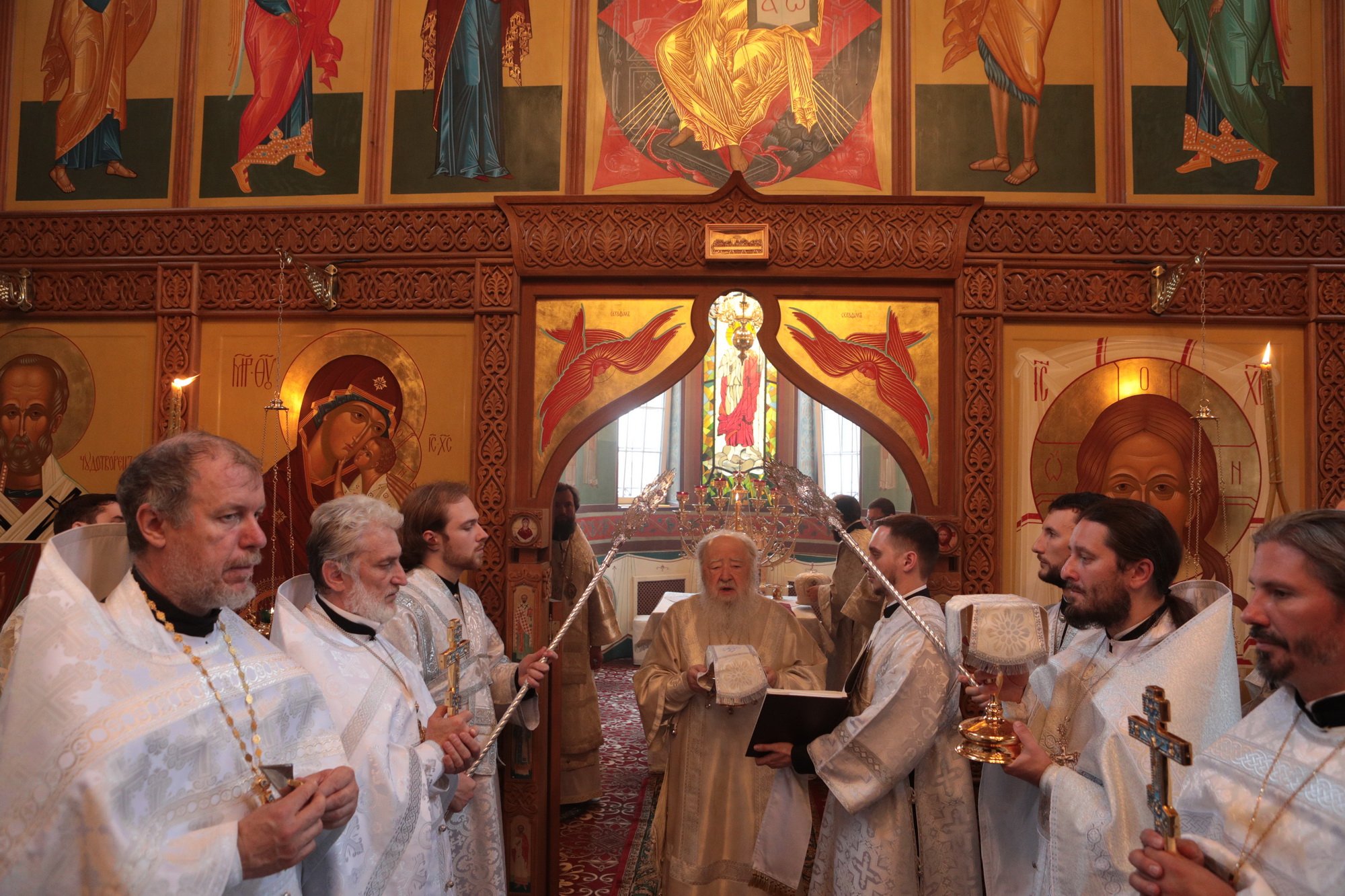 «Благодарю Вас, отец Иоанн, за Ваши слова! Уважаемые Олег Викторович, Никита Юрьевич, братья архипастыри, пастыри, возлюбленные братья и сестры! Каждый раз, когда я размышляю о том, что сказать после Божественной литургии, я обращаю свой взор к евангельскому чтению дня. То, что мы слышим в Евангелии, относится непосредственно ко всем нам. Когда Христос проповедовал в пустыне, послушать Его и напитаться Его словом собрались четыре тысячи человек, кроме женщин и детей (см.: Мф. 15:37), об этом читалось в сегодняшнем Евангелии. Спаситель пожалел народ, который уже три дня находился в пустынном месте, и захотел его накормить. Когда апостолы сказали, что у них всего семь хлебов и немного рыбок, Христос повелел всем возлечь на землю, и воздав благодарение, чудесным образом умножил количество пищи (см.: Мф. 15:32-39). Это место в Евангелии напоминает нам о Божием милосердии, в том числе, к нам и к этому святому храму. Он был закрыт, осквернен, в нем находились различные учреждения, а потом, когда он почти разрушился, его захотели сравнять с землей. В те времена жители были лишены духовной пищи. Но по Своей милости Господь послал сюда отца Иоанна, который в течение четверти века заботился о возрождении этого храма. Восстановление осуществлялось всем миром. Я выражаю глубокую благодарность Олегу Викторовичу, главе городского округа Серебряные Пруды, который много помогал в этом деле. Свои средства в восстановление храма вложил и Никита Юрьевич, первый заместитель председателя Московской областной думы. Я удивляюсь Вашей неиссякаемой энергии и доброй воле, потому что Вы построили уже несколько храмов в Подмосковье и не останавливаетесь на достигнутом. Сердце Ваше горит желанием служить Богу и верующим людям, жителям Московской области. Я рад, что сегодня Господь сподобил меня совершить великое освящение этого прекрасного храма, который по своему благолепию больше похож на городской собор. Я поздравляю вас с этим историческим событием и с 95-летием основания этого края. Причастников и причастниц я поздравляю с принятием Святых Христовых Таин. Храни вас всех Господь!»