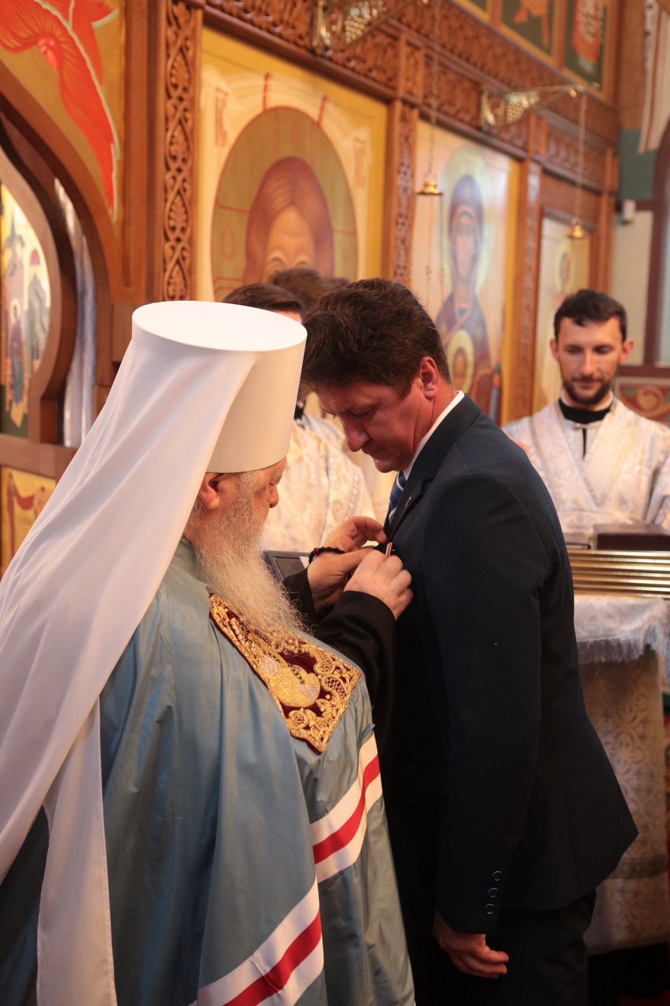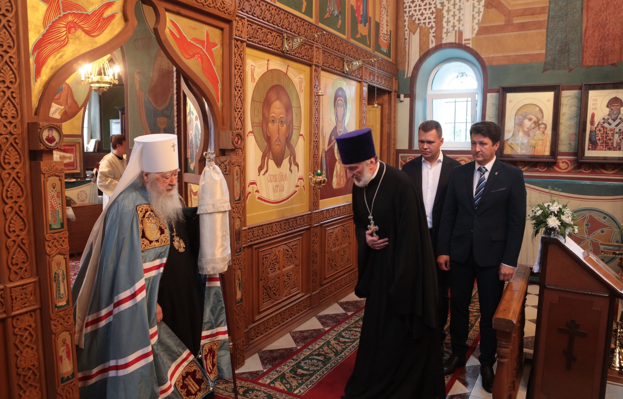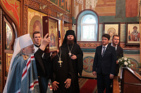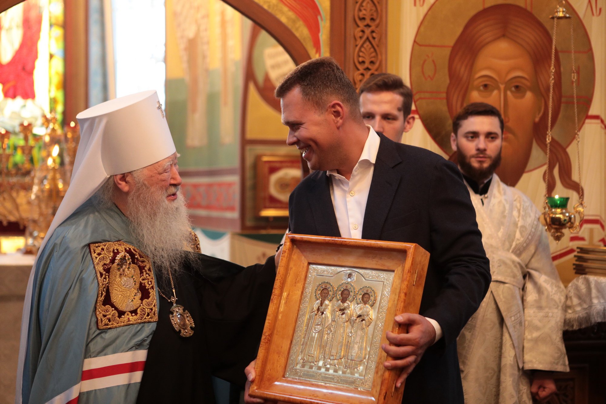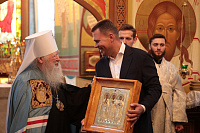 Владыка митрополит вручил Н.Ю. Чаплину образ Трех святителей — Василия Великого, Григория Богослова и Иоанна Златоуста, и пожелал, чтобы они помогали Никите Юрьевичу в его жизни и трудах на благо Московской области.