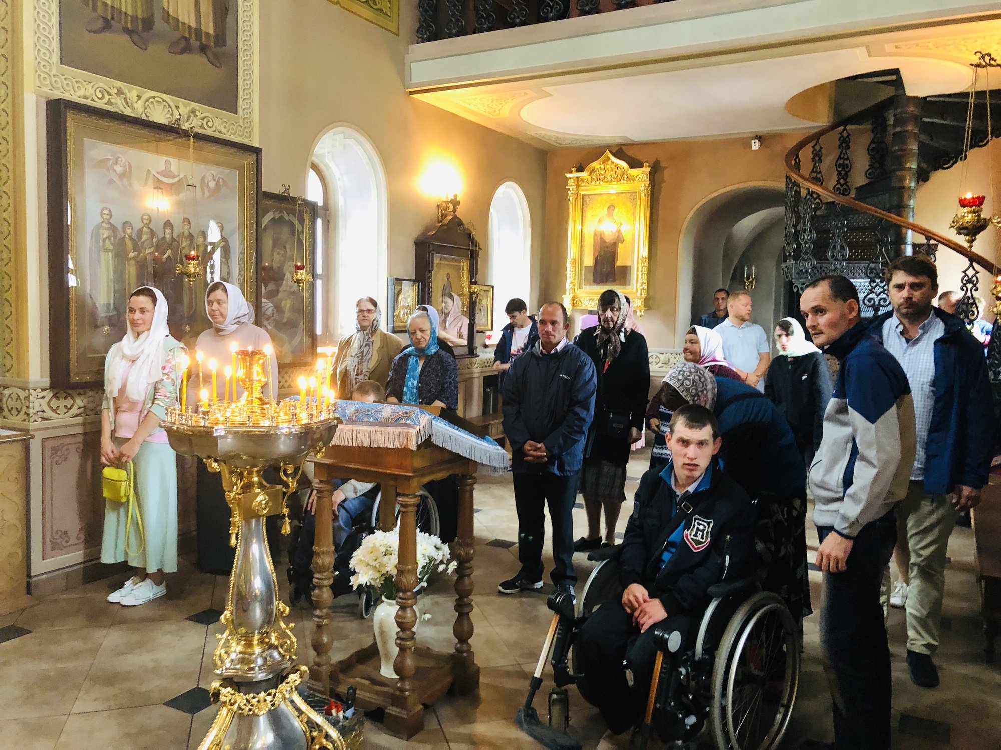 31 августа Уаровский храм поселка Вешки посетили насельники Куровского психоневрологического интерната Орехово-Зуевского района с врожденными физическими патологиями и заболеваниями опорно-двигательного аппарата. Их сопровождение обеспечили сотрудники социального отдела учреждения, попечители и волонтеры. За Божественной литургией, которую в этот день совершил клирик Уаровского храма протоиерей Василий Бланковский, гости исповедовались и причастились Святых Христовых Таин. По окончании богослужения отец Василий обратился к присутствующим с пастырским словом. После богослужения с гостями побеседовал настоятель храма протоиерей Олег Мумриков, затем для них была проведена экскурсия по приходскому экопарку, где с помощью интерактивных стендов можно было познакомиться с растительным и животным миром Подмосковья. В завершение встречи была сделана общая фотография.