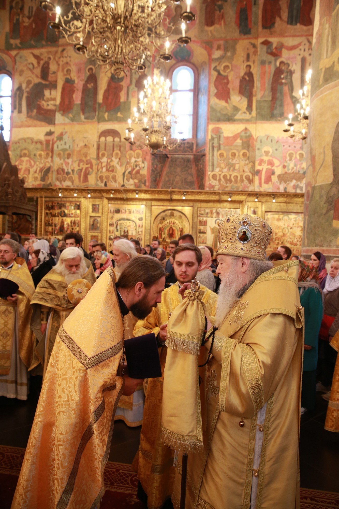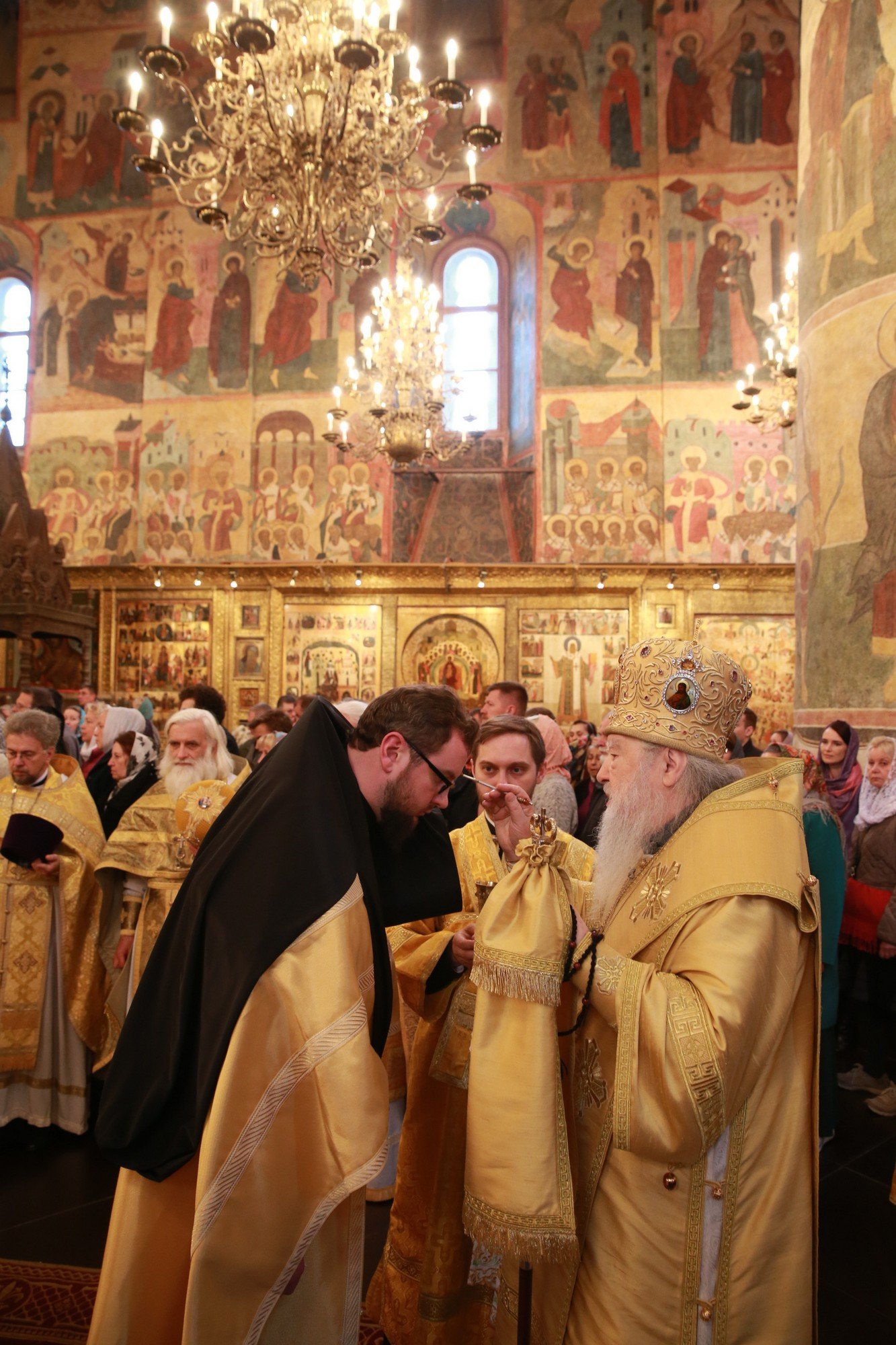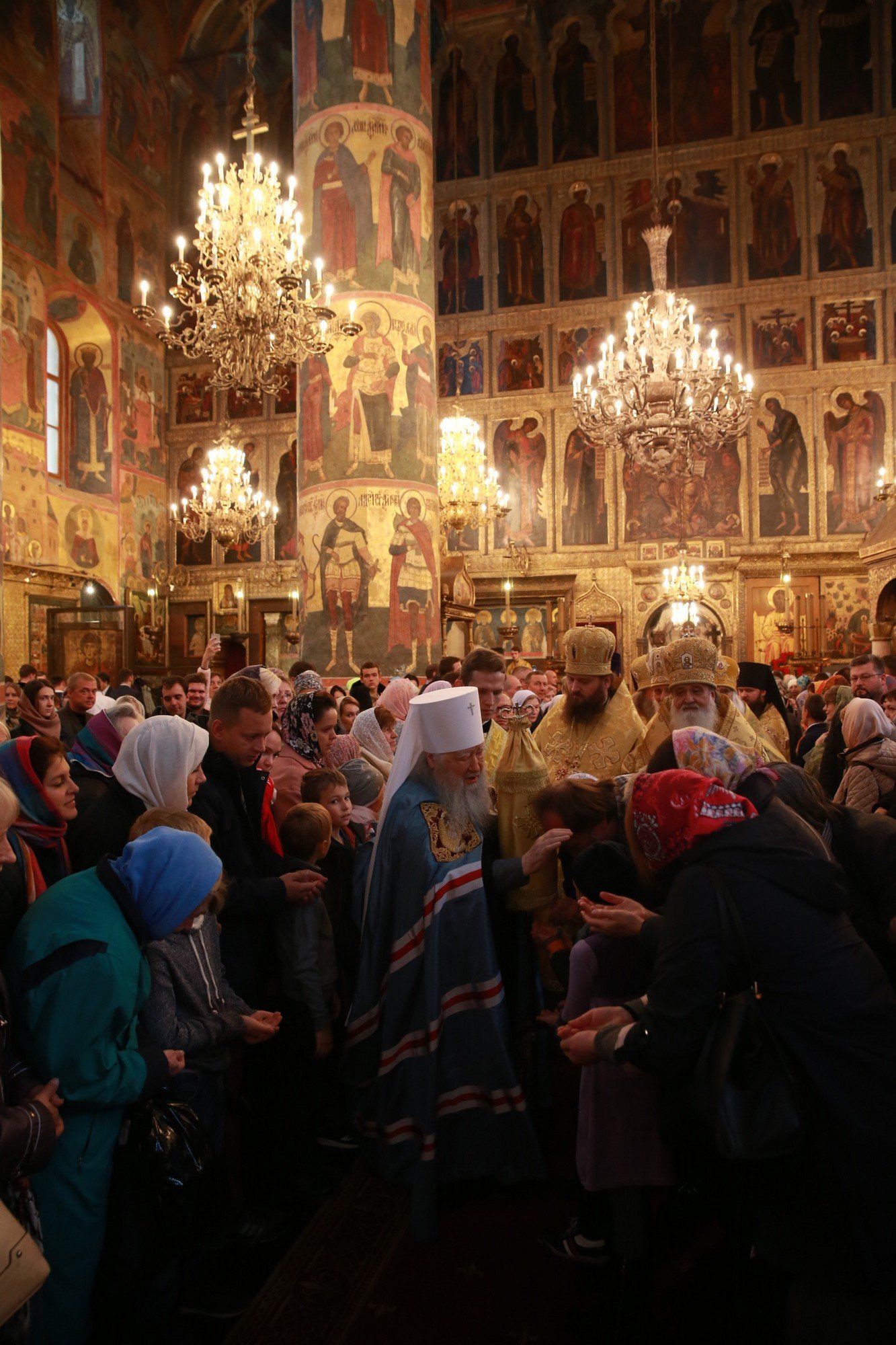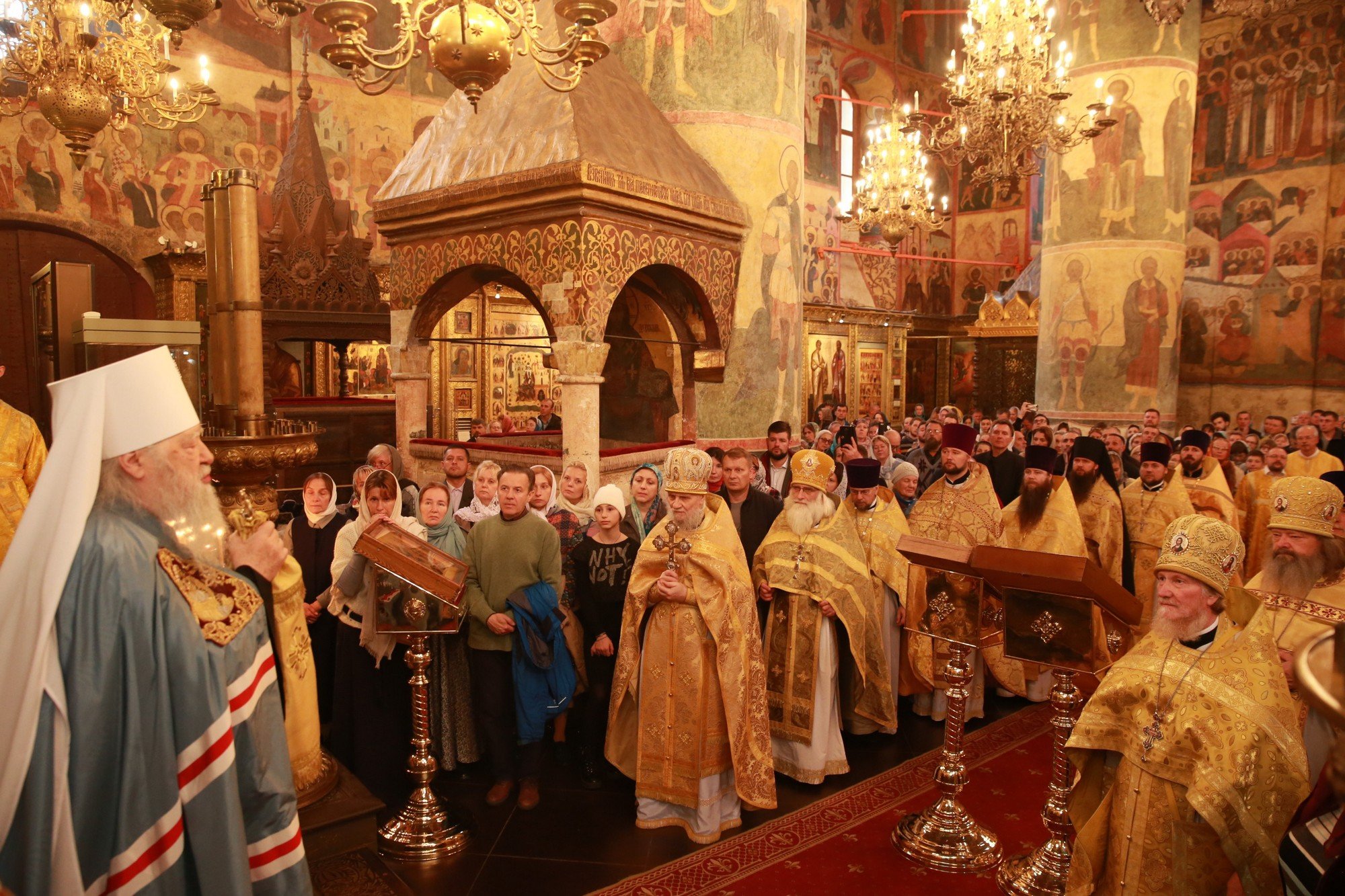 Дорогие братья архипастыри, отцы, братья и сестры! Его Святейшество Святейший Патриарх Московский и всея Руси Кирилл даровал нам великую радость, благословив вместе с московским духовенством и священнослужителями Московской епархии совершить здесь Божественную литургию. Я горячо и сердечно поздравляю всех вас с праздником, причастников и причастниц — с принятием Святых Христовых Таин. Говоря церковным языком, сегодня обильна наша духовная трапеза, потому что мы продолжаем празднование в честь Воздвижения Честнаго и Животворящего Креста Господня и духовно утешаемся, что с тех далеких времен непобедимая и непостижимая и Божественная сила Креста ведет каждого из нас ко спасению, к жизни вечной. Сегодня мы празднуем память двух святителей, Киприана и Фотия, которые в далеком XV веке возглавляли нашу Церковь. История донесла до нас свидетельства об их любви к народу Божию, о верности Церкви Христовой и о трудах по укреплению Московской кафедры. Сегодня мы счастливы, что совершили Божественную литургию у их святых мощей и испрашивали Божие благословение и их небесного предстательства за Отечество наше, Церковь нашу и каждого из нас.