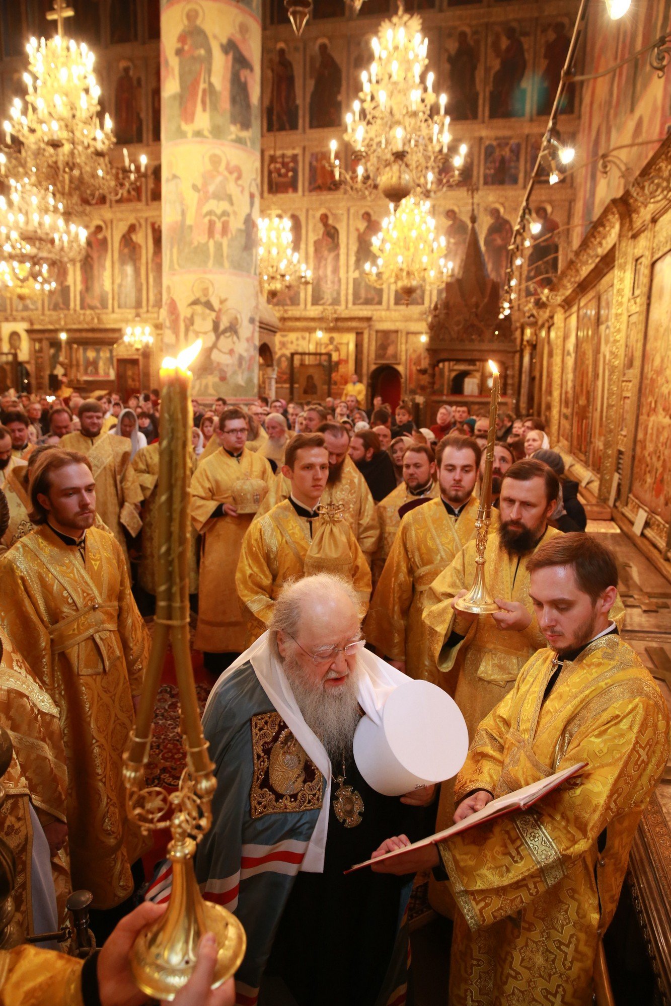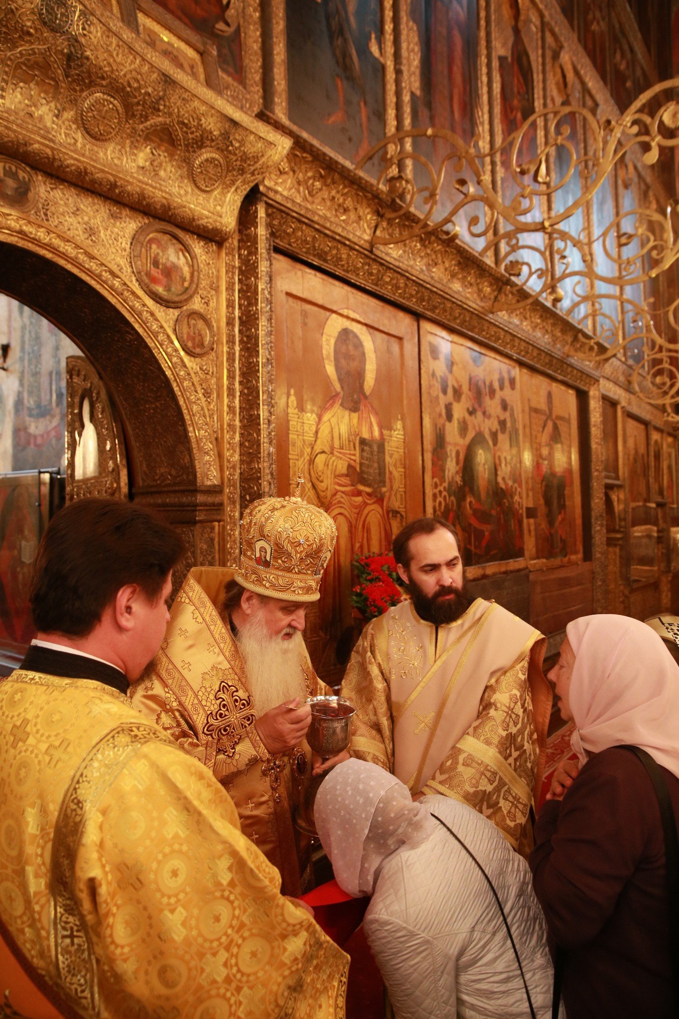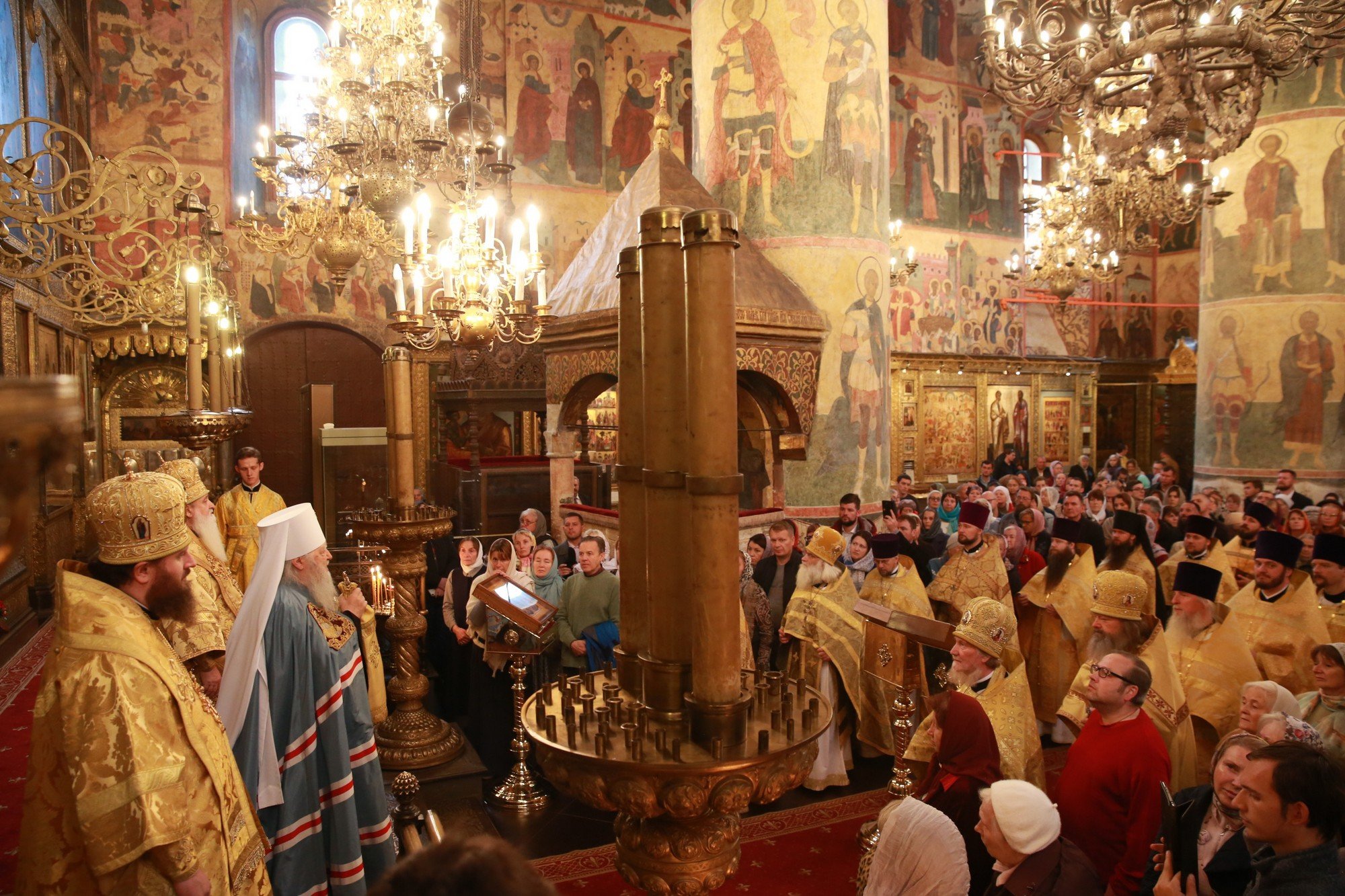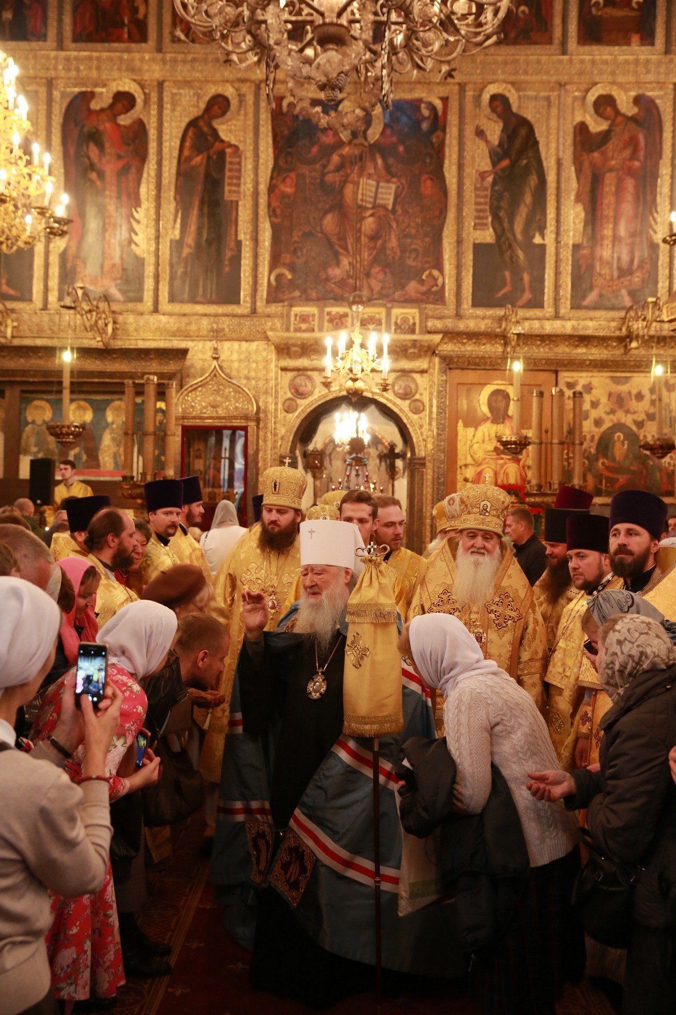 Дорогие братья архипастыри, отцы, братья и сестры! Его Святейшество Святейший Патриарх Московский и всея Руси Кирилл даровал нам великую радость, благословив вместе с московским духовенством и священнослужителями Московской епархии совершить здесь Божественную литургию. Я горячо и сердечно поздравляю всех вас с праздником, причастников и причастниц — с принятием Святых Христовых Таин. Говоря церковным языком, сегодня обильна наша духовная трапеза, потому что мы продолжаем празднование в честь Воздвижения Честнаго и Животворящего Креста Господня и духовно утешаемся, что с тех далеких времен непобедимая и непостижимая и Божественная сила Креста ведет каждого из нас ко спасению, к жизни вечной. Сегодня мы празднуем память двух святителей, Киприана и Фотия, которые в далеком XV веке возглавляли нашу Церковь. История донесла до нас свидетельства об их любви к народу Божию, о верности Церкви Христовой и о трудах по укреплению Московской кафедры. Сегодня мы счастливы, что совершили Божественную литургию у их святых мощей и испрашивали Божие благословение и их небесного предстательства за Отечество наше, Церковь нашу и каждого из нас.