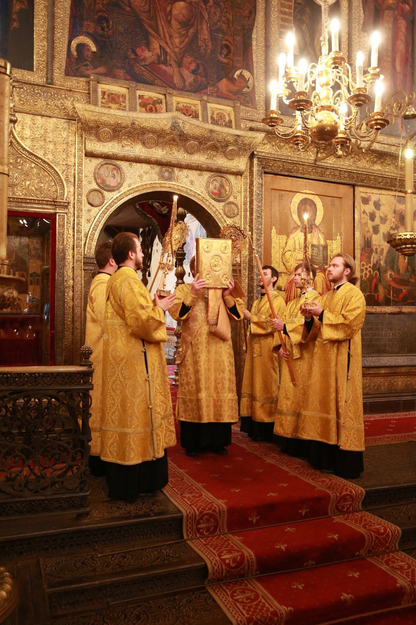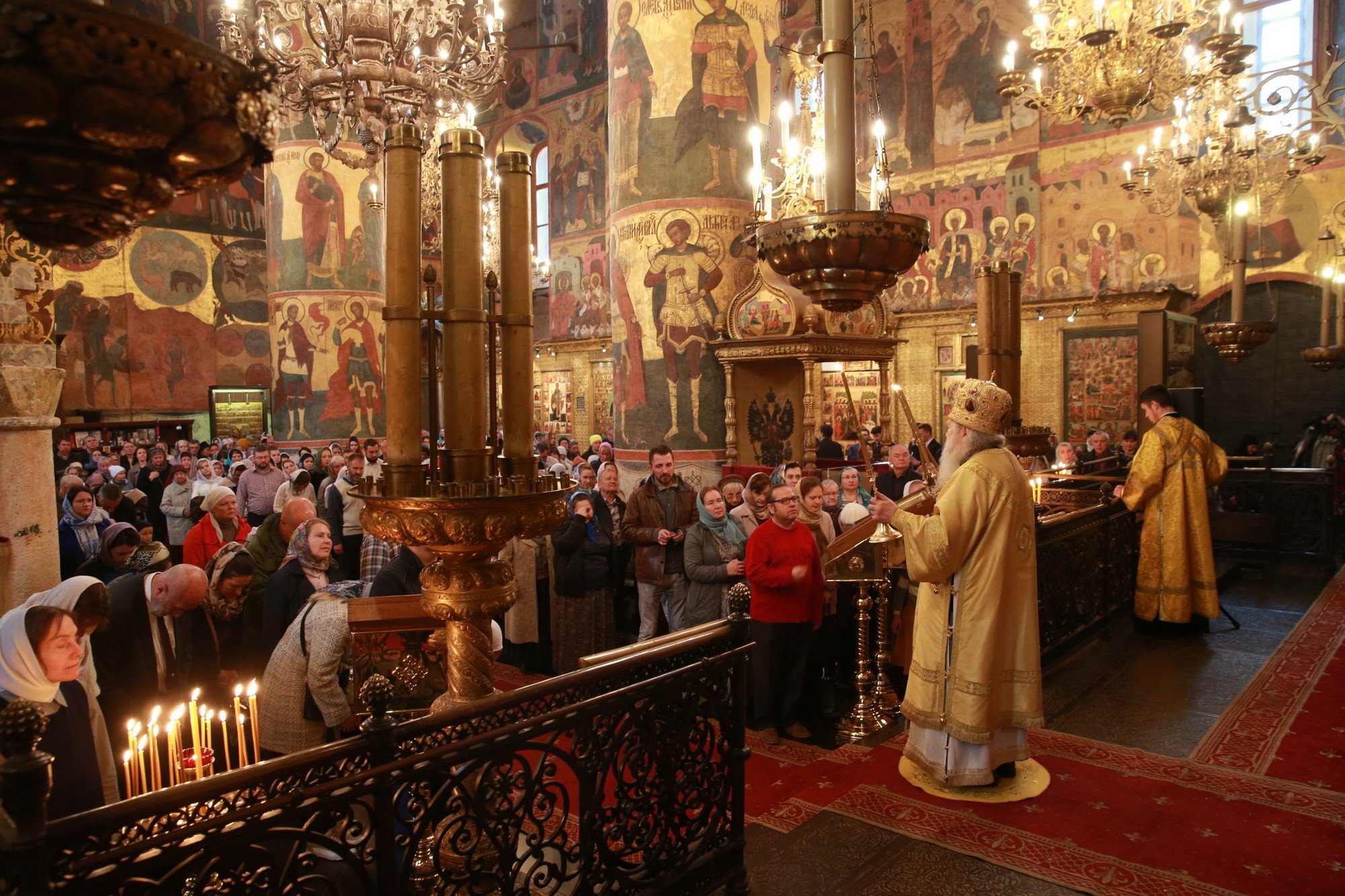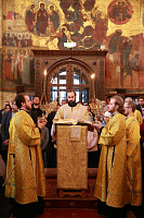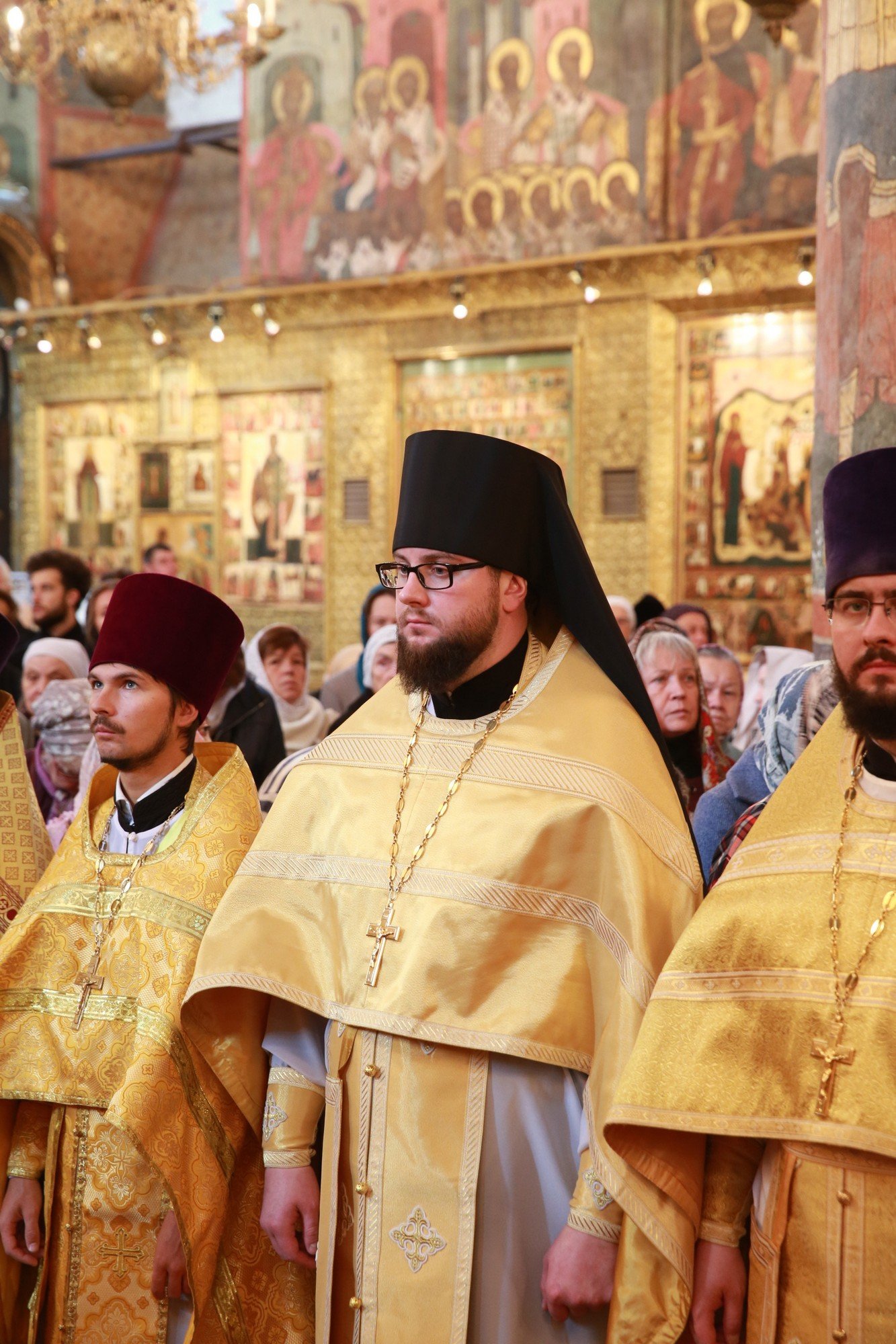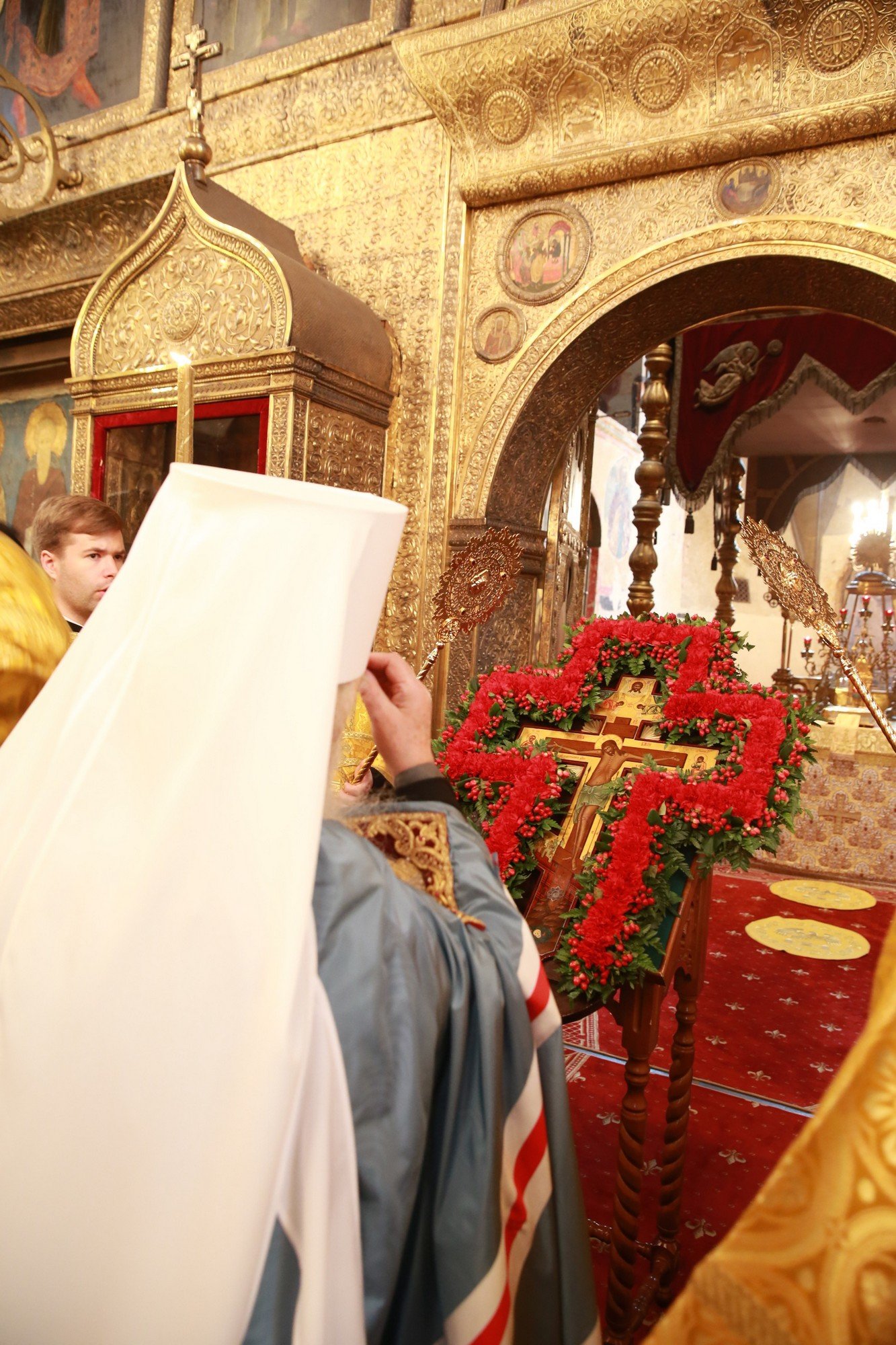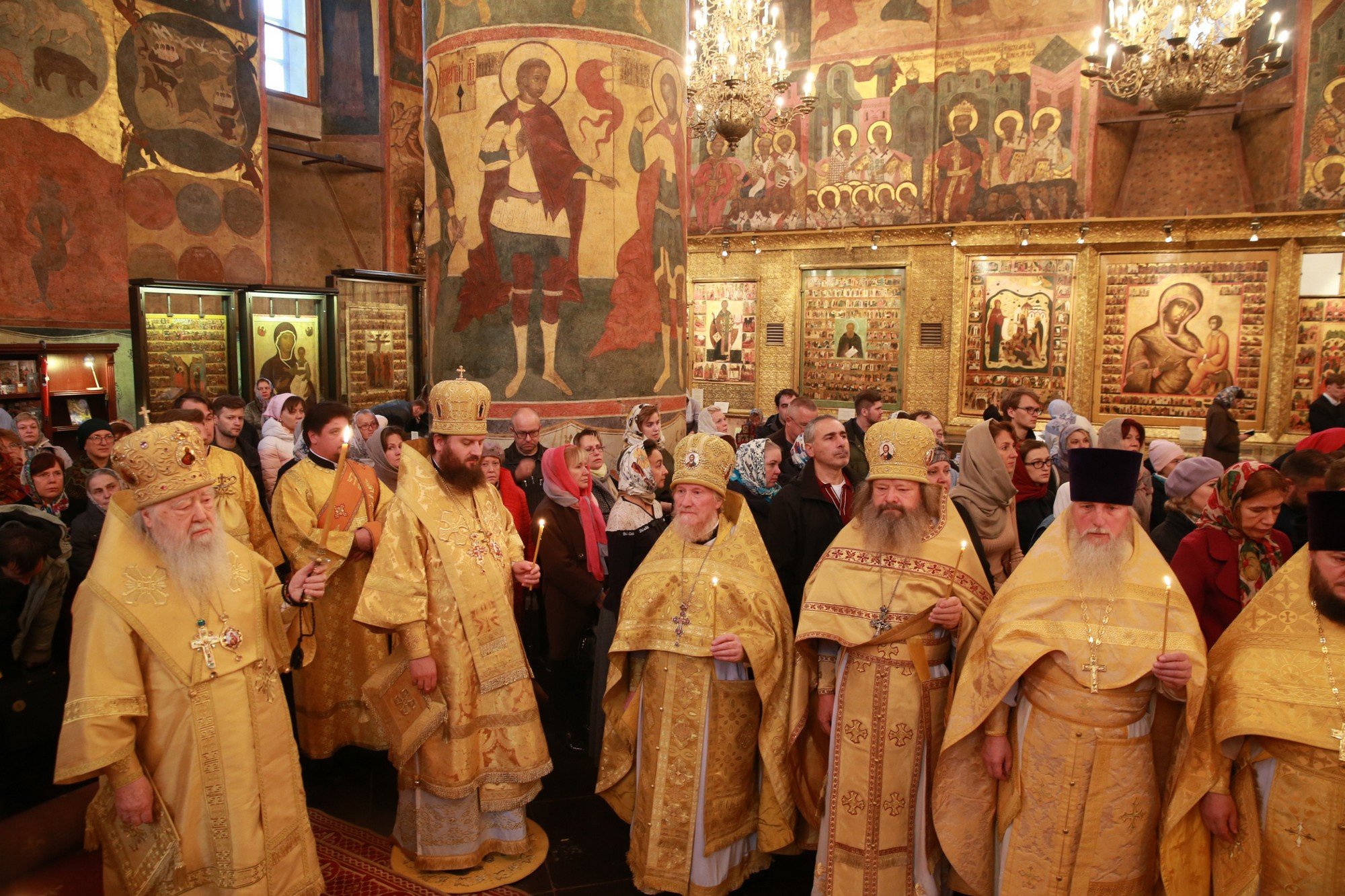 Дорогие братья архипастыри, отцы, братья и сестры! Его Святейшество Святейший Патриарх Московский и всея Руси Кирилл даровал нам великую радость, благословив вместе с московским духовенством и священнослужителями Московской епархии совершить здесь Божественную литургию. Я горячо и сердечно поздравляю всех вас с праздником, причастников и причастниц — с принятием Святых Христовых Таин. Говоря церковным языком, сегодня обильна наша духовная трапеза, потому что мы продолжаем празднование в честь Воздвижения Честнаго и Животворящего Креста Господня и духовно утешаемся, что с тех далеких времен непобедимая и непостижимая и Божественная сила Креста ведет каждого из нас ко спасению, к жизни вечной. Сегодня мы празднуем память двух святителей, Киприана и Фотия, которые в далеком XV веке возглавляли нашу Церковь. История донесла до нас свидетельства об их любви к народу Божию, о верности Церкви Христовой и о трудах по укреплению Московской кафедры. Сегодня мы счастливы, что совершили Божественную литургию у их святых мощей и испрашивали Божие благословение и их небесного предстательства за Отечество наше, Церковь нашу и каждого из нас.