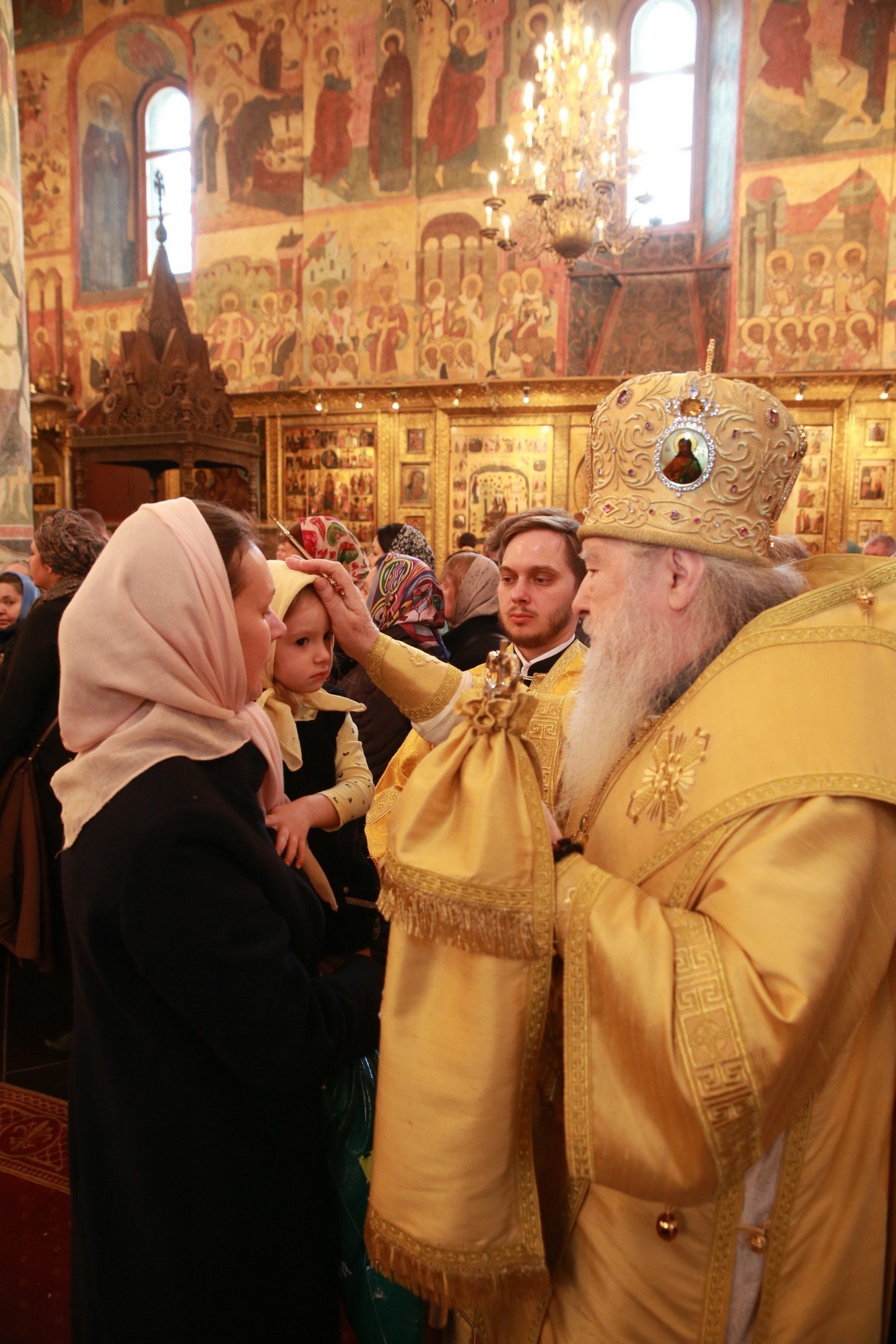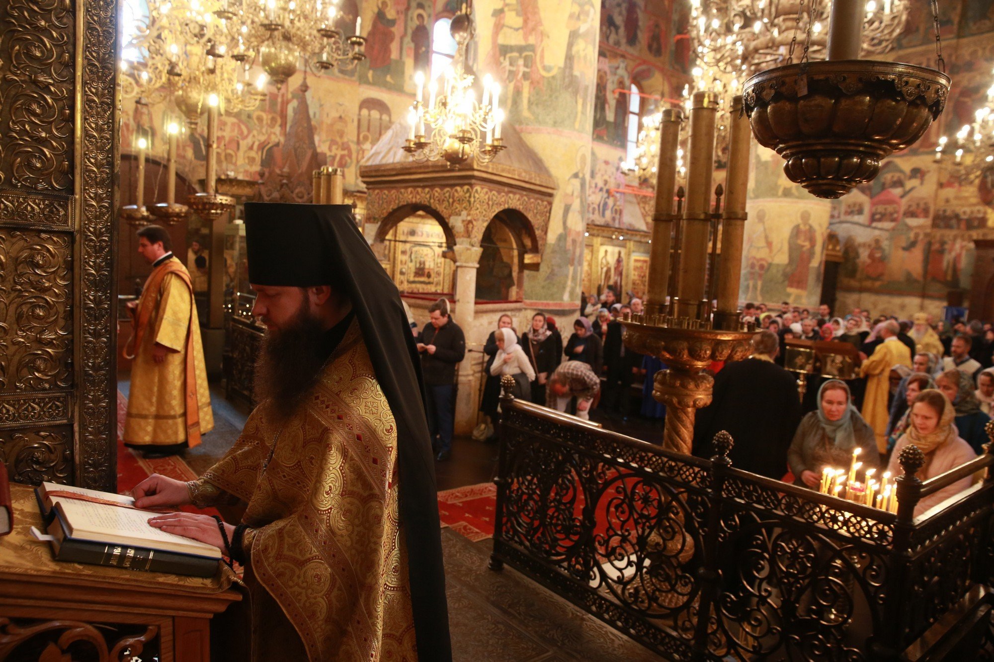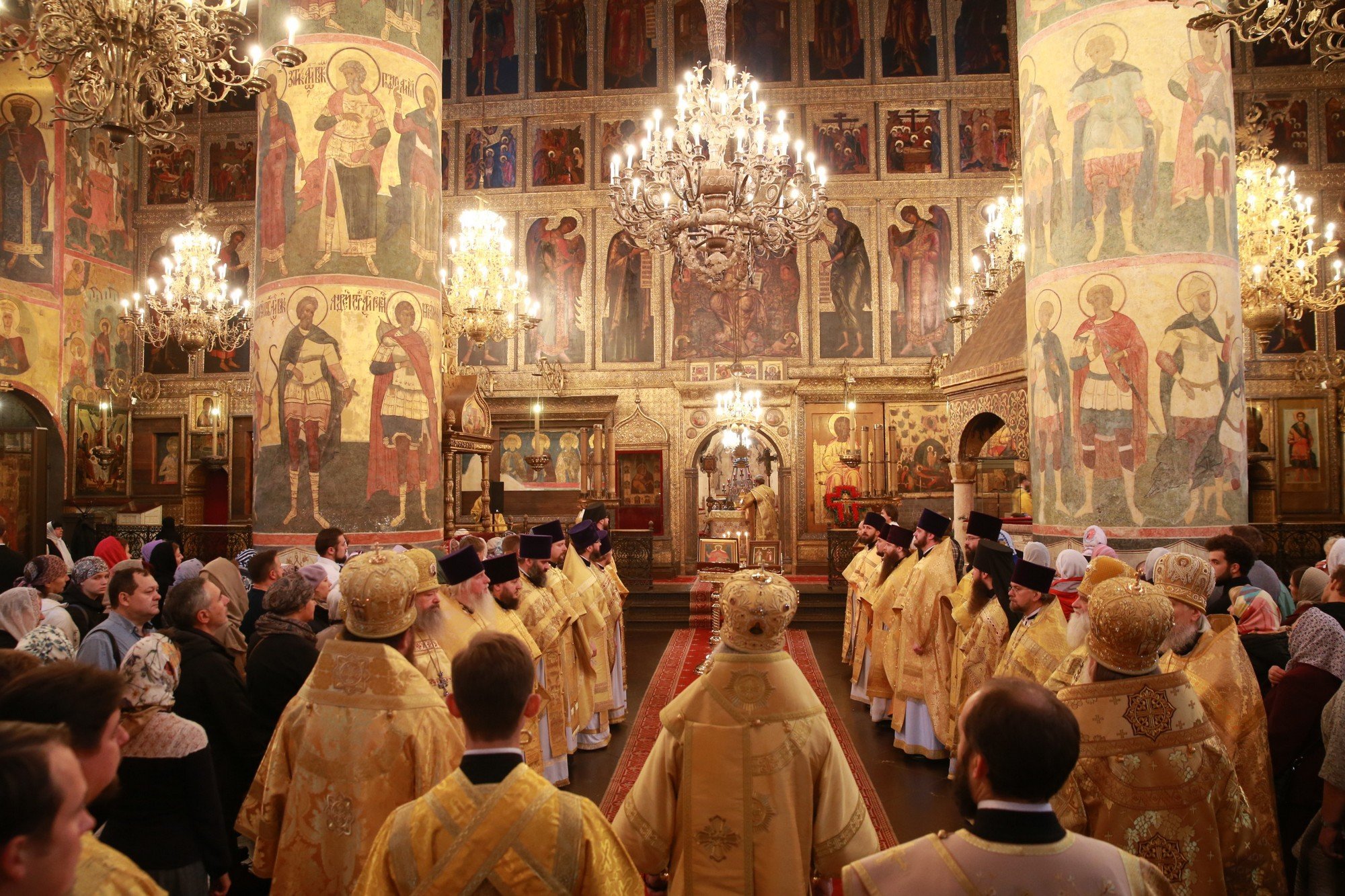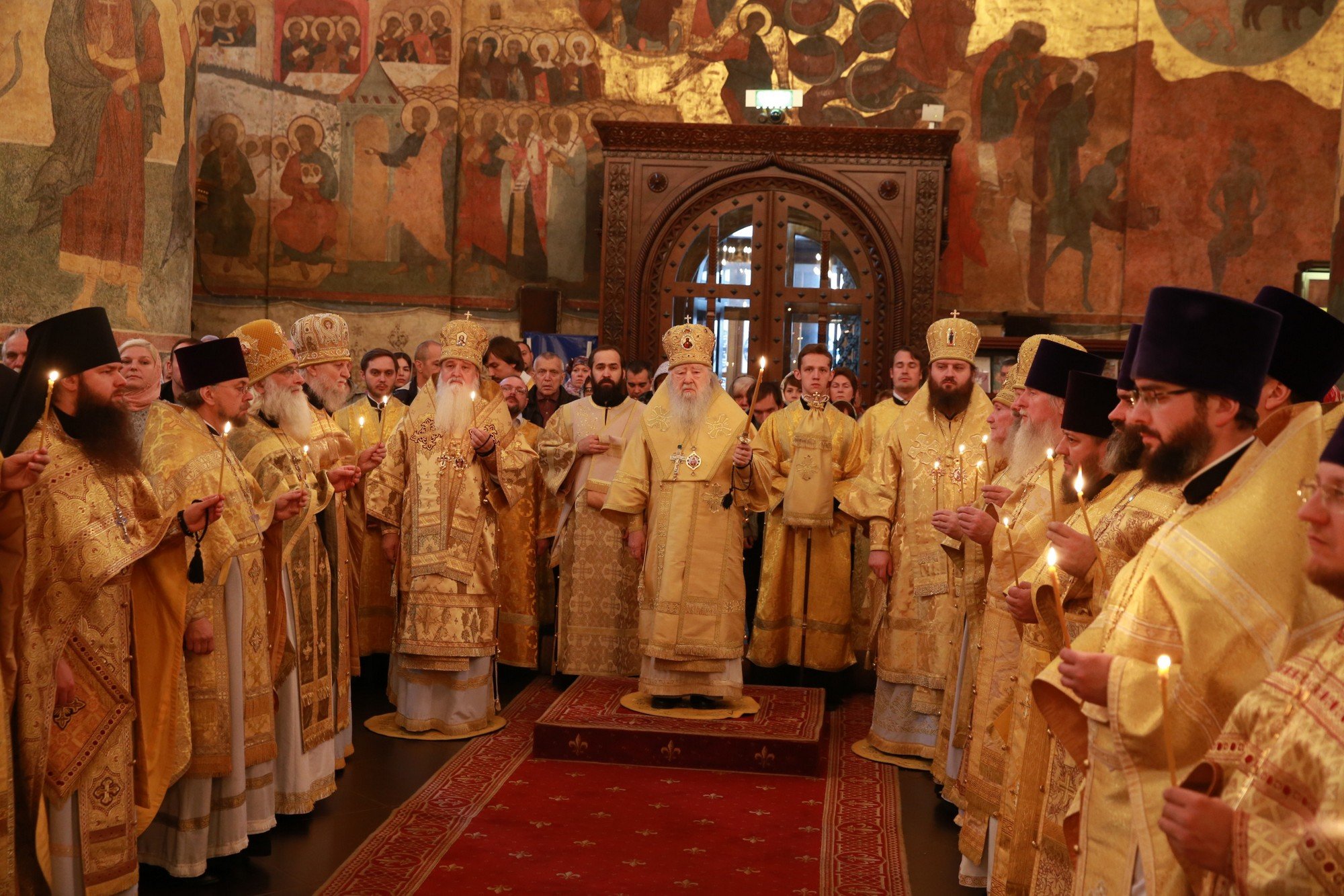Дорогие братья архипастыри, отцы, братья и сестры! Его Святейшество Святейший Патриарх Московский и всея Руси Кирилл даровал нам великую радость, благословив вместе с московским духовенством и священнослужителями Московской епархии совершить здесь Божественную литургию. Я горячо и сердечно поздравляю всех вас с праздником, причастников и причастниц — с принятием Святых Христовых Таин. Говоря церковным языком, сегодня обильна наша духовная трапеза, потому что мы продолжаем празднование в честь Воздвижения Честнаго и Животворящего Креста Господня и духовно утешаемся, что с тех далеких времен непобедимая и непостижимая и Божественная сила Креста ведет каждого из нас ко спасению, к жизни вечной. Сегодня мы празднуем память двух святителей, Киприана и Фотия, которые в далеком XV веке возглавляли нашу Церковь. История донесла до нас свидетельства об их любви к народу Божию, о верности Церкви Христовой и о трудах по укреплению Московской кафедры. Сегодня мы счастливы, что совершили Божественную литургию у их святых мощей и испрашивали Божие благословение и их небесного предстательства за Отечество наше, Церковь нашу и каждого из нас.