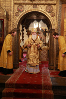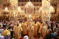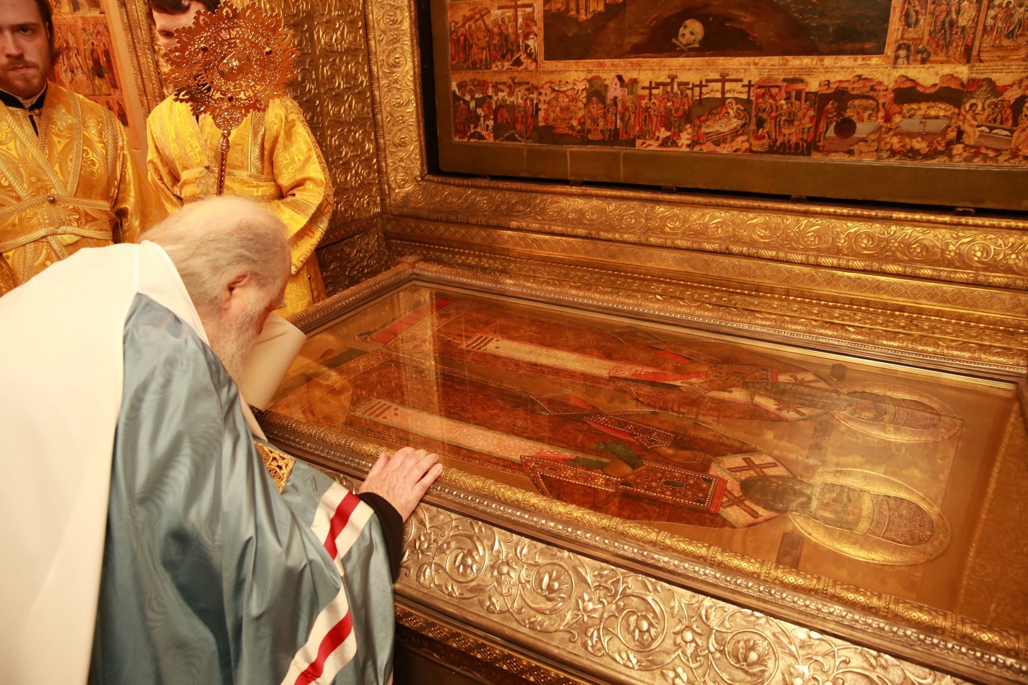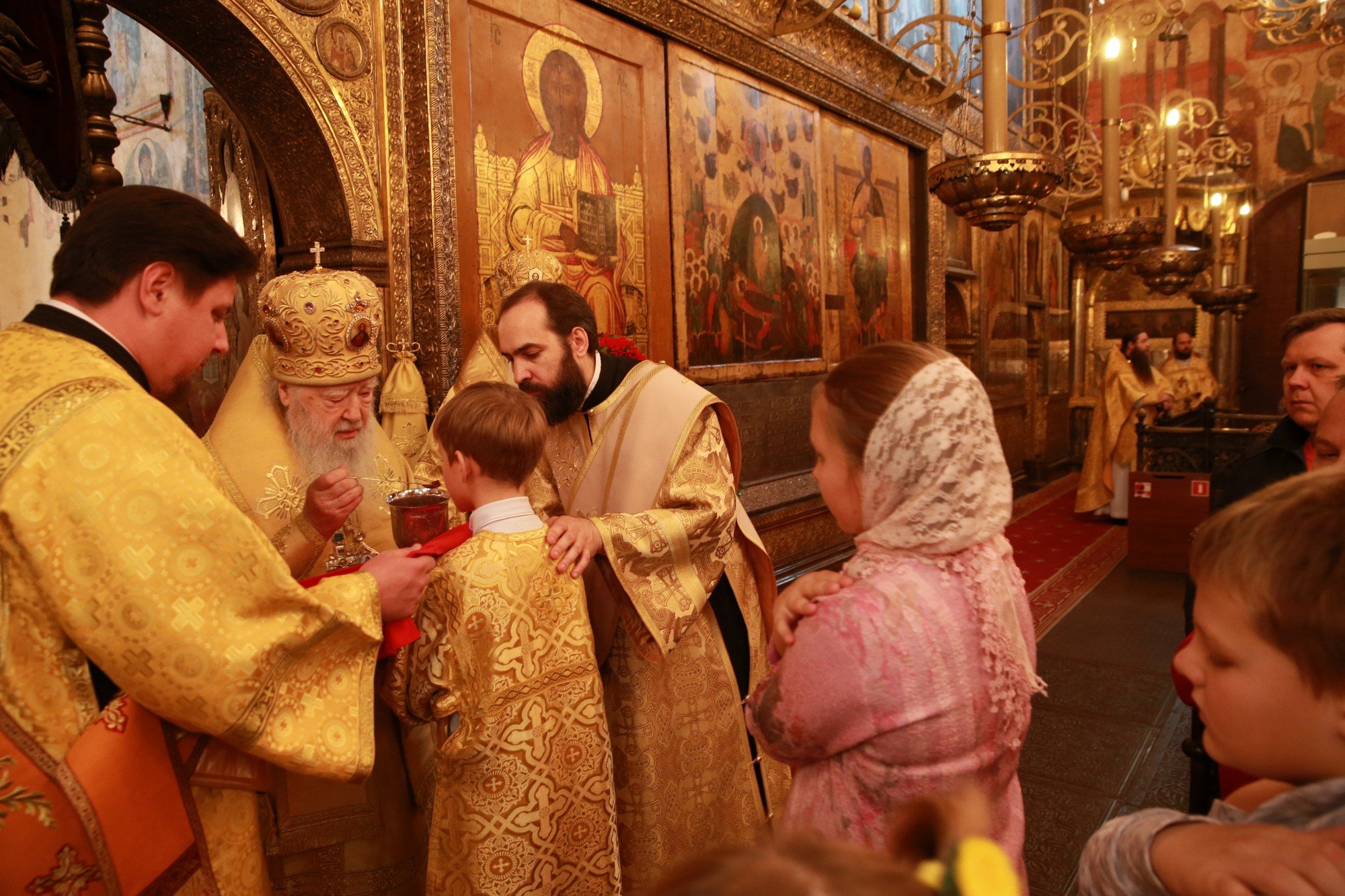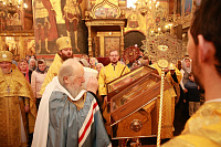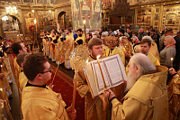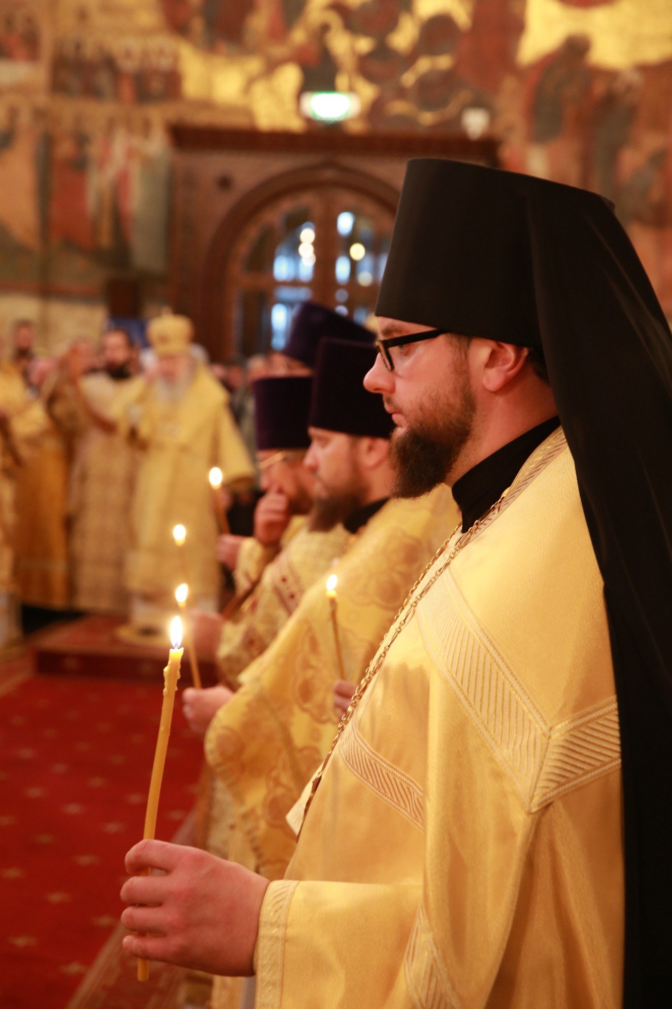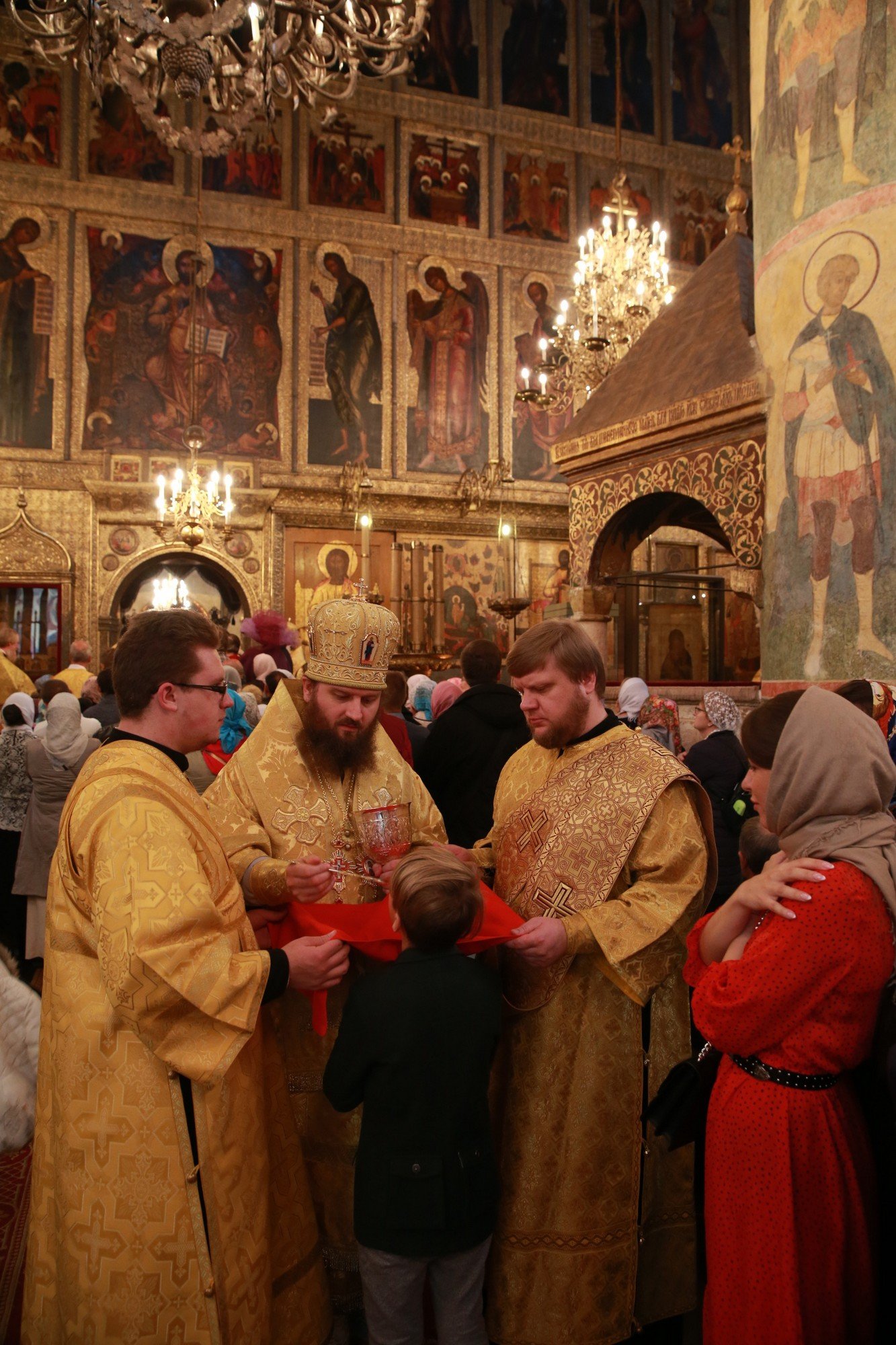 Дорогие братья архипастыри, отцы, братья и сестры! Его Святейшество Святейший Патриарх Московский и всея Руси Кирилл даровал нам великую радость, благословив вместе с московским духовенством и священнослужителями Московской епархии совершить здесь Божественную литургию. Я горячо и сердечно поздравляю всех вас с праздником, причастников и причастниц — с принятием Святых Христовых Таин. Говоря церковным языком, сегодня обильна наша духовная трапеза, потому что мы продолжаем празднование в честь Воздвижения Честнаго и Животворящего Креста Господня и духовно утешаемся, что с тех далеких времен непобедимая и непостижимая и Божественная сила Креста ведет каждого из нас ко спасению, к жизни вечной. Сегодня мы празднуем память двух святителей, Киприана и Фотия, которые в далеком XV веке возглавляли нашу Церковь. История донесла до нас свидетельства об их любви к народу Божию, о верности Церкви Христовой и о трудах по укреплению Московской кафедры. Сегодня мы счастливы, что совершили Божественную литургию у их святых мощей и испрашивали Божие благословение и их небесного предстательства за Отечество наше, Церковь нашу и каждого из нас.