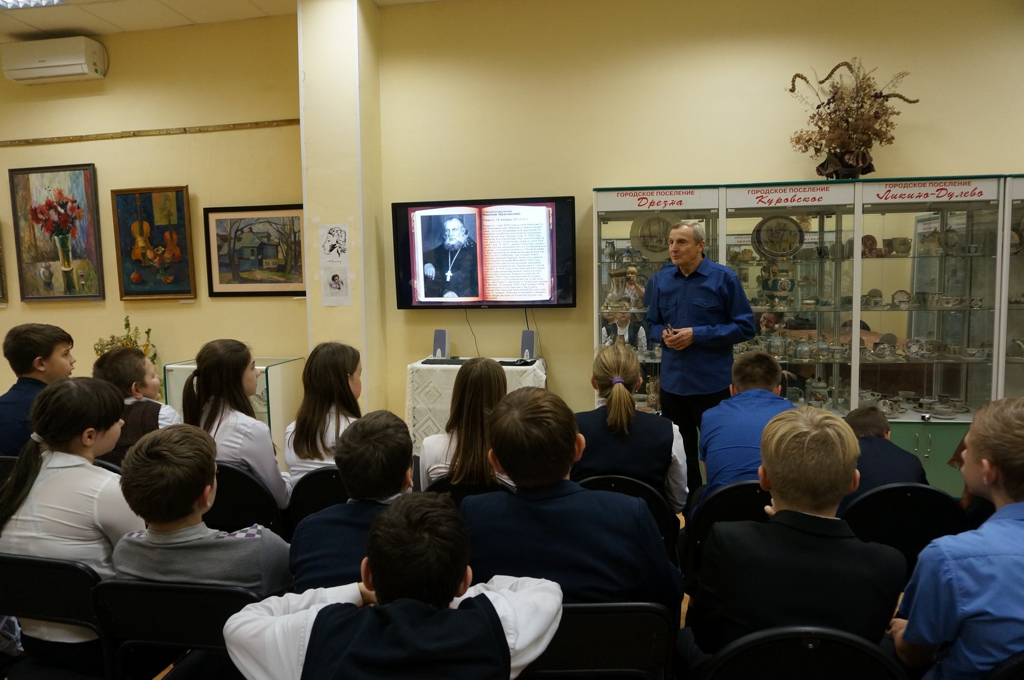 24 октября в краеведческом музее городского округа Ликино-Дулево состоялась встреча учащихся 7-8 классов школ округа с местными краеведами, посвященная Дню памяти жертв политических репрессий. Помощник настоятеля Иоанно-Богословского храма г. Ликино-Дулево, руководитель приходского краеведческого общества Е. А. Шалманов рассказал детям о пострадавших за веру и о разрушенных храмах благочиния.