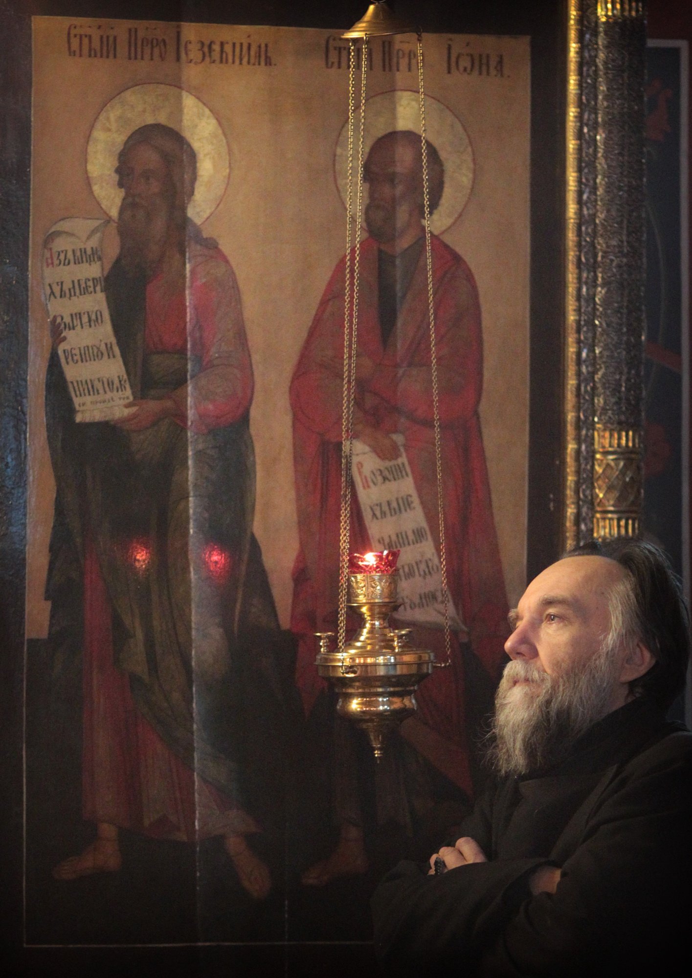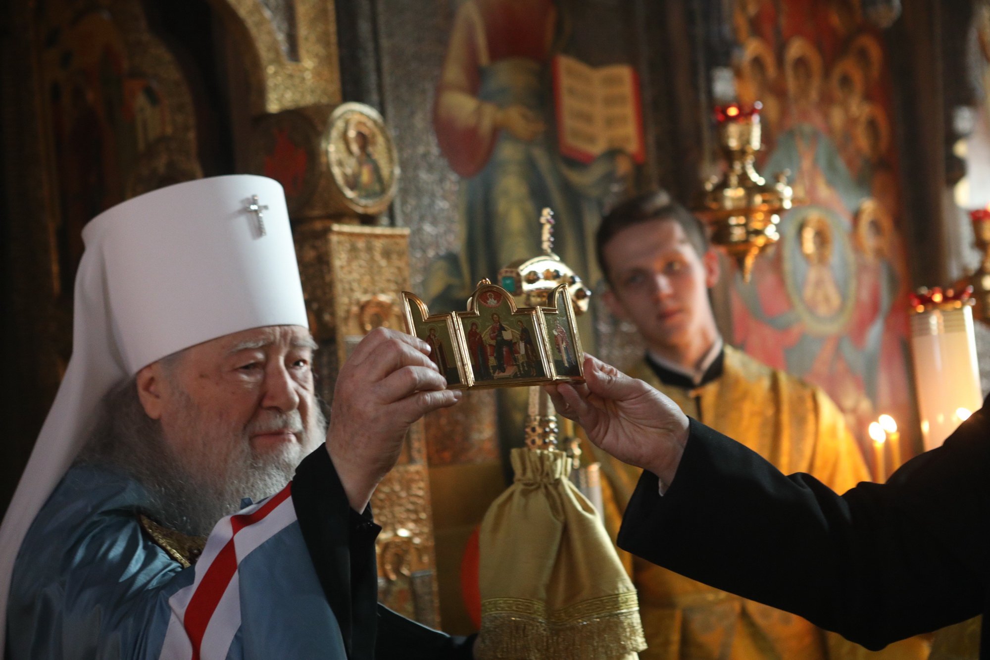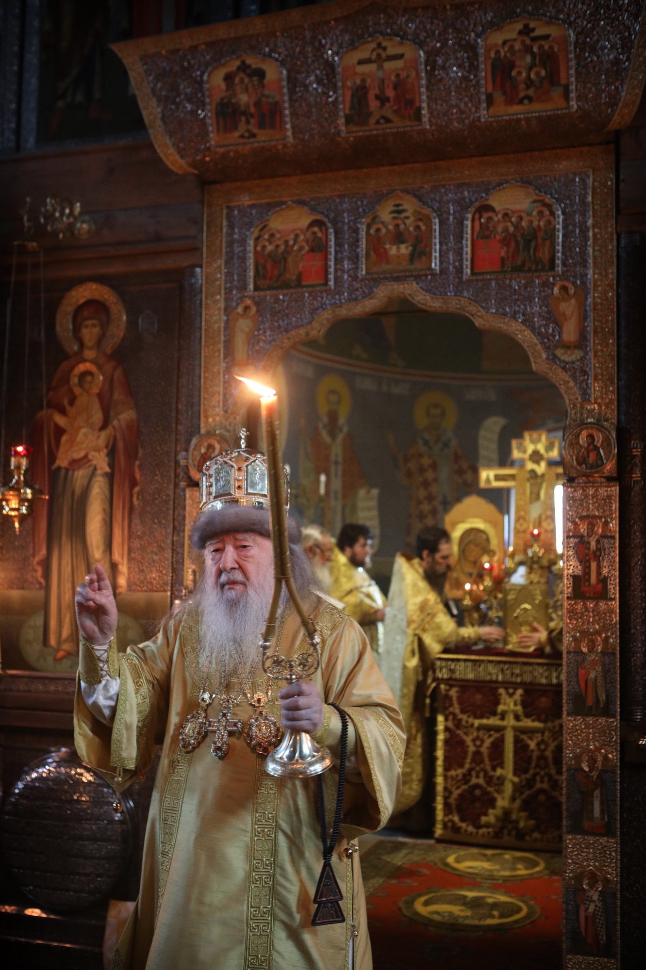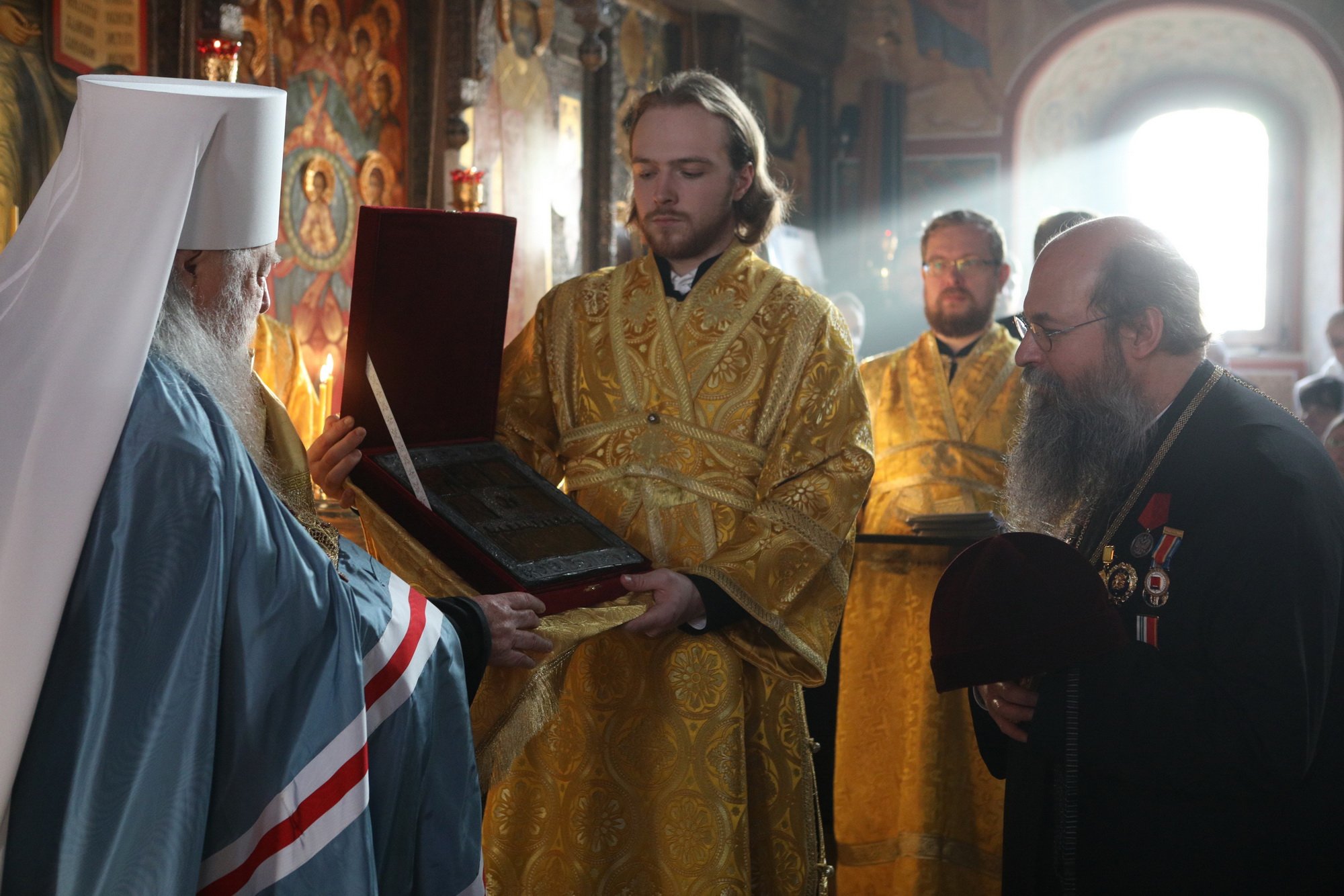 В памятование о нашей сыновней любви примите этот святой образ, выполненный в лучших традициях древнерусской иконописи. На нем в молитвенном предстоянии пред Господом-Вседержителем изображены Его Пречистая Матерь и Иоанн Креститель, а также Ваши небесные покровители: равноапостольный великий князь Владимир Киевский, в честь которого Вы были наречены во святом Крещении, и святитель Ювеналий Иерусалимский, имя которого Вы носите в ангельском чине. В нынешнем году исполнилось 60 лет с того дня, как Вы были рукоположены в сан иеродиакона и начали свой путь священнослужителя, а в следующем году мы будем чествовать Ваш 55-летний юбилей служения в святительском сане. Едва ли можно назвать другого церковного деятеля как в Русской, так и во Вселенской Церкви, как в современности, так и в прошлом, кто смог бы такое продолжительное время плодотворно и неустанно отдавать всего себя на служение Господу и Его Церкви. Все это время Вы, дорогой наш Владыка, подобно святым угодникам Божиим, которых мы видим на иконах склонившимися в молении перед Господом, предстательствуете о своей пастве, воссылая свои горячие молитвы Спасителю.