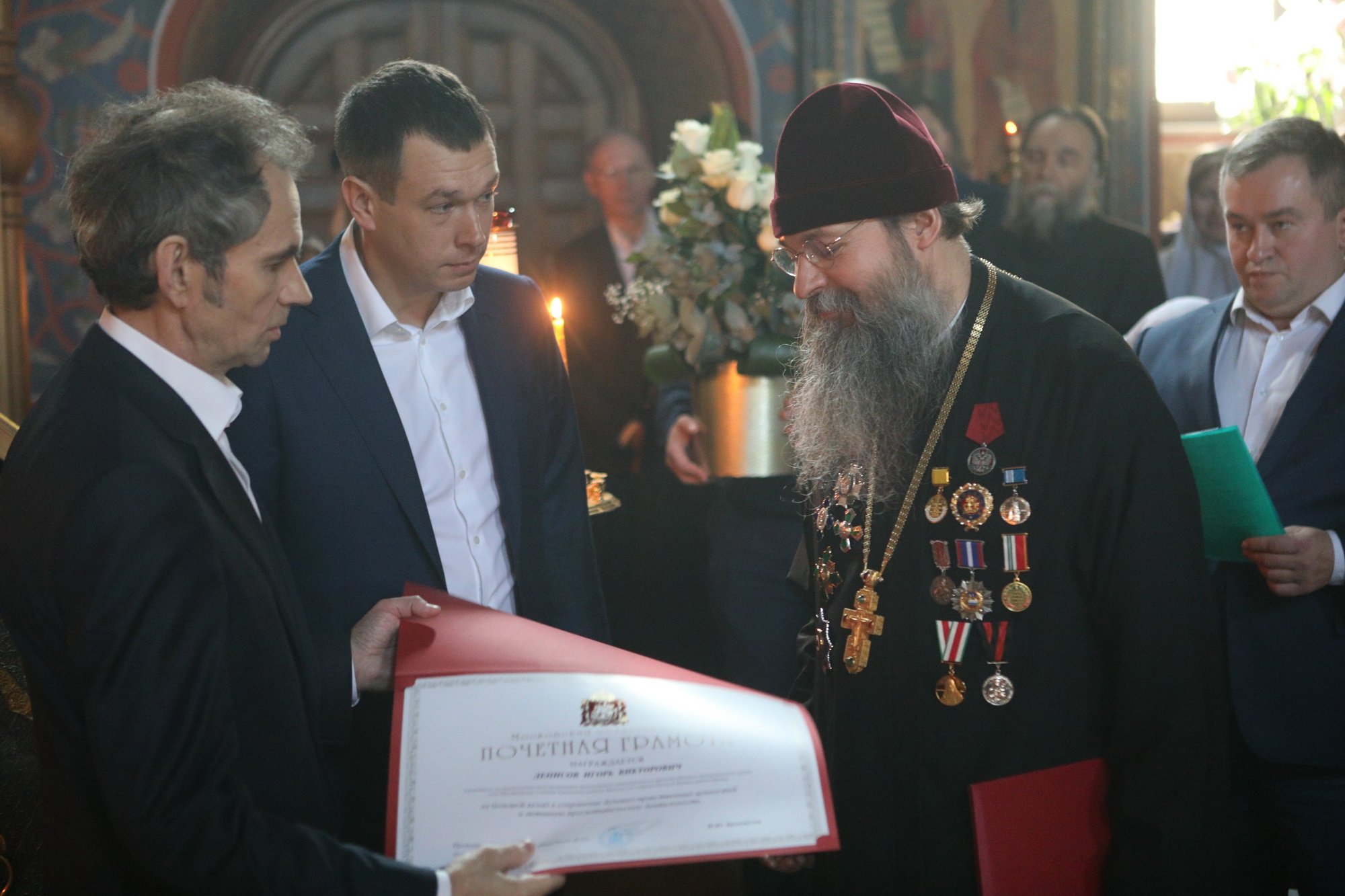 В.В. Неволин вручил архимандриту Иринарху, протоиерею Евгению Саранче, священнику Валерию Булычеву знаки отличия за заслуги перед Раменским районом за добросовестный труд, успешное выполнение возложенных поручений, исключительный вклад в восстановление Михаило-Архангельского храма.