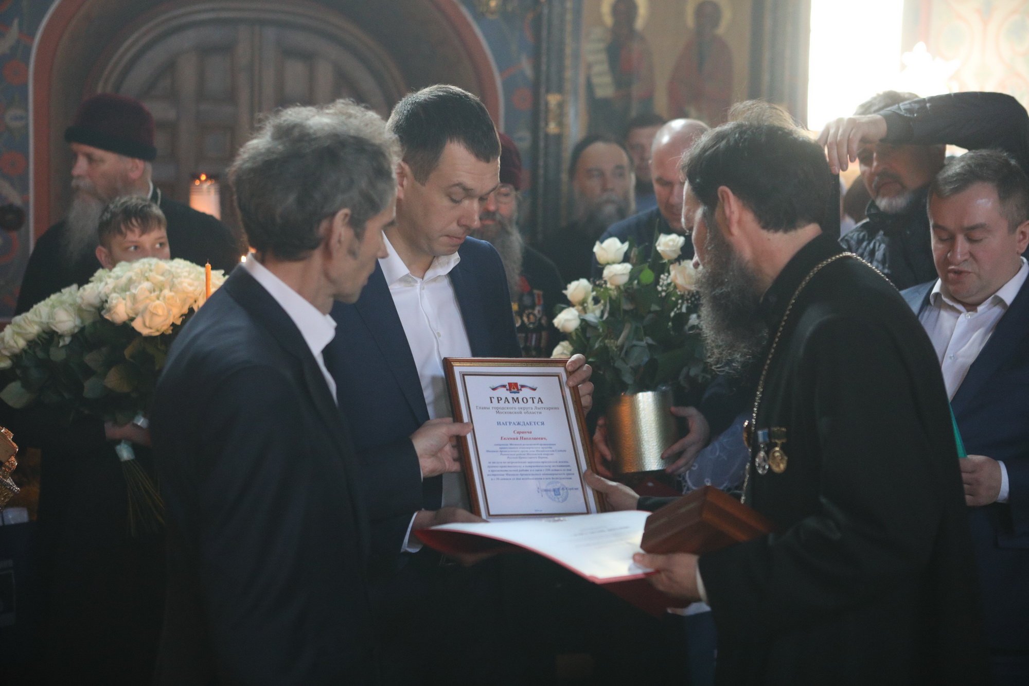 Е.В. Серегин преподнес Его Высокопреосвященству памятный подарок, после чего вручил награды клирикам Михаило-Архангельского храма за большой вклад в сохранение духовно-нравственных ценностей и активную просветительскую деятельность, а также в связи с 330-летием со дня построения Михаило-Архангельского единоверческого храма. Архимандрит Иринарх был удостоен почетной грамоты Московской областной думы и знаком отличия «За заслуги перед городом Лыткарино»; протоиерей Евгений Саранча и священник Валерий Булычев — почетных грамот Московской областной думы и грамот главы городского округа Лыткарино.