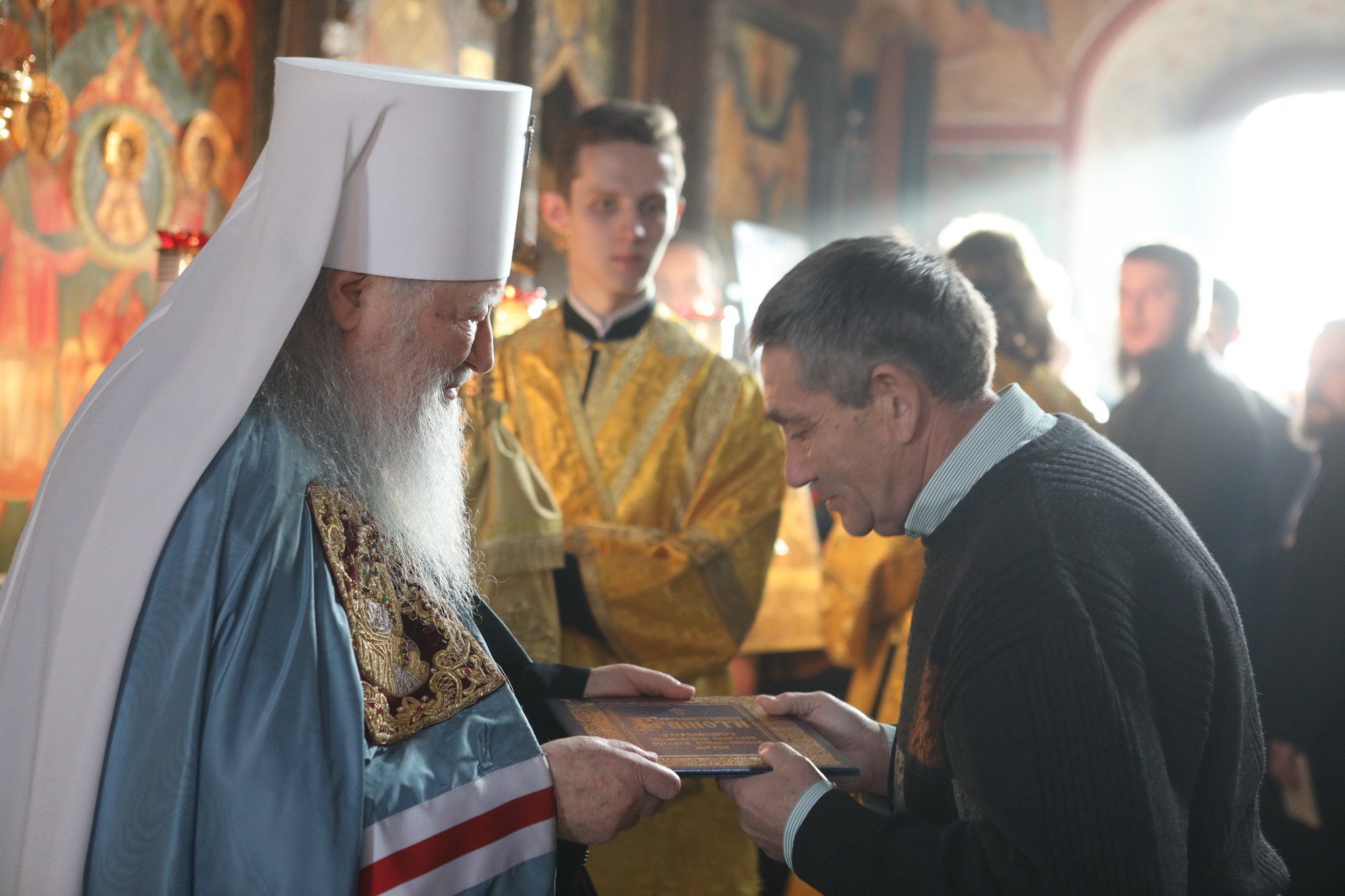 Дорогой отец архимандрит, я хотел бы на молитвенную память вручить Вам этот древний образ, чтобы, молясь перед ним, вы вспоминали прожитые годы — радостные и трудные одновременно, потому что не легко поднимать из руин порушенные святыни. Примите этот образ, как выражение моей любви к Вам, к вашему приходу и духовенству, в надежде, что еще многие годы Вы будете так же усердно служить Господу и Спасителю нашему и воспитывать свою паству и будущих пастырей. Пусть Господь хранит Вас на многая лета!