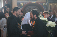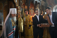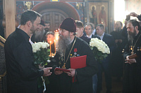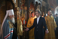 Ваше Высокопреосвященство, дорогой Владыка митрополит, уважаемый архимандрит Иринарх, братья и сестры! Хочу поздравить вас с праздником, с памятной датой этого замечательного храма! Мы знаем, что Вы очень любите его и в течении многих лет неизменно приезжаете сюда для того, чтобы вместе с прихожанами молиться на Божественной литургии. Ваши молитвы для нас очень важны! Вы верный архипастырь, надежный друг и очень добрый человек. Многое сделано Вами: возрождаются храмы, восстанавливаются порушенные святыни. Я хочу поблагодарить Вас за совместную молитву, пожелать Вам здравия, и чтобы Вы как можно дольше были рядом с нами.