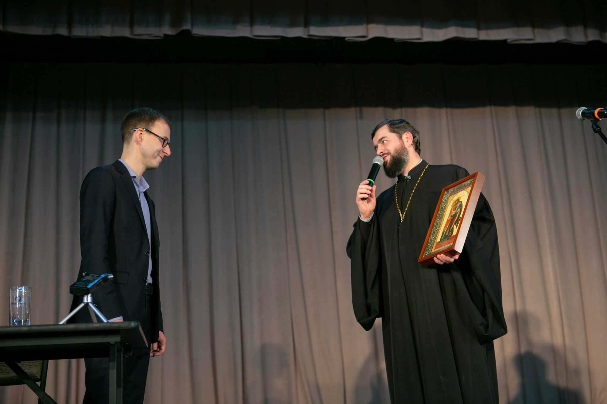 1 декабря в здании Чеховского городского дома культуры состоялась творческая встреча с православным журналистом Константином Мацаном. В зале присутствовало духовенство Чеховского, Подольского и Серпуховского благочиний, насельники Вознесенской Давидовой пустыни, журналисты, прихожане чеховских храмов. Гость ответил на многочисленные вопросы аудитории, в частности, была поднята тема миссионерского служения священнослужителей и мирян. Завершая встречу, благочинный Чеховского округа священник Константин Александров поблагодарил Константина Мацана за беседу и преподнес ему в дар икону Зачатия Пресвятой Богородицы – копию иконы из Зачатьевского храма г. Чехова.