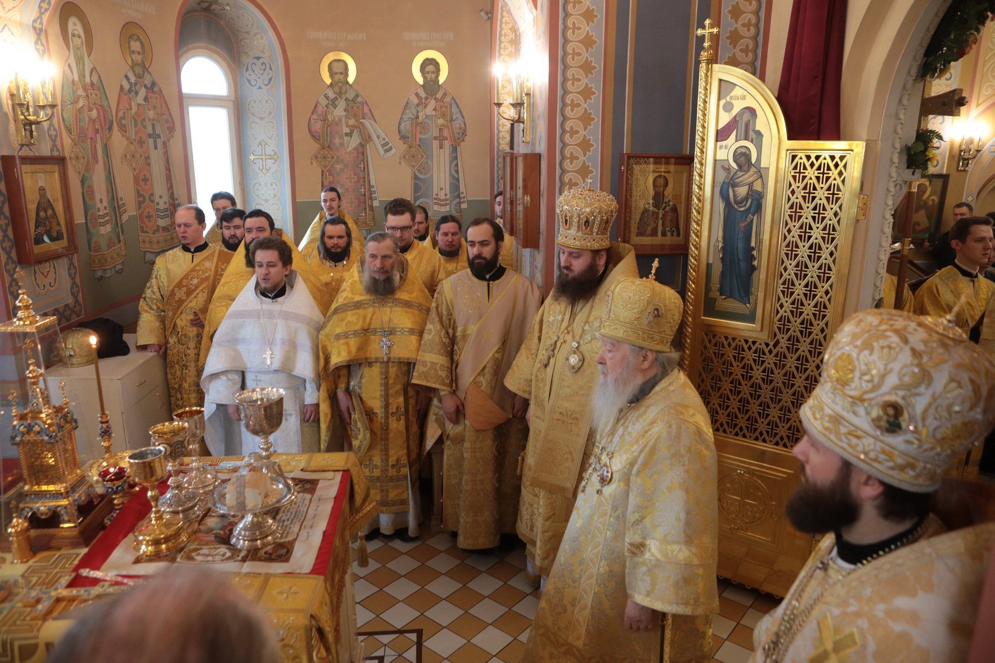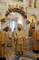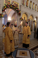 На Божественной литургии в Трехсвятительском храме Его Высокопреосвященству сослужили ректор КДС епископ Зарайский Константин, благочинный города Коломны и Коломенского района епископ Луховицкий Петр, почетный настоятель Успенского кафедрального собора города Коломны протоиерей Николай Качанкин, настоятель Старо-Голутвина монастыря игумен Варлаам (Горбунов), благочинный Богородского церковного округа протоиерей Марк Ермолаев, настоятель Знаменского храма деревни Комлево игумен Петр (Пузенко), духовенство благочиний города Коломны и Коломенского округа, преподаватели и студенты КДС в священном сане.