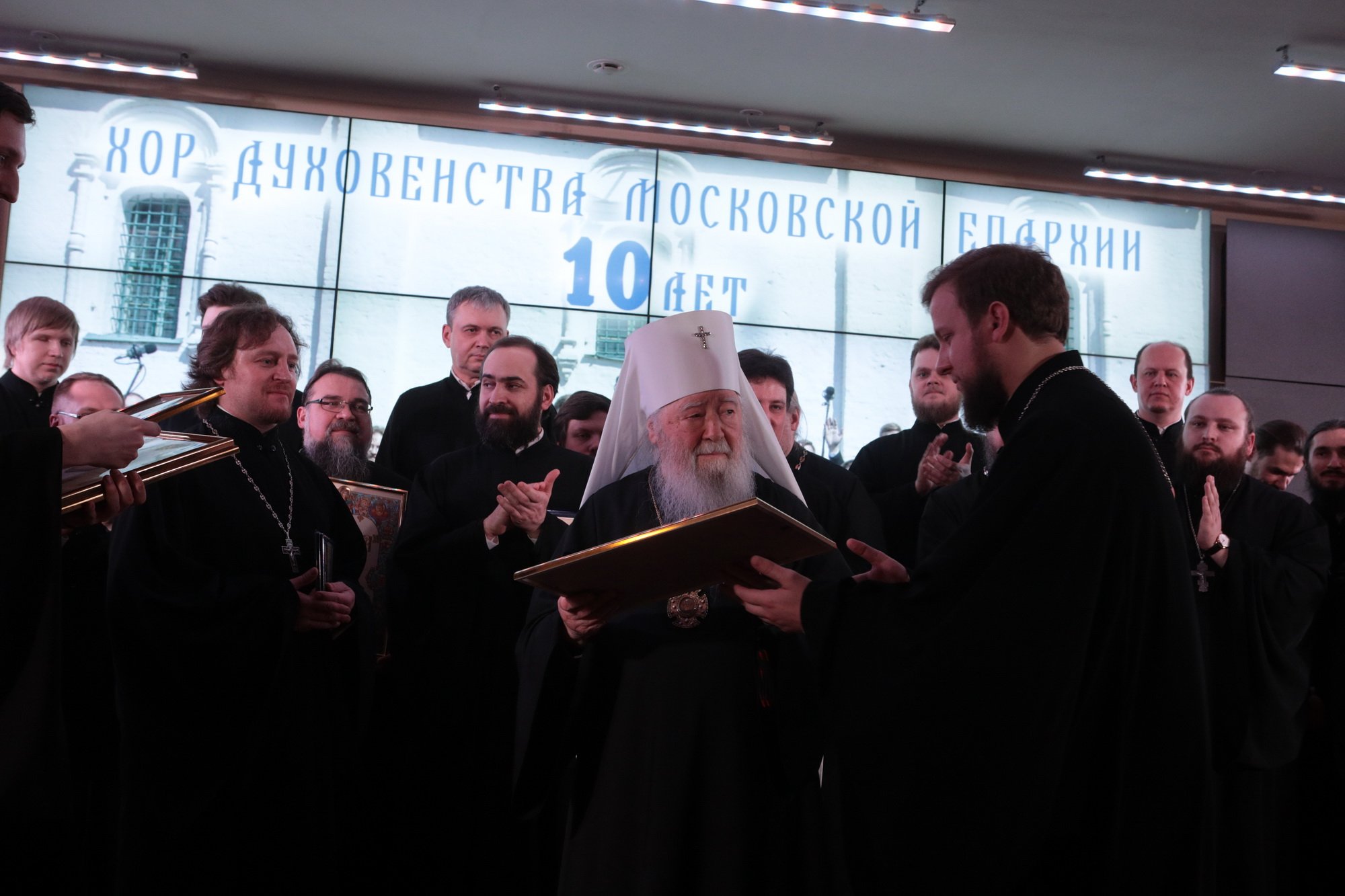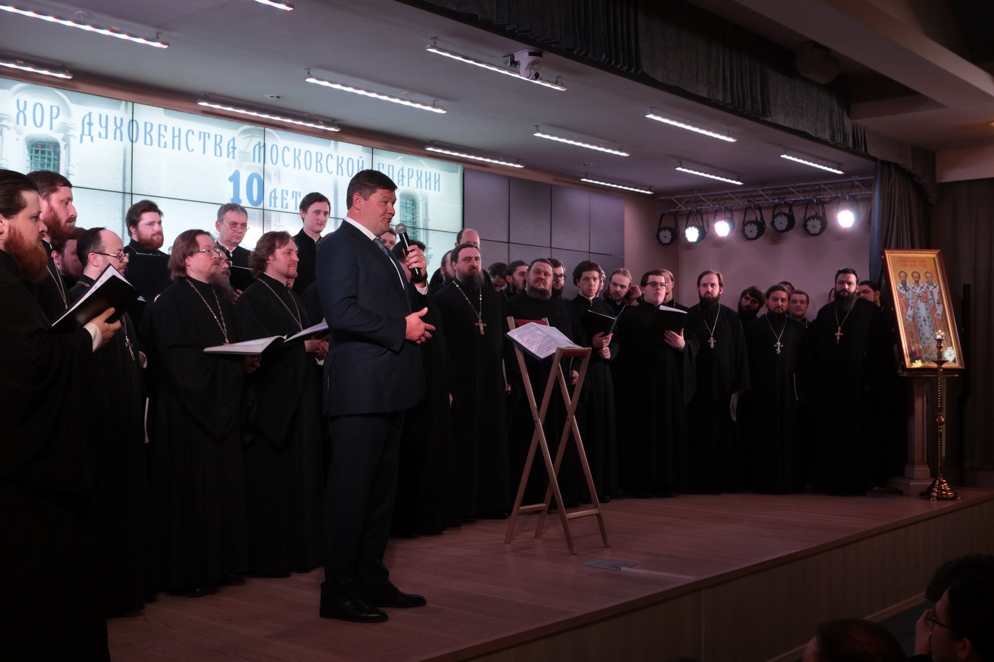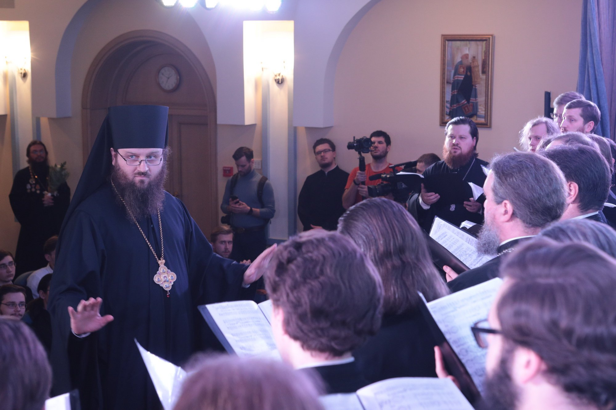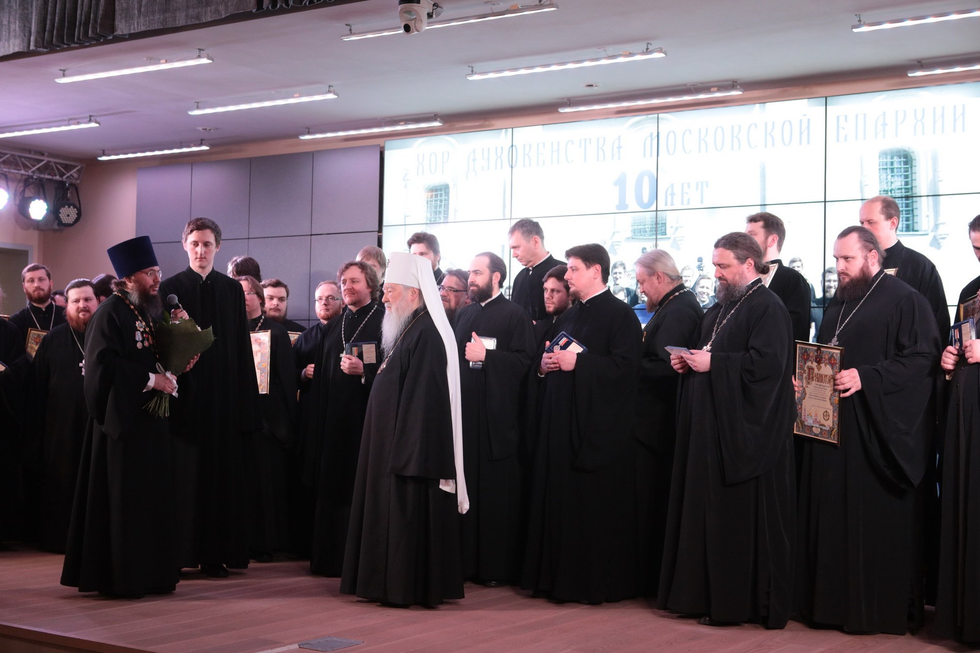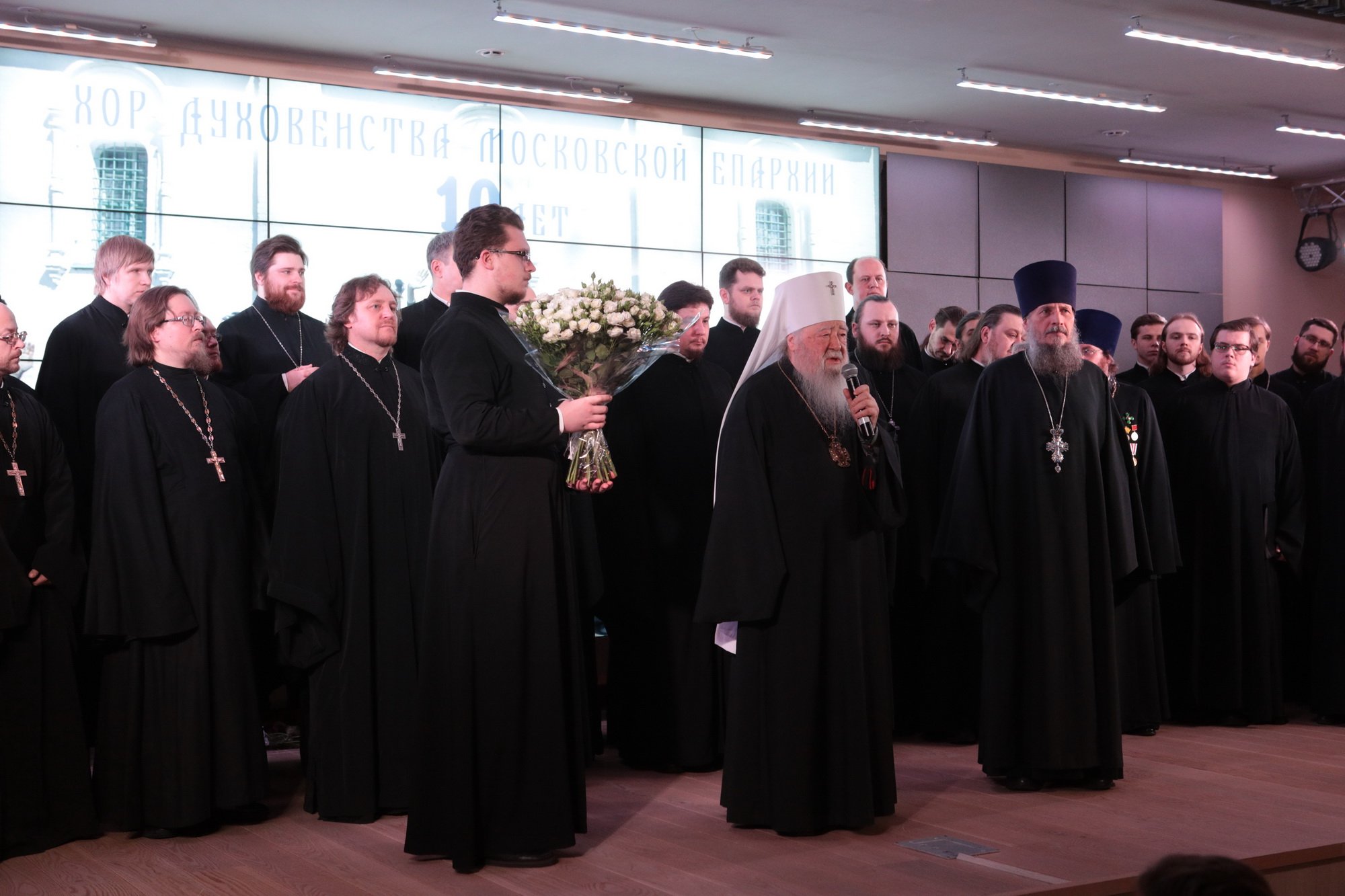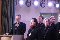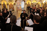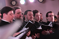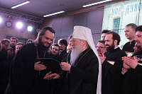 Дорогой Владыка Ювеналий, дорогой Владыка Петр, отцы, братья и сестры, я сердечно всех приветствую, поздравляю с престольным праздником и сегодняшним замечательным событием — 10-летием образования Хора духовенства Московской епархии. Когда мы говорим о церковном возрождении, то в первую очередь говорим о восстановлении порушенных святынь, строительстве храмов, открытии воскресных школ. Но церковное возрождение — это еще и возрождение церковного пения. На заре этого возрождения в Московской епархии появилось множество церковных хоров. Они были небольшие, даже если пели в городских храмах, и возникла необходимость создания большого епархиального хора. Четверть века назад, по благословению Владыки, трудами отца Николая и игумена Григория (Щелкунова) был создан хор студентов Коломенской духовной семинарии. Несмотря на небольшое число певчих и скромный репертуар, Владыка сразу стал выдвигать хор и на патриаршие, и на митрополичьи богослужения. Рубежной датой стало Рождество 1999 года, когда в Новодевичьем монастыре справа пел большой хор, а слева — семинарский хор, и, хотя на тот момент правый хор был сильнее, все понимали, что будущее за хором семинарским. К созданию Хора духовенства Московской епархии причастны иподиаконы Владыки Ювеналия. В 1990-х годах среди них оказалось несколько человек, которые имели опыт пения в хоре Троице-Сергиевой лавры под управлением архимандрита Матфея (Мормыля). Эти иподиаконы, я был в их числе, выступали несколько раз в телепередачах, пели на различных площадках и одновременно были иподиаконской командой. Был случай, который остался со мной на всю жизнь: в Страстную Пятницу в Новодевичьем монастыре половину службы пел правый хор, а половину — иподиаконы. Не все у нас получилось, но Владыка после службы сказал слова, которые остались со мной на всю жизнь: «Мне была важна ваша ревность, ваше усердие и желание». Когда в 2002 году я стал проректором по воспитательной работе, то одновременно возглавил хор. Хочу выразить большую благодарность игумену Петру (Пузенко), певчему хора, который в течение года успешно руководил хором семинарии.