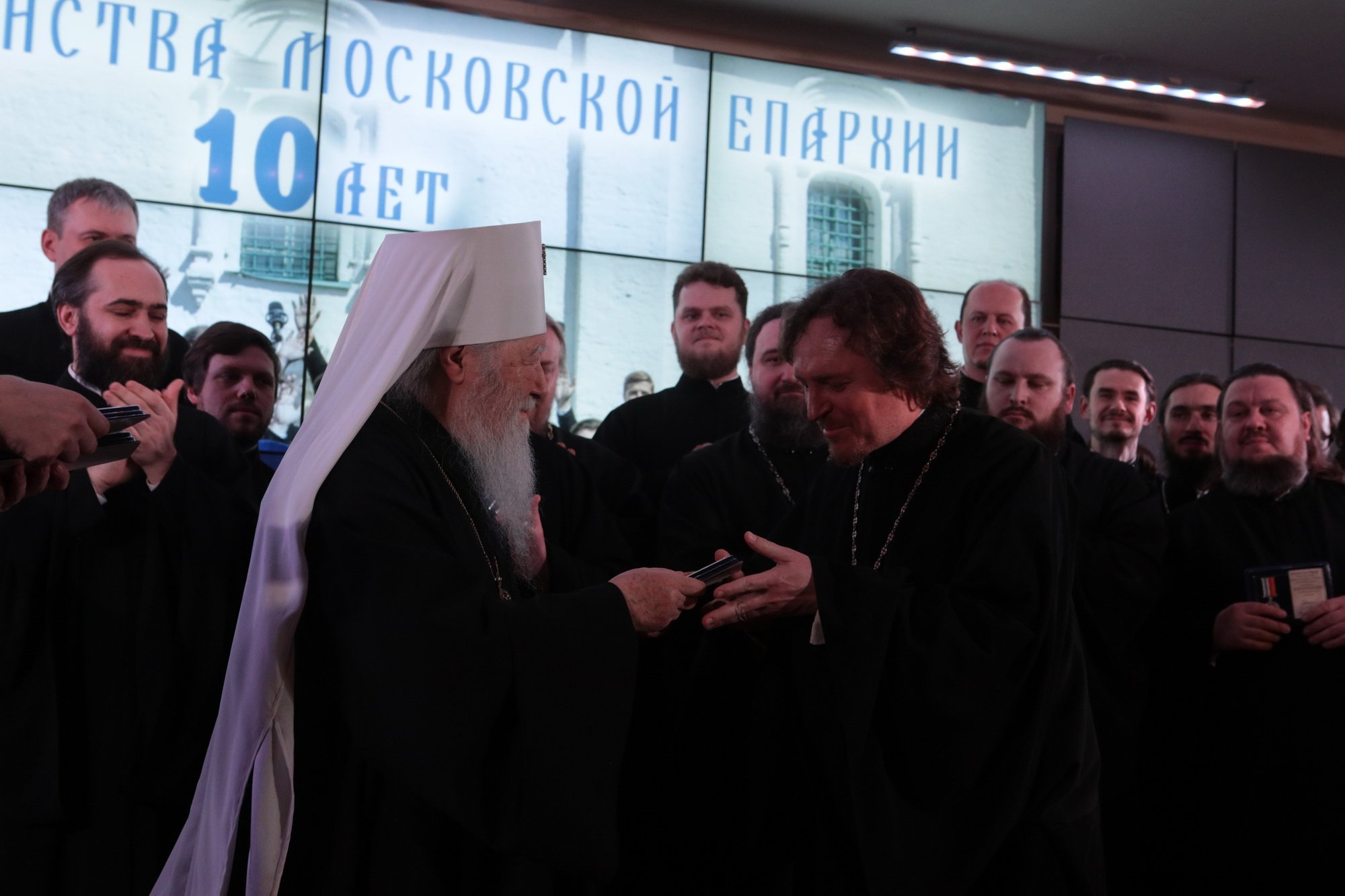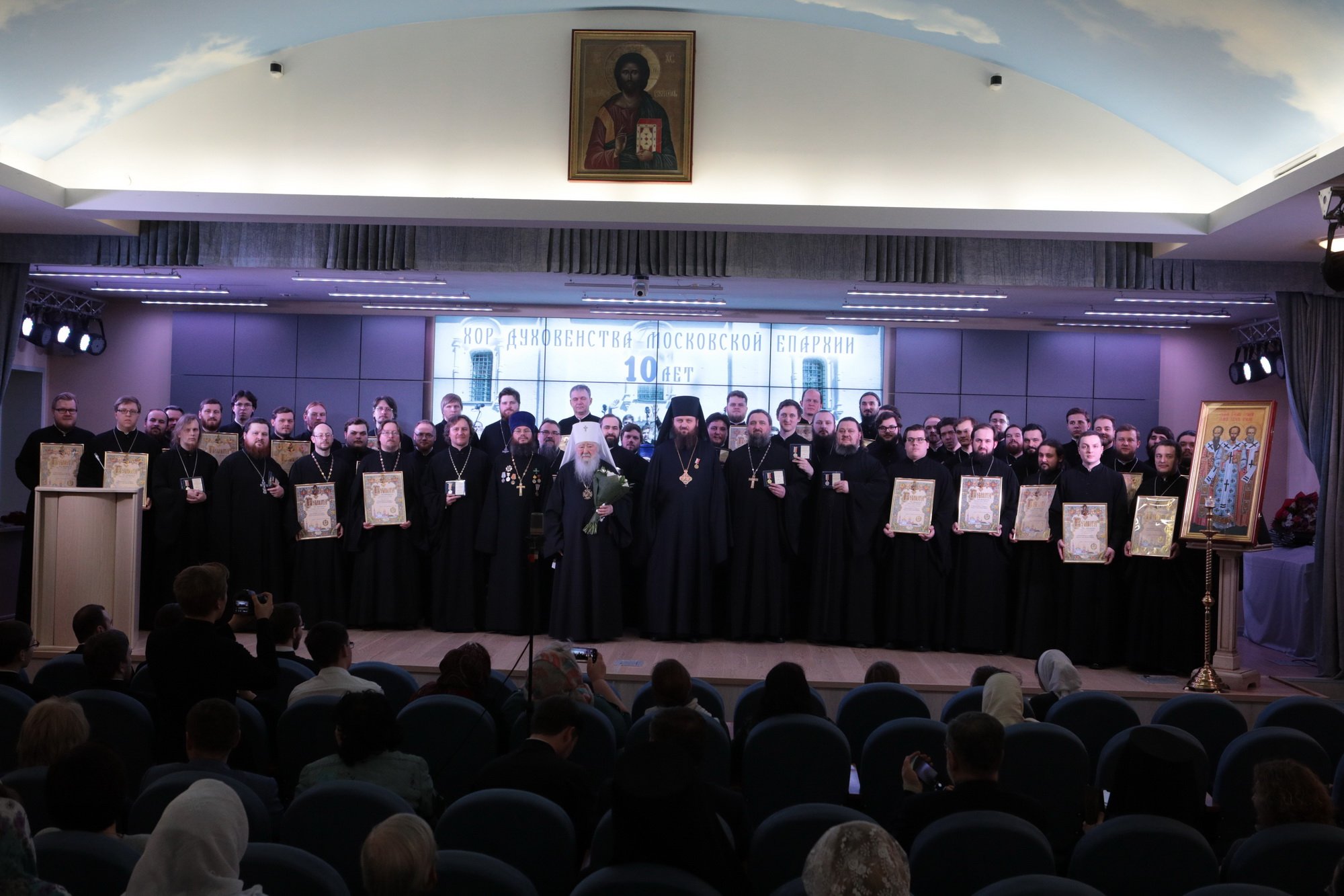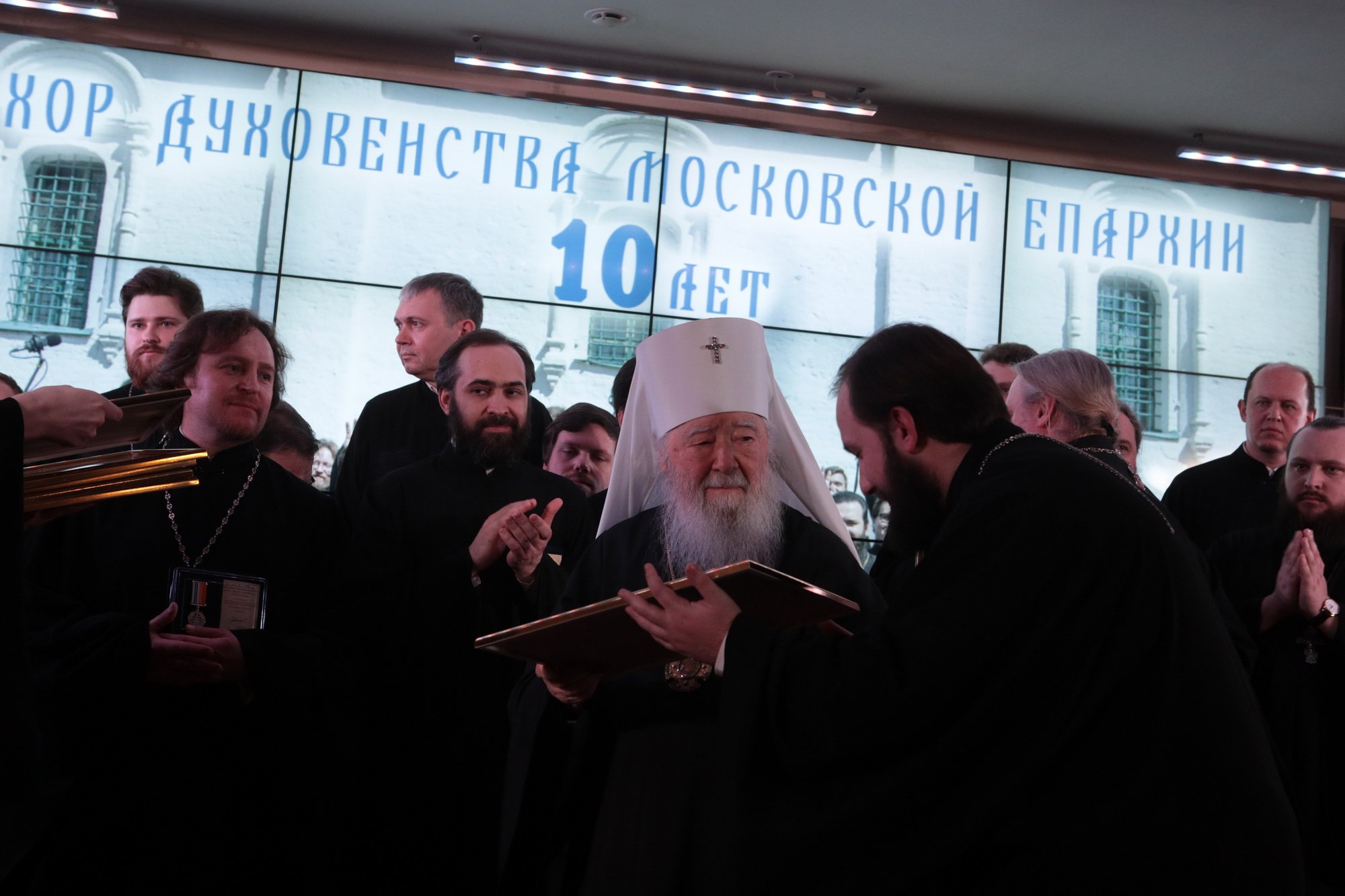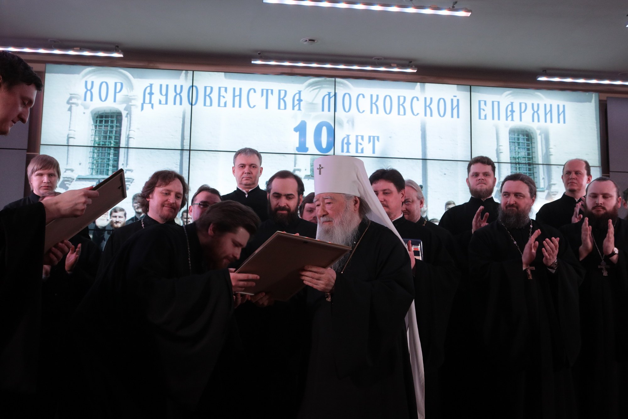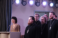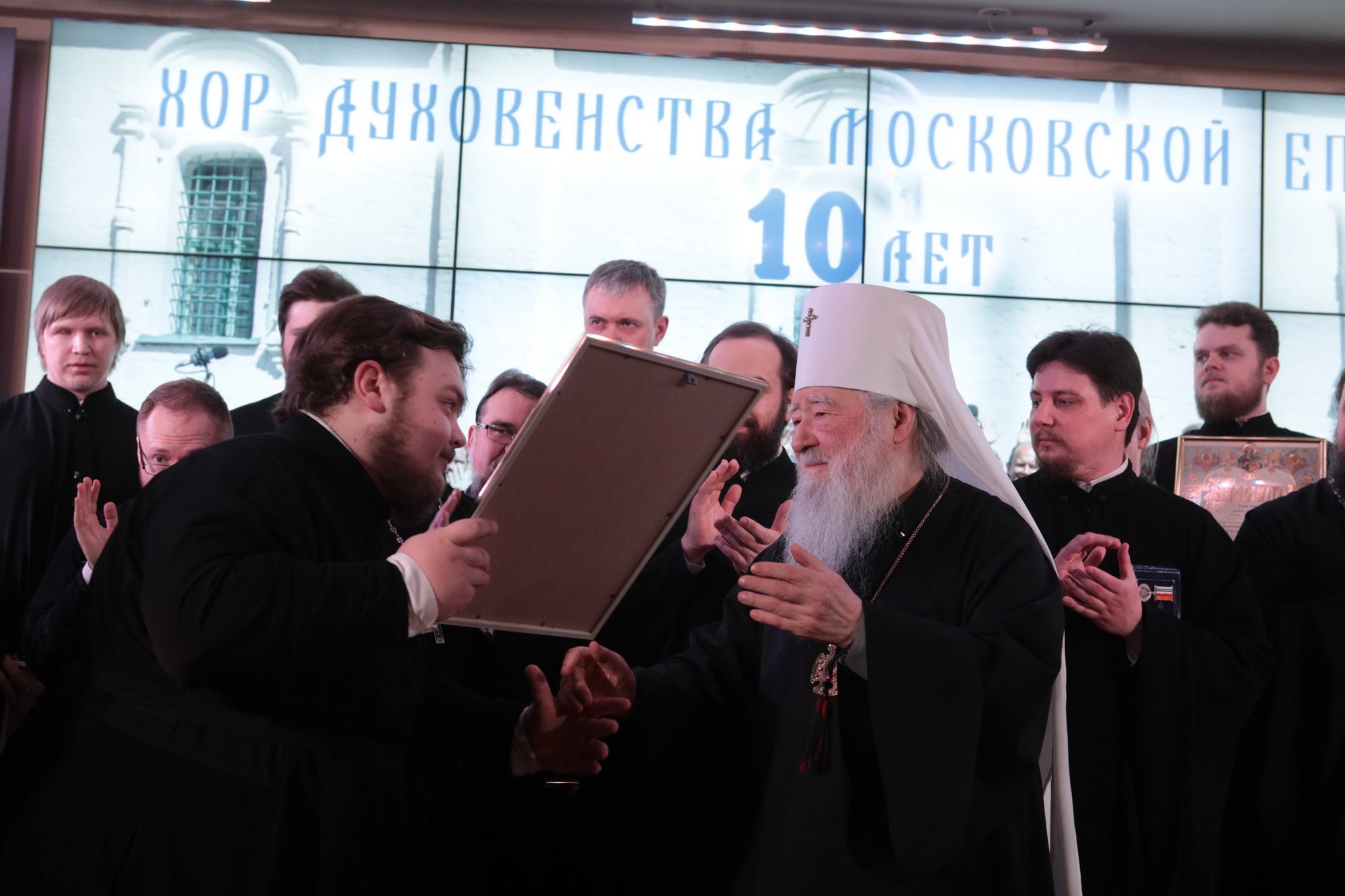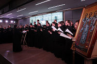 Дорогой Владыка Ювеналий, дорогой Владыка Петр, отцы, братья и сестры, я сердечно всех приветствую, поздравляю с престольным праздником и сегодняшним замечательным событием — 10-летием образования Хора духовенства Московской епархии. Когда мы говорим о церковном возрождении, то в первую очередь говорим о восстановлении порушенных святынь, строительстве храмов, открытии воскресных школ. Но церковное возрождение — это еще и возрождение церковного пения. На заре этого возрождения в Московской епархии появилось множество церковных хоров. Они были небольшие, даже если пели в городских храмах, и возникла необходимость создания большого епархиального хора. Четверть века назад, по благословению Владыки, трудами отца Николая и игумена Григория (Щелкунова) был создан хор студентов Коломенской духовной семинарии. Несмотря на небольшое число певчих и скромный репертуар, Владыка сразу стал выдвигать хор и на патриаршие, и на митрополичьи богослужения. Рубежной датой стало Рождество 1999 года, когда в Новодевичьем монастыре справа пел большой хор, а слева — семинарский хор, и, хотя на тот момент правый хор был сильнее, все понимали, что будущее за хором семинарским. К созданию Хора духовенства Московской епархии причастны иподиаконы Владыки Ювеналия. В 1990-х годах среди них оказалось несколько человек, которые имели опыт пения в хоре Троице-Сергиевой лавры под управлением архимандрита Матфея (Мормыля). Эти иподиаконы, я был в их числе, выступали несколько раз в телепередачах, пели на различных площадках и одновременно были иподиаконской командой. Был случай, который остался со мной на всю жизнь: в Страстную Пятницу в Новодевичьем монастыре половину службы пел правый хор, а половину — иподиаконы. Не все у нас получилось, но Владыка после службы сказал слова, которые остались со мной на всю жизнь: «Мне была важна ваша ревность, ваше усердие и желание». Когда в 2002 году я стал проректором по воспитательной работе, то одновременно возглавил хор. Хочу выразить большую благодарность игумену Петру (Пузенко), певчему хора, который в течение года успешно руководил хором семинарии.