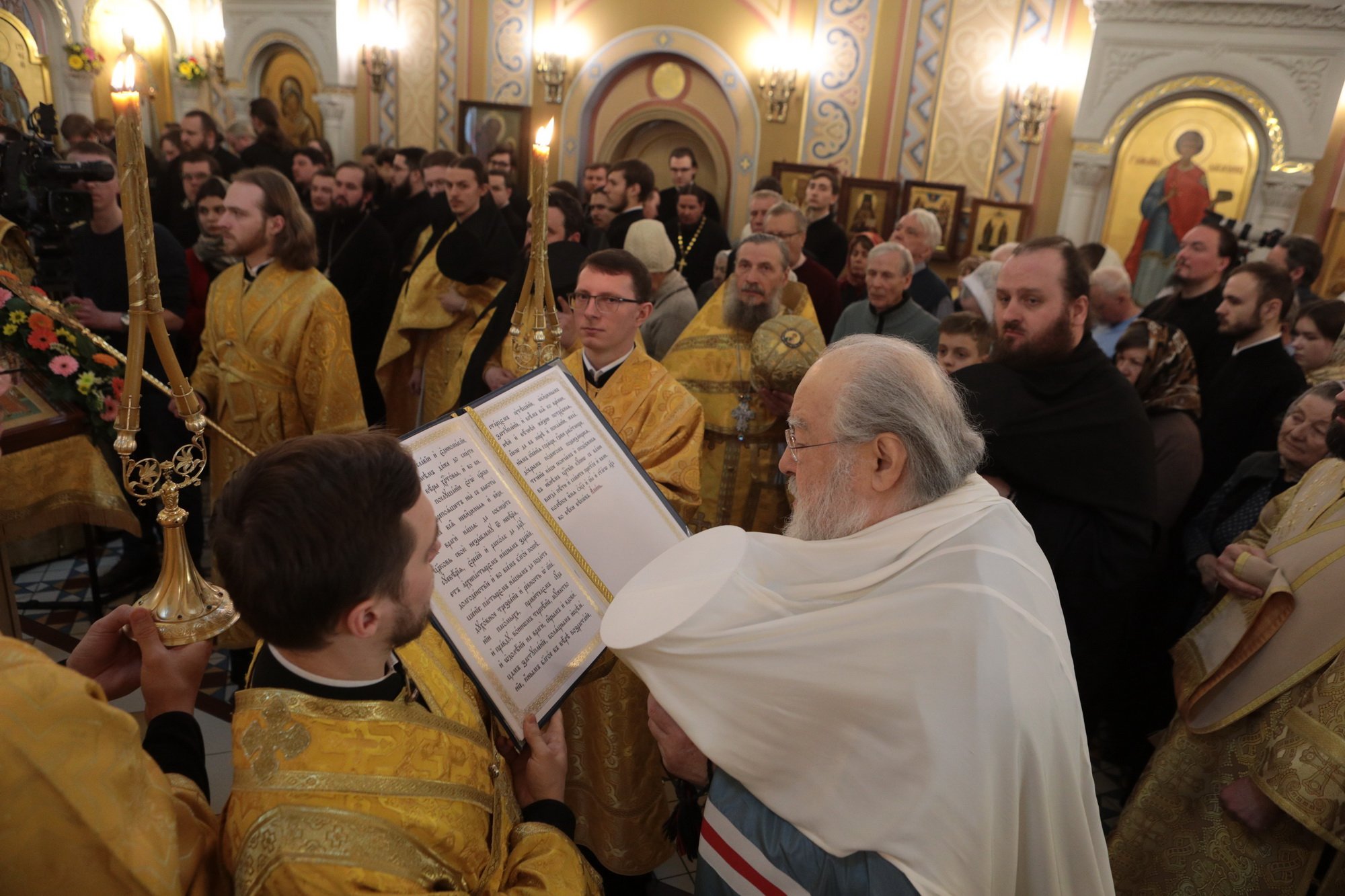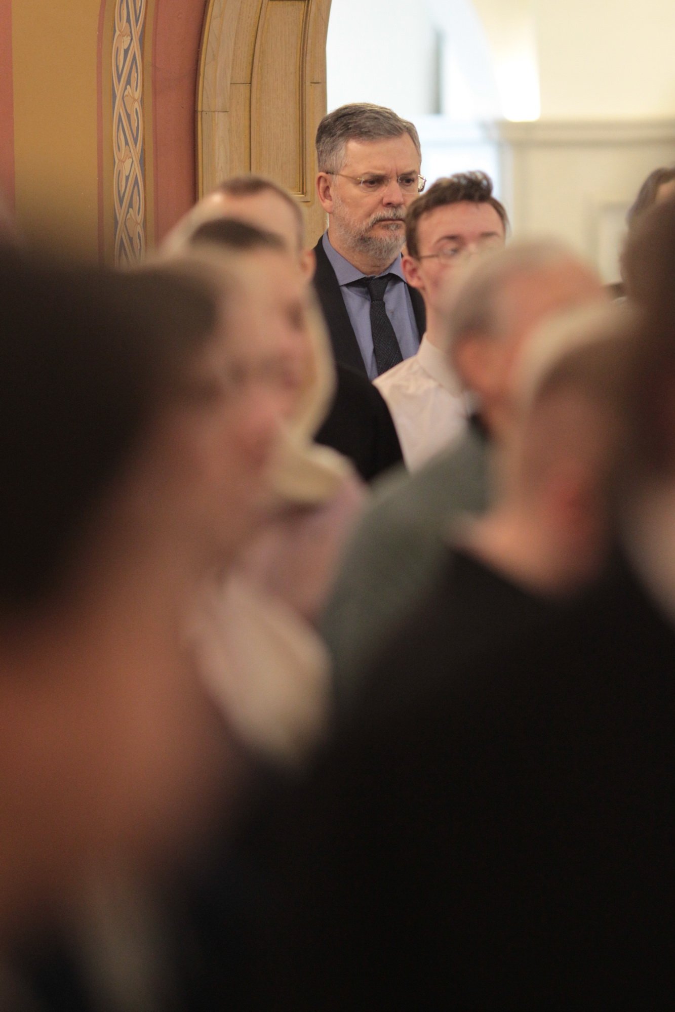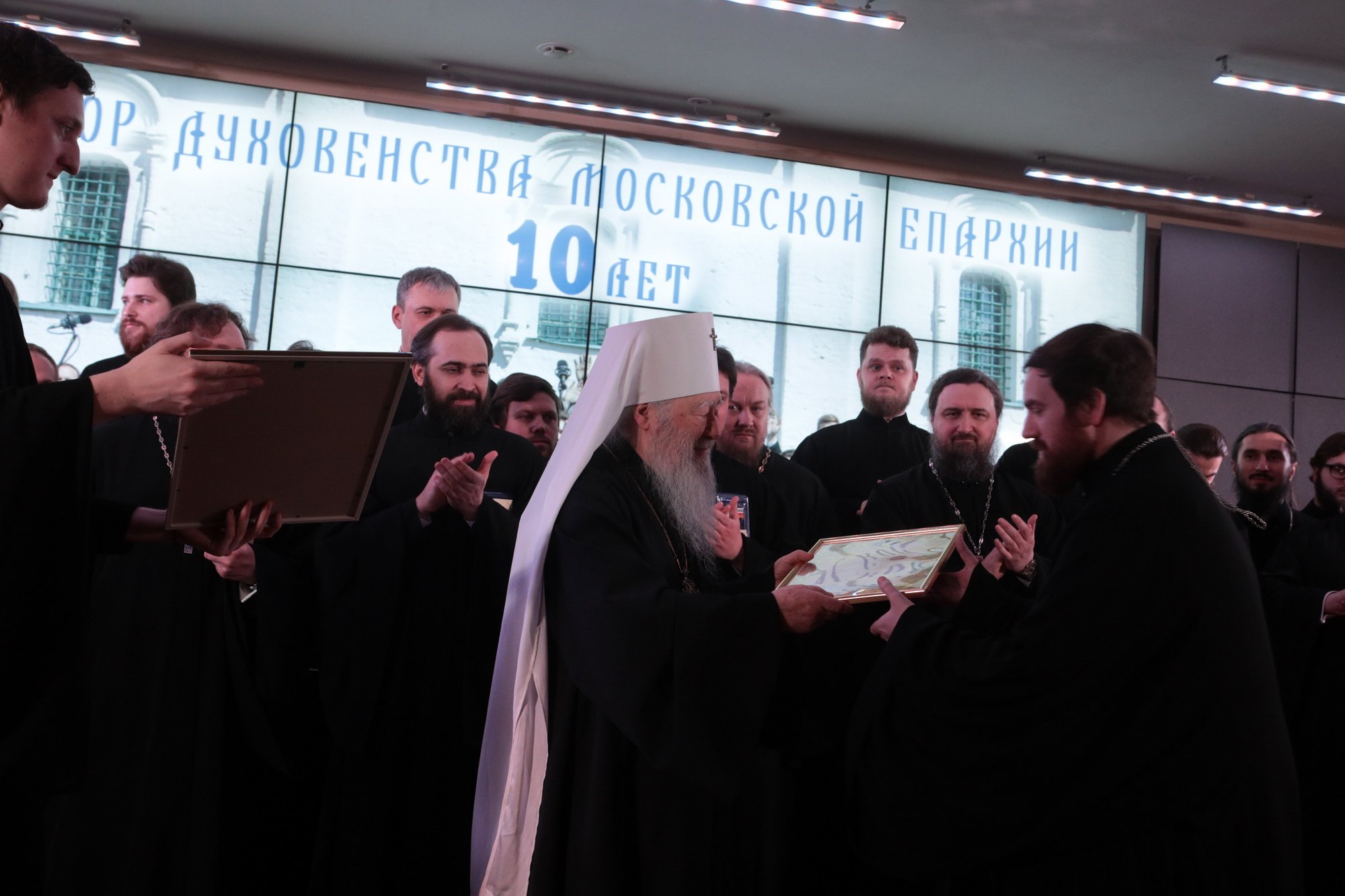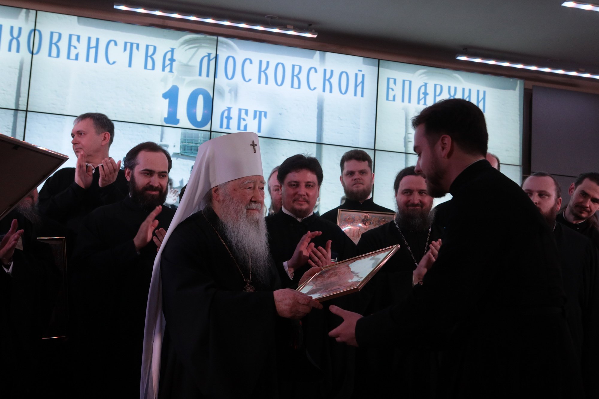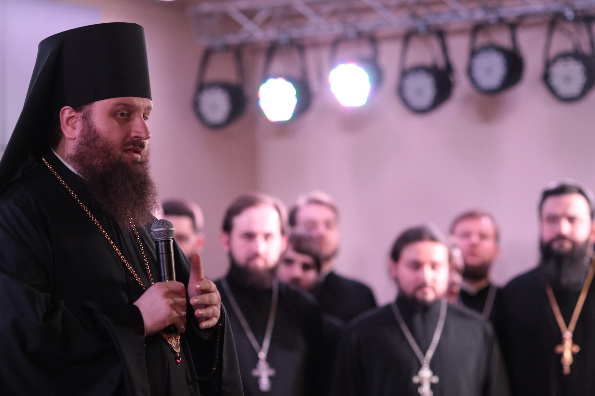 Дорогой Владыка Ювеналий, дорогой Владыка Петр, отцы, братья и сестры, я сердечно всех приветствую, поздравляю с престольным праздником и сегодняшним замечательным событием — 10-летием образования Хора духовенства Московской епархии. Когда мы говорим о церковном возрождении, то в первую очередь говорим о восстановлении порушенных святынь, строительстве храмов, открытии воскресных школ. Но церковное возрождение — это еще и возрождение церковного пения. На заре этого возрождения в Московской епархии появилось множество церковных хоров. Они были небольшие, даже если пели в городских храмах, и возникла необходимость создания большого епархиального хора. Четверть века назад, по благословению Владыки, трудами отца Николая и игумена Григория (Щелкунова) был создан хор студентов Коломенской духовной семинарии. Несмотря на небольшое число певчих и скромный репертуар, Владыка сразу стал выдвигать хор и на патриаршие, и на митрополичьи богослужения. Рубежной датой стало Рождество 1999 года, когда в Новодевичьем монастыре справа пел большой хор, а слева — семинарский хор, и, хотя на тот момент правый хор был сильнее, все понимали, что будущее за хором семинарским. К созданию Хора духовенства Московской епархии причастны иподиаконы Владыки Ювеналия. В 1990-х годах среди них оказалось несколько человек, которые имели опыт пения в хоре Троице-Сергиевой лавры под управлением архимандрита Матфея (Мормыля). Эти иподиаконы, я был в их числе, выступали несколько раз в телепередачах, пели на различных площадках и одновременно были иподиаконской командой. Был случай, который остался со мной на всю жизнь: в Страстную Пятницу в Новодевичьем монастыре половину службы пел правый хор, а половину — иподиаконы. Не все у нас получилось, но Владыка после службы сказал слова, которые остались со мной на всю жизнь: «Мне была важна ваша ревность, ваше усердие и желание». Когда в 2002 году я стал проректором по воспитательной работе, то одновременно возглавил хор. Хочу выразить большую благодарность игумену Петру (Пузенко), певчему хора, который в течение года успешно руководил хором семинарии.