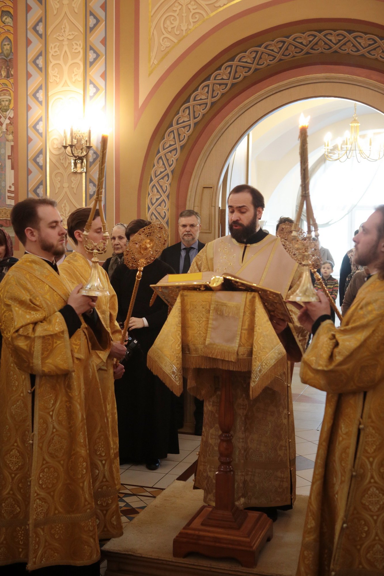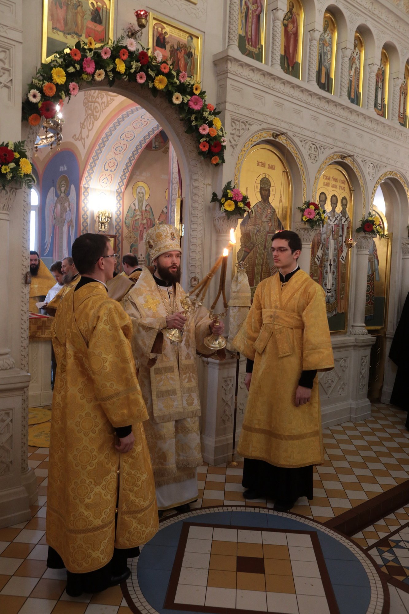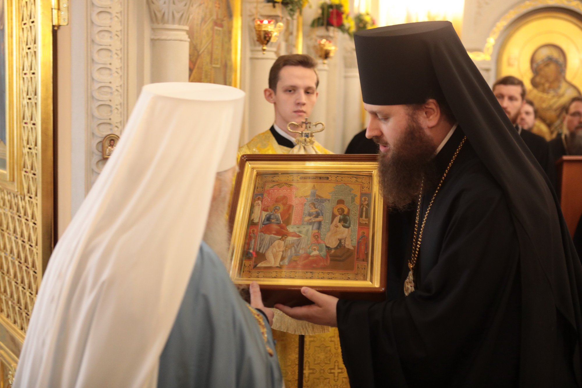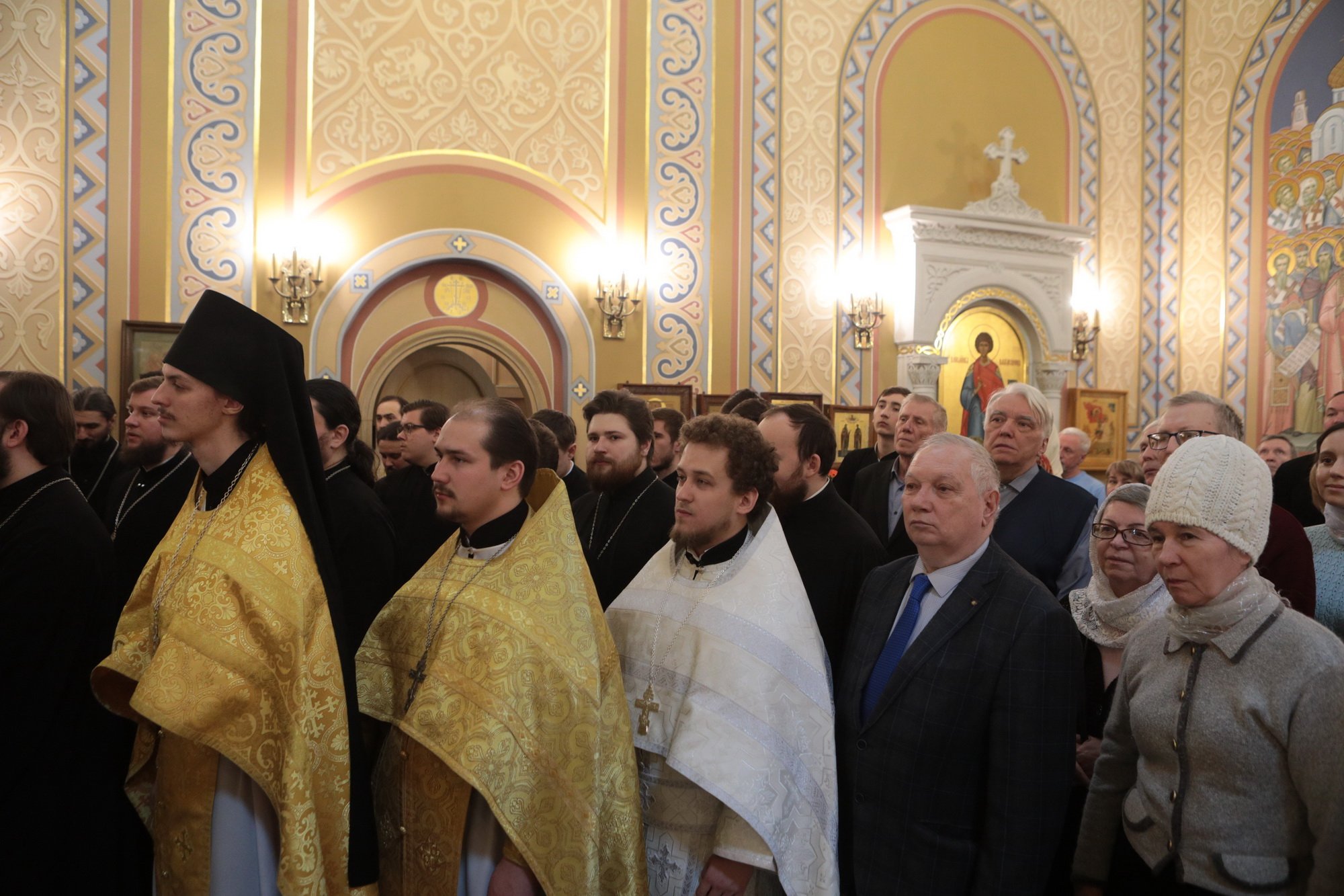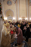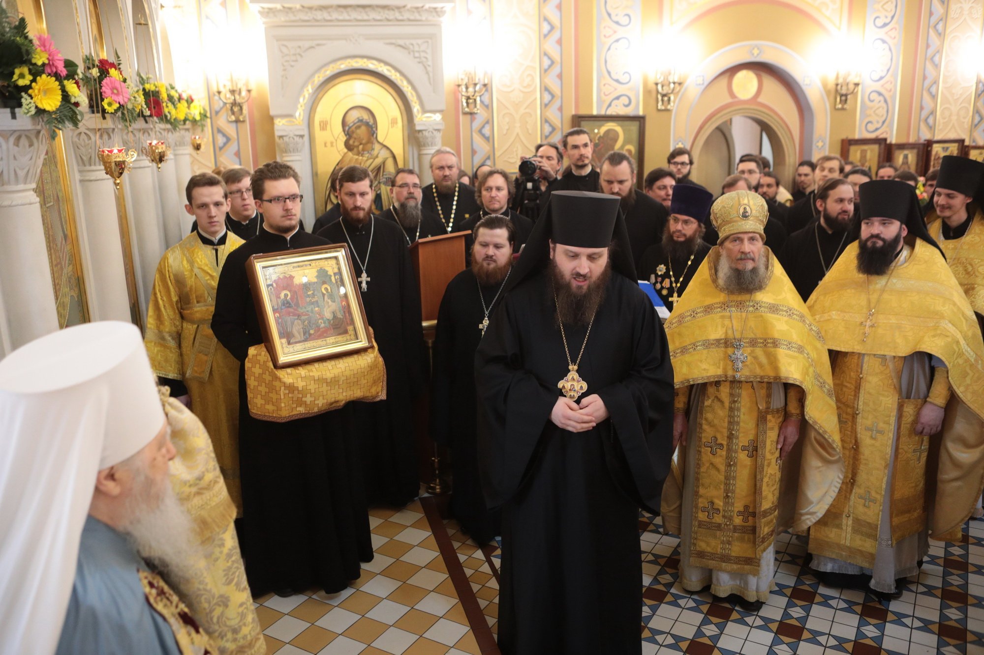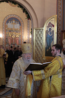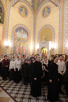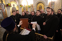 Ваше Высокопреосвященство, дорогой Владыка Ювеналий, наш Правящий архиерей и милостивый отец! Разрешите поздравить Вас и всех собравшихся с престольным праздником Трехсвятительского храма Коломенской духовной семинарии, — храма, который является чудом Божиим, построенным по любви к Богу и Церкви, любви к духовным школам Николая Александровича Цветкова и всех его соработников, благодаря трудам первого ректора семинарии отца Николая Качанкина. Храм, хотя и небольшой по размерам, исполняет важное церковное послушание. Каждый день утром и вечером в нем молятся и служат Божественные службы пастыри-студенты и будущие пастыри Церкви Христовой, которые вышли и еще выйдут из этого храма для служения в нашей Московской епархии. Дорогой Владыка, Вы благословили, чтобы этот храм был посвящен великим святителям — Василию Великому, Григорию Богослову и Иоанну Златоусту. Эти святые учат нас, пастырей и будущих пастырей, трем вещам: в первую очередь — жить по вере, потому что они были подвижники, истинные монахи, делатели заповедей Божиих. Они нас учат тому, как надо служить Богу и Церкви в любом сане и чине: они начинали с простых чинов, но двое из них стали Патриархами, а один — главой большой архиепископии. Они учат нас, что можно быть не только великими архиереями и благочестивыми людьми, но и богословами. Можно любить Церковь, слово Божие, церковное учение, можно любить это так, чтобы быть светильниками всему миру. Дорогой Владыка, поздравляя Вас с этим великим праздником, желаем Вам всесильной помощи Божией. Наш храм несет многие послушания, но одно из главных — певческое. В Коломенской семинарии существует свой студенческий хор, а из студенческого хора вырос Хор духовенства Московской епархии, который поет и за нашими богослужениями, и за патриаршими службами, и на больших церковных мероприятиях. А здесь, у нас, проходят спевки, ведь большинство певчих — либо наши выпускники, либо студенты, поэтому этот праздник и для епархии, и для семинарии, и для этого храма. Поздравляя Вас с двумя большими праздниками, просим принять от нас на память этот старинный образ Рождества Пресвятой Богородицы, чтобы Божия Матерь хранила Вас на всех путях жизни Вашей, а через нее Божия благодать изливалась на всех нас!