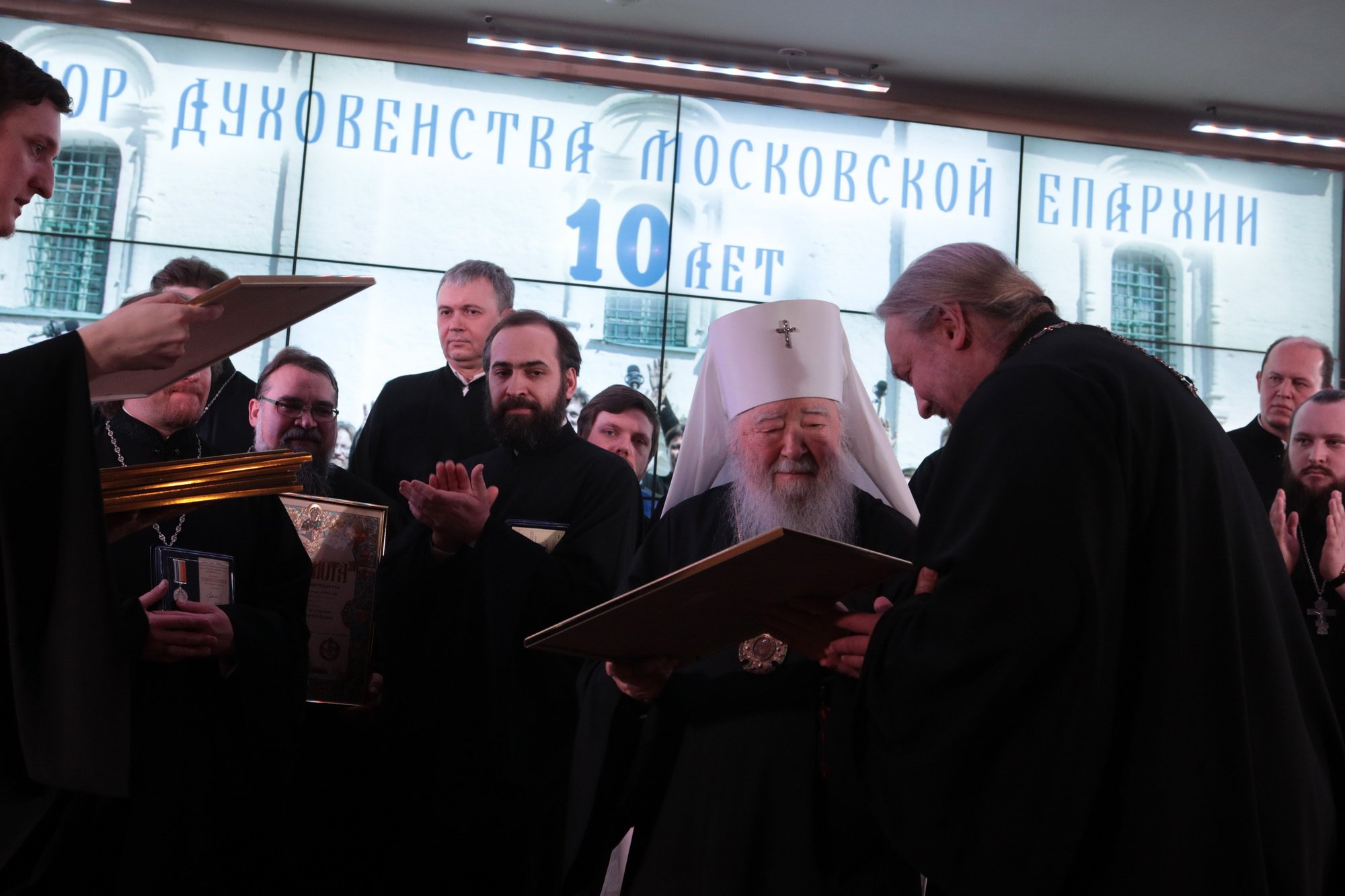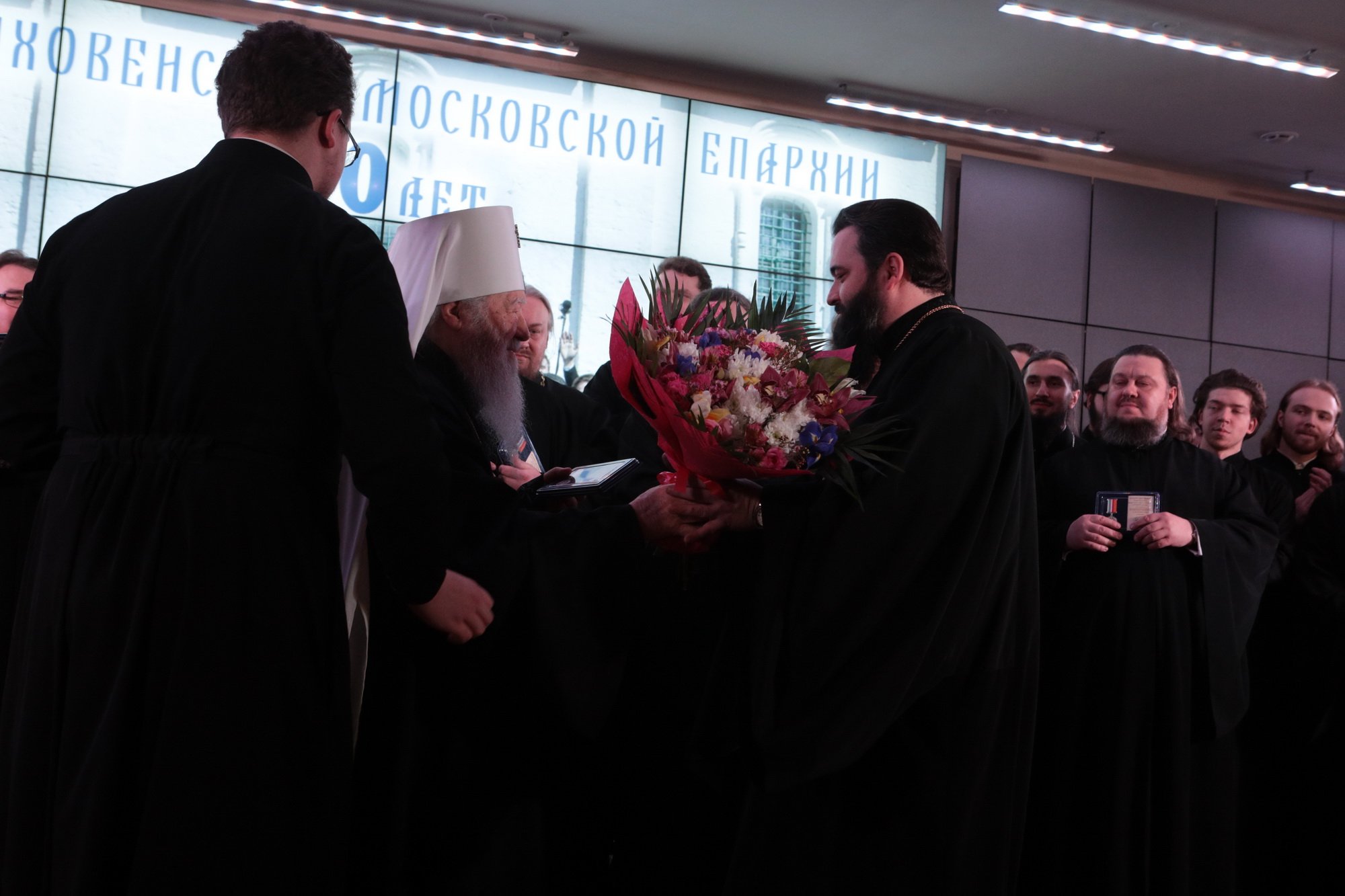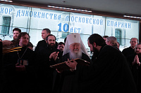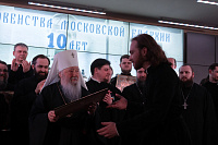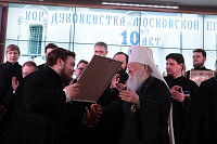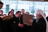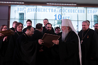 Владыка митрополит вручил епархиальные награды в связи с 10-летием образования Хора духовенства Московской епархии: епископу Зарайскому Константину и регенту хора священнику Сергию Голеву – медаль «За жертвенные труды» I степени; благочинному Богородского церковного округа, певчему Хора протоиерею Марку Ермолаеву – медаль «За жертвенные труды» II степени; игумену Петру (Пузенко), священникам Сергию Шкитырю, Димитрию Шмарову, диакону Василию Костеркину – медаль «За усердное служение» III степени; священнику Анатолию Трушину, протодиакону Сергию Трутневу, протодиакону Сергию Гайдашу, диакону Николаю Глухову – медаль «За жертвенные труды» III степени; певчим хора – свои Благословенные грамоты.
