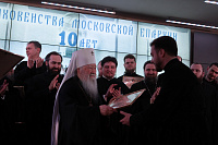 Во всем, что мы сейчас отмечаем, есть определенные символы. С детства я ходил в храм, и мне тогда глубоко запали слова Господа: «Созижду Церковь Мою и врата ада не одолеют ее» (Мф. 16:18). Потом, когда уже я почувствовал призвание к пастырству и поступил в семинарию, чтобы стать священником, летним днем во время каникул на одной из площадей Ярославля, моей родины, транслировалась другая речь, покойного ныне руководителя страны, который говорил: «Я вам покажу по телевидению последнего попа!» Это был другой голос, лжепророческий. По завершении каникул я поехал дальше учиться, и когда стал митрополитом Крутицким и Коломенским, принял Московскую епархию. Что здесь было? 132 храма, в основном в сельской местности, и ни одного монастыря на всю огромную Московскую область. Но что мы видим сегодня? Непреложность слов Основателя Церкви: «врата ада не одолеют ее». Церковь жива, и жива наша Московская епархия, вместо 132-х храмов сейчас уже до двух тысяч, множество монастырей и наша семинария. Я вспоминаю, как мы начинали: не было зданий, преподавателей, а была только добрая воля готовить будущих пастырей. И здесь, в Коломне, в полуразрушенном монастыре, начинали учиться будущие священники, и первым ректором духовного училища был отец Николай Качанкин. Я хотел бы, чтобы отец Николай поднялся сюда, я имею сердечную потребность выразить ему благодарность за то, что он мужественно и усердно возрождал традиции духовной школы, и в конце концов духовное училище было преобразовано в семинарию. Первые ростки нашего хора — это плоды трудов отца Николая. Я хотел бы вам, дорогой батюшка, преподнести эти благоухающие цветы, и вместе с присутствующими поблагодарить вас за всё. Господь посылал талантливых, усердных, идейных, мужественных людей, которые созидали в нашей семинарии церковный дух. Среди них был ректор семинарии, иеромонах, а ныне епископ Константин, который сегодня возглавляет эту духовную школу. Владыка Константин — одаренный человек: он продолжал регентское дело, создал прекрасный хор, а потом Господь послал нам другого «ангела-хранителя» — отца Сергия Голева. Он, как посланный от Бога человек, сотворил чудо: из людей, которые не собирались быть ни артистами, ни певцами, а только Богу служить, стать священниками, создал прекрасный профессиональный хор, который вышел за стены семинарии, стал епархиальным и получил известность за пределами Московской епархии.