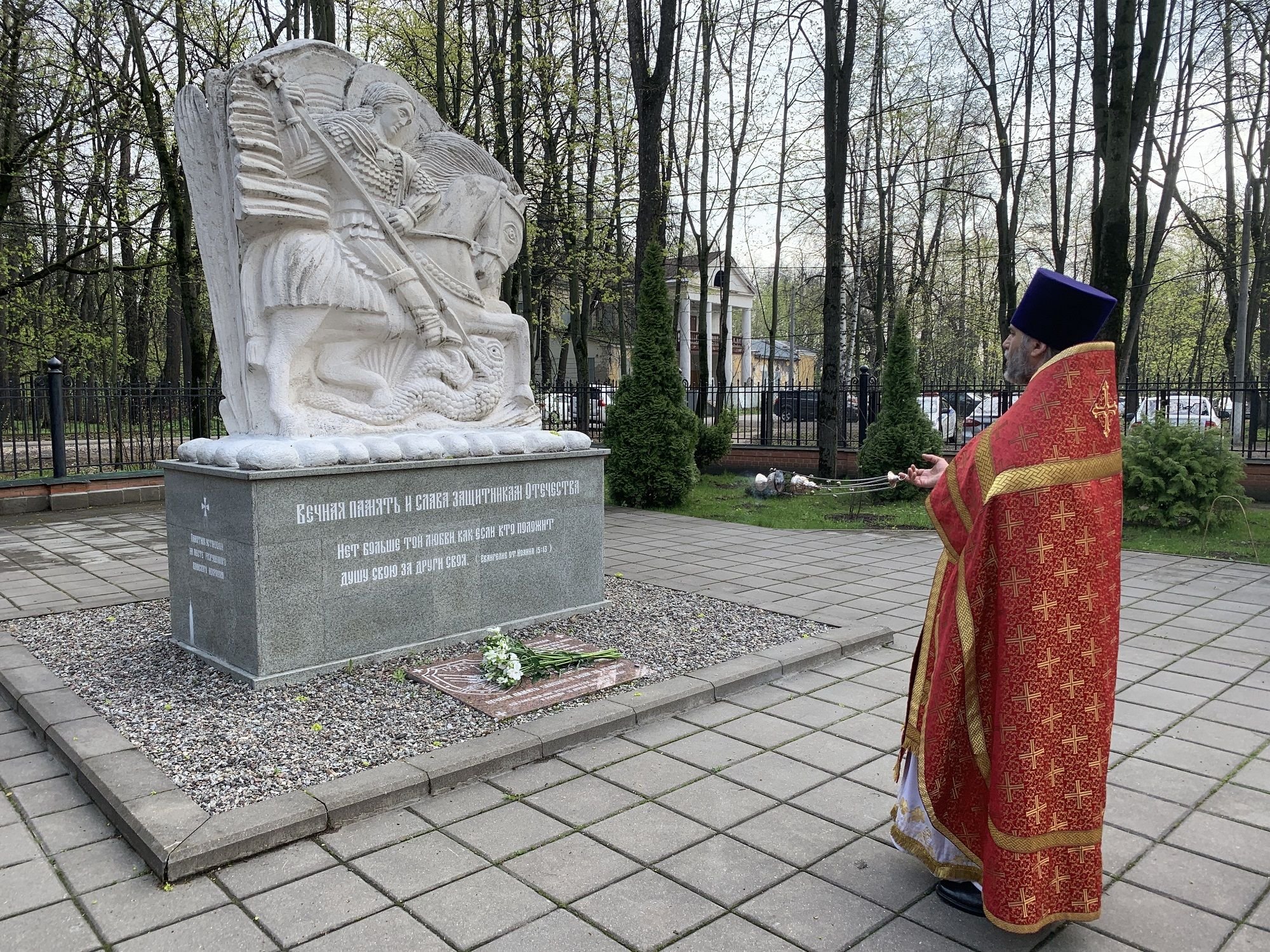 6 мая настоятель Знаменского храма г. Красногорска протоиерей Владимир Шафоростов совершил панихиду о воинах за веру и Отечество жизнь свою положивших у памятника защитникам Отечества, который расположен на территории храма.
