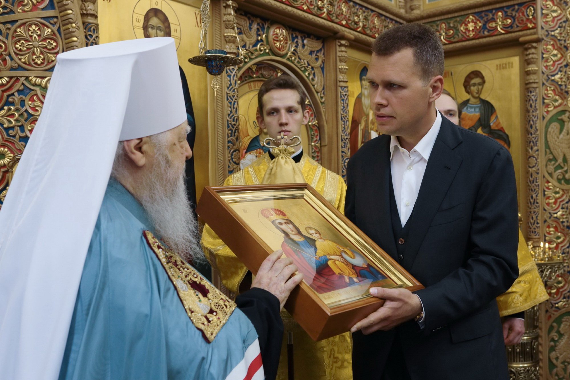 Я очень рад, что Господь меня сегодня привел снова к вам. Я вспоминаю, как два года назад мы освящали этот храм Божий и радуюсь, что он не пустует, что вы сегодня собрались на молитву. Мне хочется поблагодарить Никиту Юрьевича за то, что он в сердце своем имел благую мысль создать этот храм в честь своего дедушки Василия, который сегодня тоже именинник, и мы молились о упокоении его души. Никита Юрьевич большой деятель Московской области и благотворитель, и я хотел бы от лица Церкви поблагодарить Вас за все Ваши труды. Прошу Вас на молитвенную память принять от меня этот образ Богоматери. Пусть Царица Небесная хранит Вас в здравии на многая и благая лета!