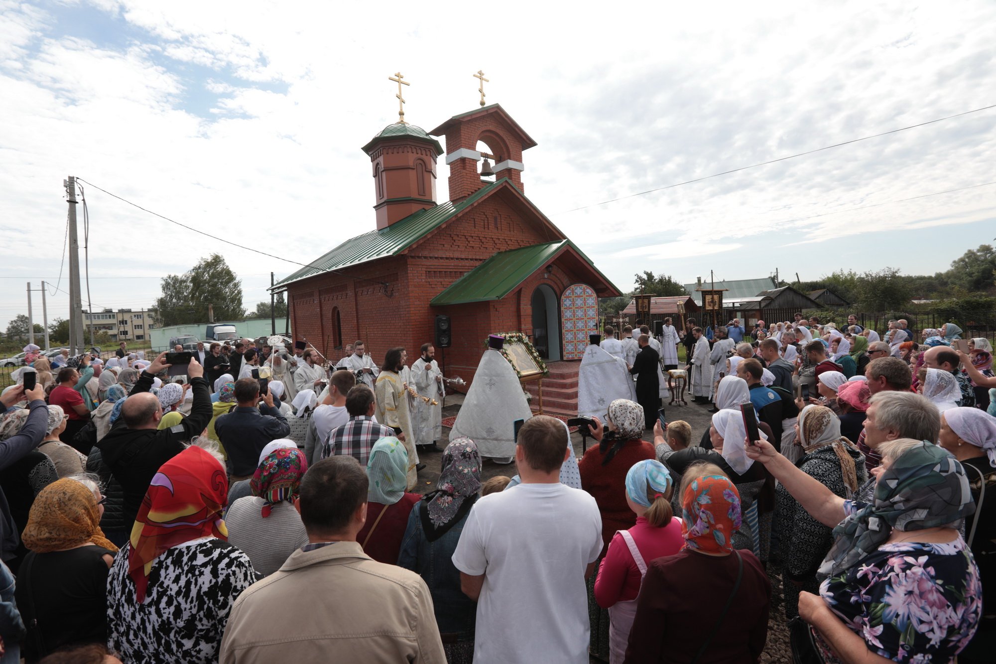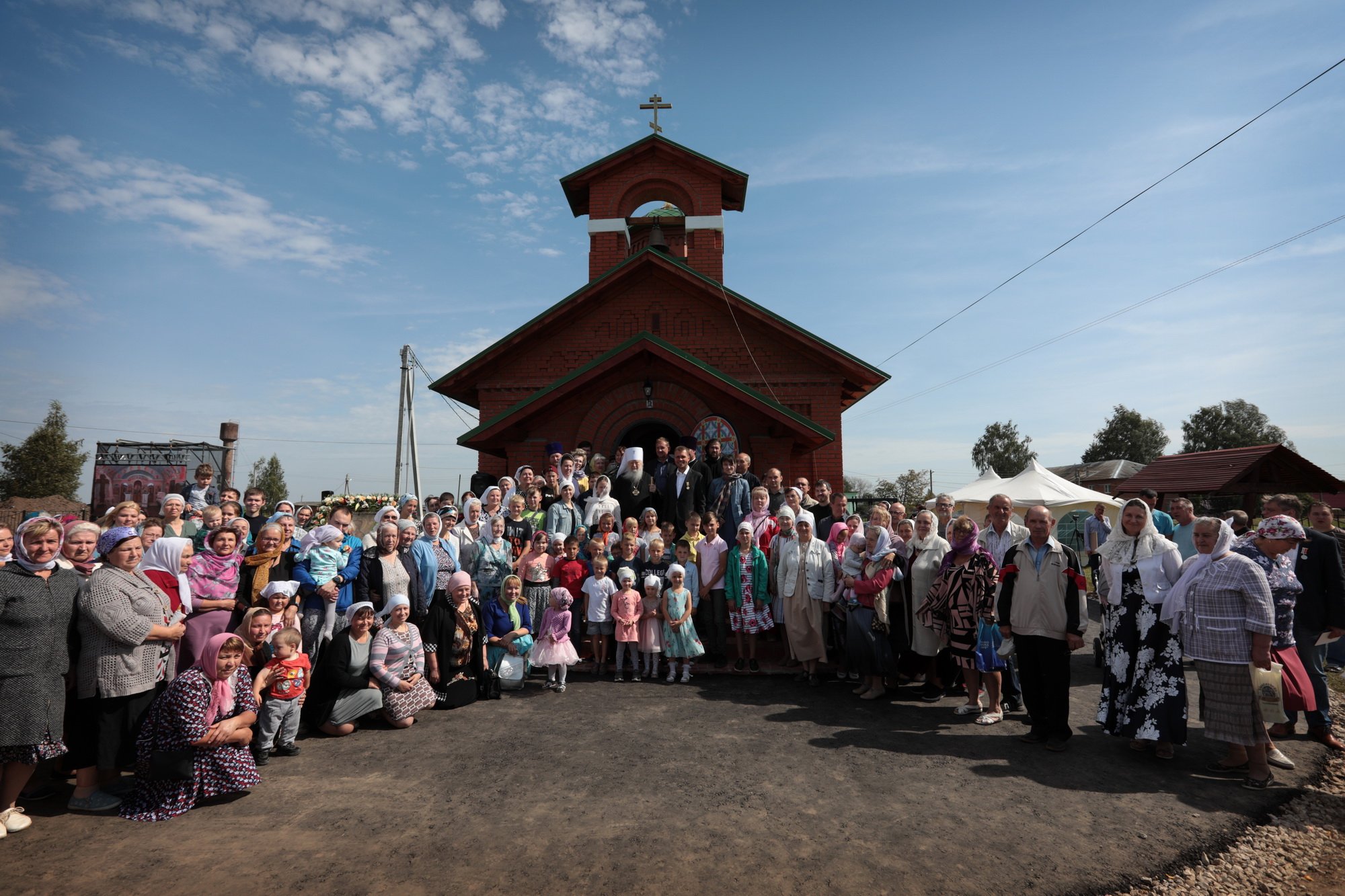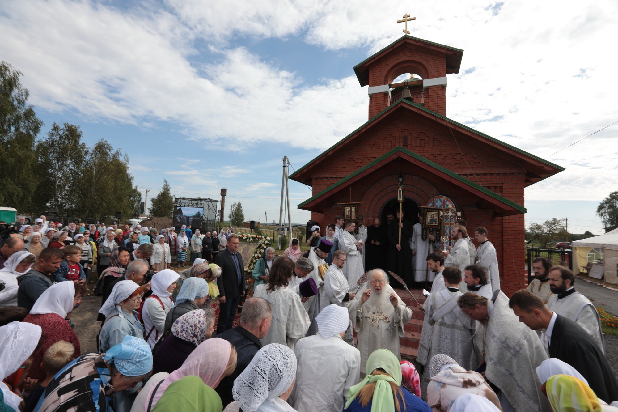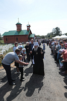 Каждый православный христианин надеется наследовать Царство Божие, и сегодняшнее Евангелие повествует о том, какие условия необходимо соблюсти, чтобы этого достичь. Один богатый юноша спрашивал Христа: «что сделать мне доброго, чтобы иметь жизнь вечную?» (Мф. 19:16) Христос ответил ему: «соблюди заповеди» (Мф. 19:17), —на что юноша отвечал, что все это он сохранил от юности. Тогда Христос ему говорит: «Если хочешь быть совершенным, пойди, продай имение твое и раздай нищим; и будешь иметь сокровище на небесах; и приходи и следуй за Мною» (Мф. 19:21). Что произошло с этим благочестивым юношей? Он «отошел с печалью» (Мф. 19:22), потому что был не в силах своим имением послужить бедным. Как радостно звучит это Евангелие сегодня, когда мы освящаем храм в честь Богоматери! Трудно было бы даже надеяться, чтобы жители этого села на свои средства смогли построить здесь храм. С уверенностью можно сказать, что вы, жертвователи, которые часть своего имущества отдали для храма и Бога, наследуете Царство Божие. Я поздравляю вас с праздником и благодарю за то, что у вас было желание отдать свои средства на возведение храма. Он будет памятником вашего благочестия, и пусть Господь всем вам воздаст по Своей милости! Конечно, невозможно по-человечески чем-то вам воздать, но у нас есть обычай награждать жертвователей и строителей, и поэтому я прошу огласить имена награжденных. А перед этим я хотел бы принести свой малый дар — святые сосуды для совершения Божественной литургии. Когда вы будете на них совершать Евхаристию, поминайте и мое недостоинство.