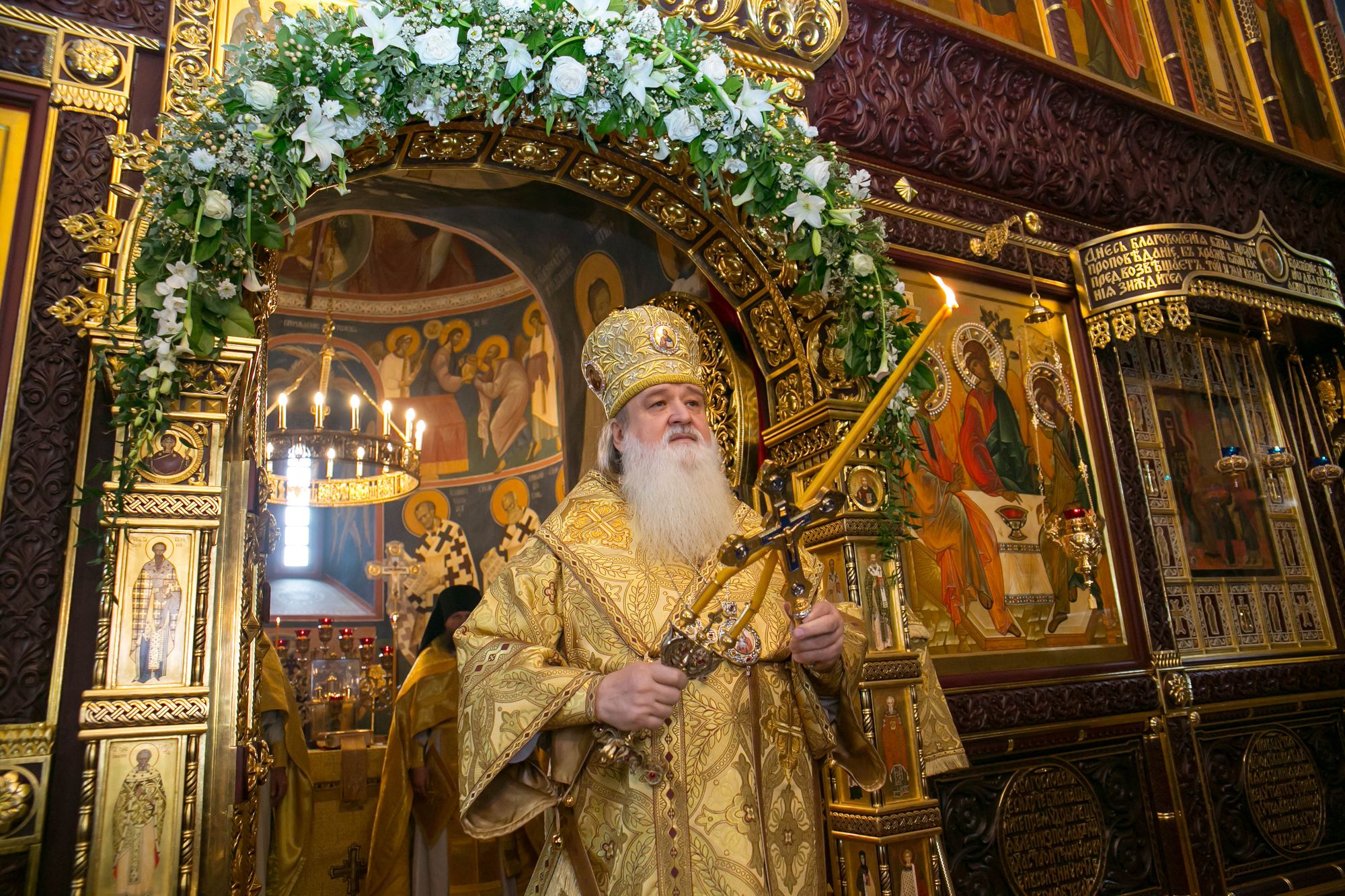 У святых врат обители епископа Романа встречали Р.В. Горбунов, депутат Московской областной думы А.Н. Царьков, руководители предприятий города. Во Введенском соборе епископ Роман совершил Литургию в сослужении благочинного монастырей Московской епархии игумена Евмения (Лагутина), благочинного Серпуховского округа священника Игоря Чабана, клириков Введенского Владычнего монастыря и Серпуховского благочиния. На богослужении пел хор сестер Владычнего монастыря под управлением игумении Алексии (Петровой).