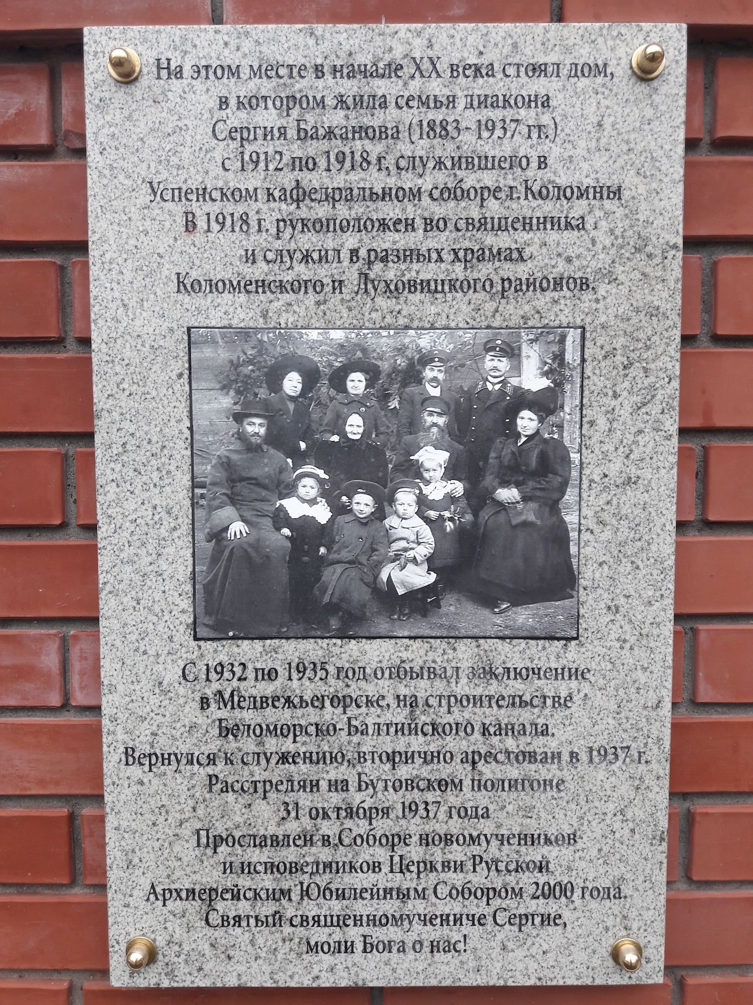 Священномученик Сергий Бажанов (1883-1937) – уроженец Коломенского края. Служил в местных причтах. В 1932-1935 гг. отбывал заключение на строительстве Беломоро-Балтийского канала. После повторного ареста расстрелян на Бутовском полигоне 31 октября 1937 г.