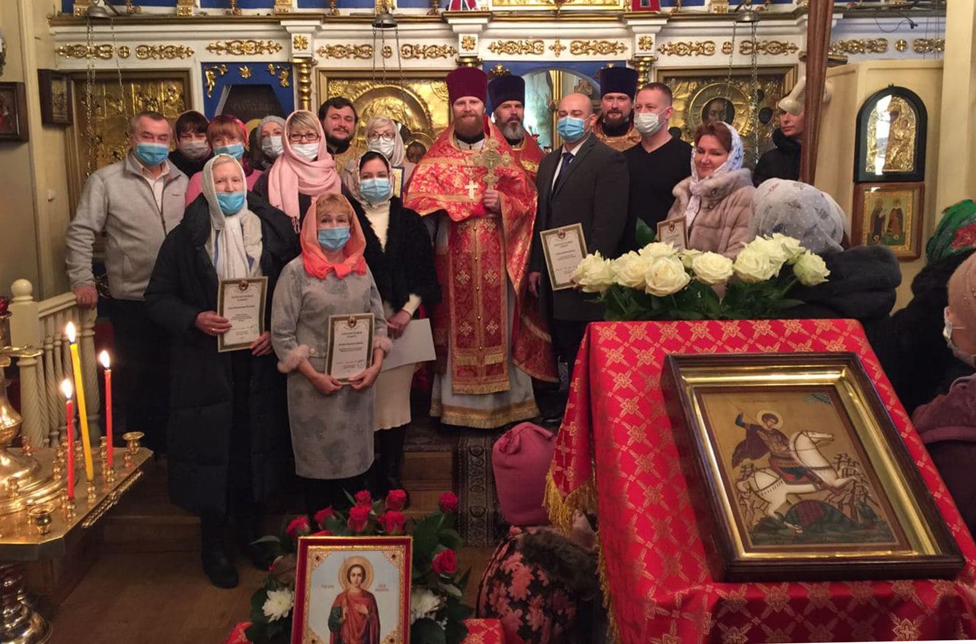 9 декабря в Георгиевском храме города Ивантеевки благочинный церквей Королёвского округа священник Димитрий Поповский вручил епархиальные грамоты сотрудникам медицинских учреждений и представителям социальных служб и организаций, несущим попечение о людях, заболевших коронавирусной инфекцией, и передал им благословение митрополита Ювеналия.