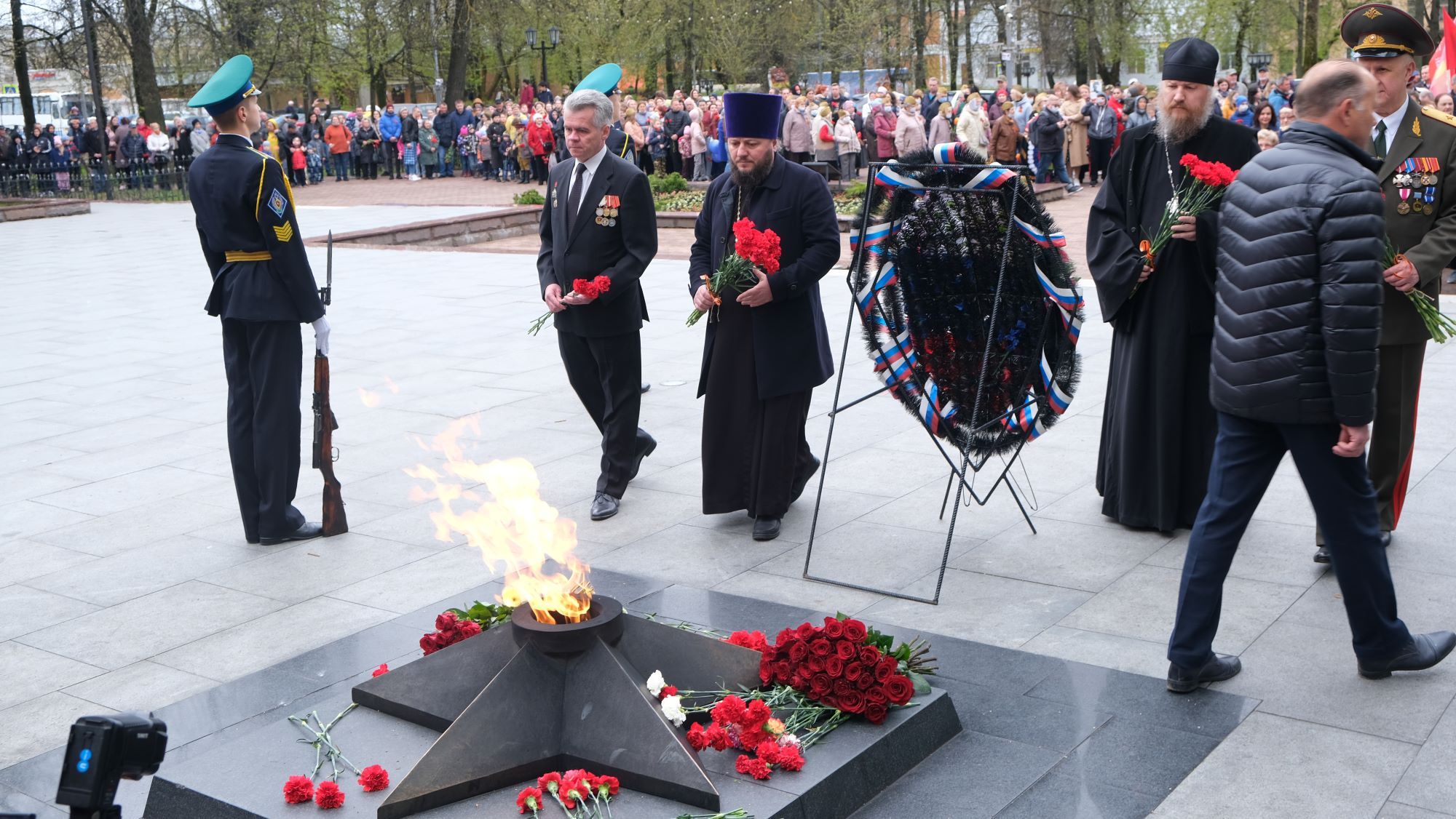 В тот же день настоятель Александро-Невского храма в посёлке санатория имени Герцена протоиерей Владислав Гусар принял участие в возложении цветов у мемориала Героев Великой Отечественной войны и на братской могиле погибших воинов, защищавших в 1941-1942 гг. рубежи рядом с поселком.